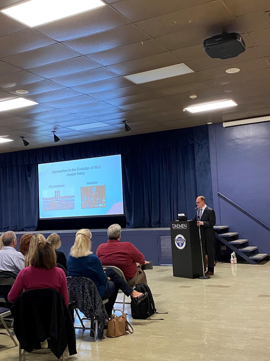 On November 9th, the 84th anniversary of Kristallnacht, 150 people attended the commemoration where Dr Michael Bryant of Bryant University presented his lecture, Malevolent Intentions and the Play of Circumstance: The Pogrom of November 1938 and Hitler’s Plan for the Jews. His presentation discussed the evolution of Nazi Jewish policy and he discussed the two forms of antisemitism - the antisemitism of reason and the antisemitism of emotion Earlier in the day Dr Bryant gave a lecture to students at Daemen University. The program was made possible by the generosity of the Wise Democracy Fund and co-sponsored by the HRC, Robert H Jackson Center, Global Studies Department at Daemen University, JCC, Academy for Human Rights and the Anne Frank Project