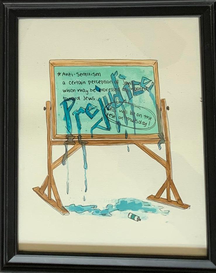 “Prejudice is spray painted over the board in graffiti This is a representation of the education students receive about antisemitism and the idea that systematic issues are never truly addressed. It is a metaphor for vandalism of human dignity.