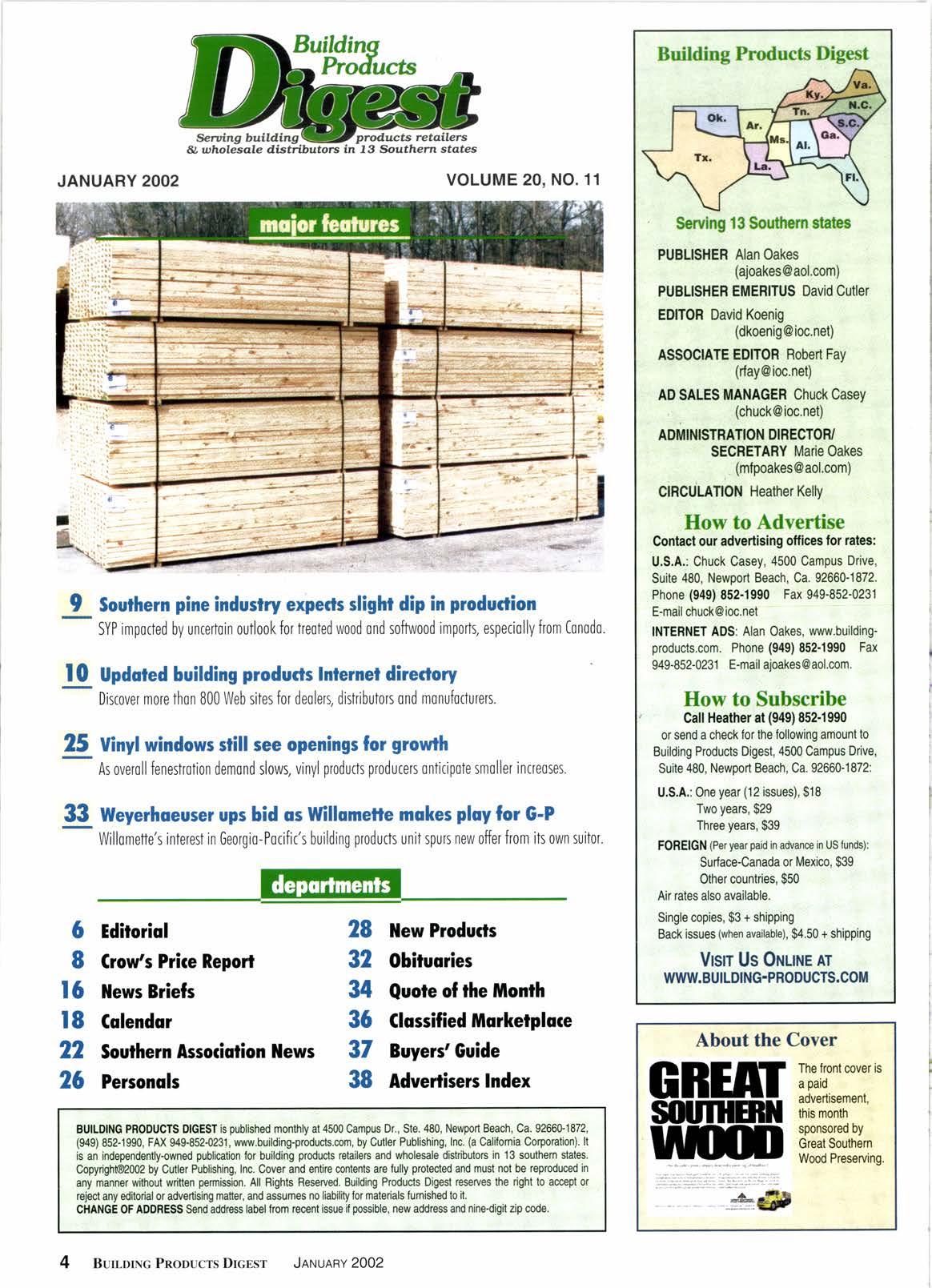 Seruing auildingnrodrrcts retoilerc SLruholesole distributors in I3 Southern stctes JANUARY 2OO2 voLUME 20. NO.11 Soulhern pine industry expecfs sligh dip in produclion