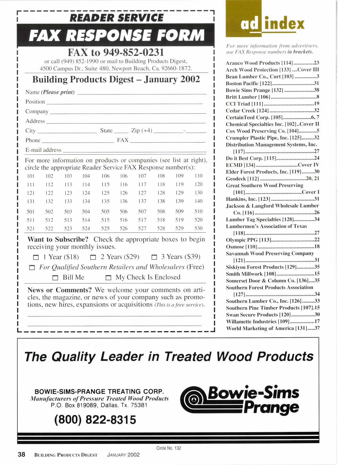 index The Quality Leader in Treated Wood Producfs BOWIE.SIMS.PRANGE TREATING CORP. Manufacturers of Pressure Treated lVood Products P.O. Box 819089. Dallas, Tx. 75381 Bowb-Sims (800) 822-9315 fusrye 38 Burr,uNc Pnooucrs DTcEST Jnxuanv 2002 Circle No. 132