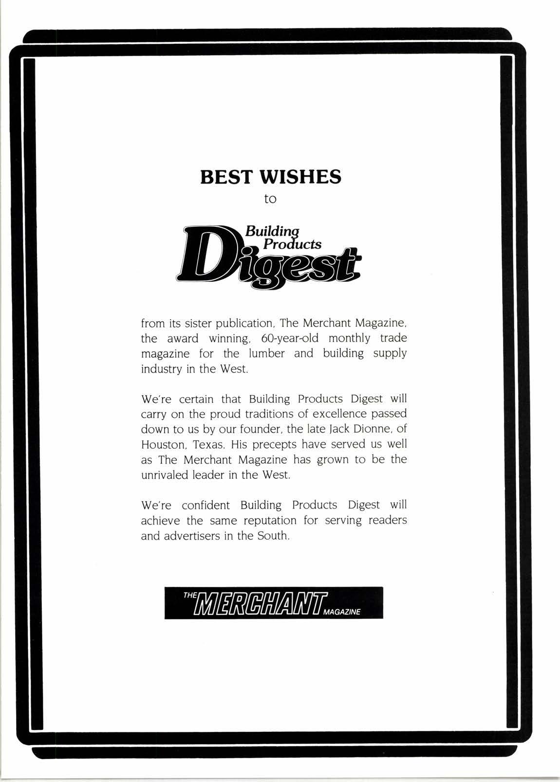 We're certain that Building Products Digest will carry on the proud traditions of excellence passed down to us by our founder, the late Jack Dionne, of Houston, Texas. His precepts have served us well as The Merchant Magazine has grown to be the unrivaled leader in the West.