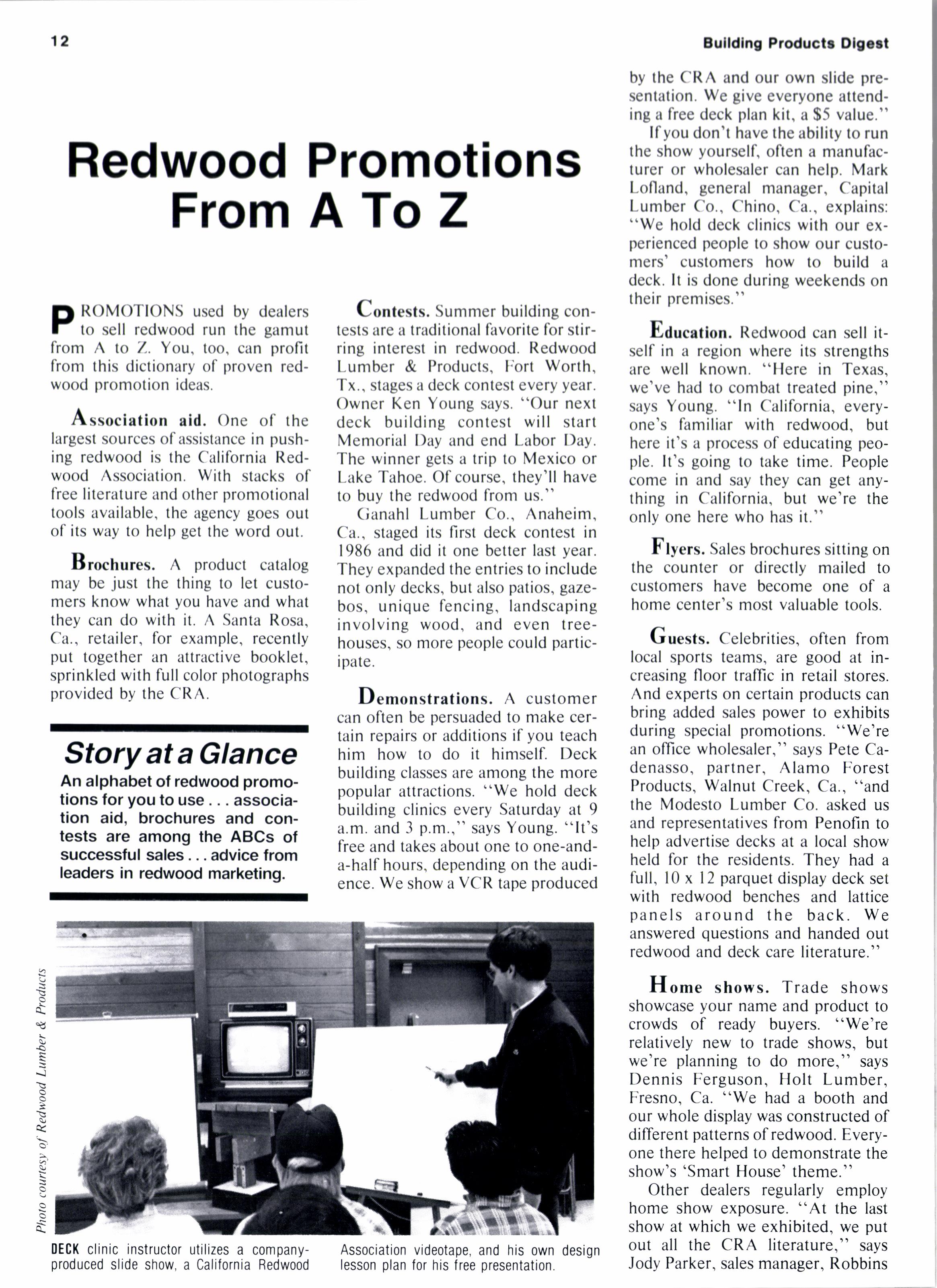 UARCH |988 YOLUTE 7, No. I Redwood Speclal lsrue Westlake Forms Florida Division, Opens New Unit 7 Redwood ls The Product To Sell For "Other" Jobs I Displays You Can Build To lmprove Redwood Sales I O D-l-Y Projects Can Sell Lots Of Redwood Lumber | | ABCs of Redwood Promotion Pay Off In More Sales | 2 Texas Firm Sells Redwood To Southern Markets | 3 Redwood Supplies Continue To Grow, Meet Needs l4 Arkansas Dealer Adds 2 Units To Growing Chain | 9 Deck Contests: A Proven Way To Sell Redwood 38 Manufacturer Pulls Out All Stops For Decking 39 Hechinger Starts New Headquarters Construction 40 Calendar 20 Classified 37 Advertisers Index 40 Editorial 6 News Briefs | 6 Home Center Merchant 22 Arkansas & Okla. 24 Texas Topics 24 Oklahoma Notes 25 Southeastern Scene 26 Operating Opportunities 27 Personals 2A New Products 30 New Literature 36 Obituaries 40 Bulldlng Producb Dlgort