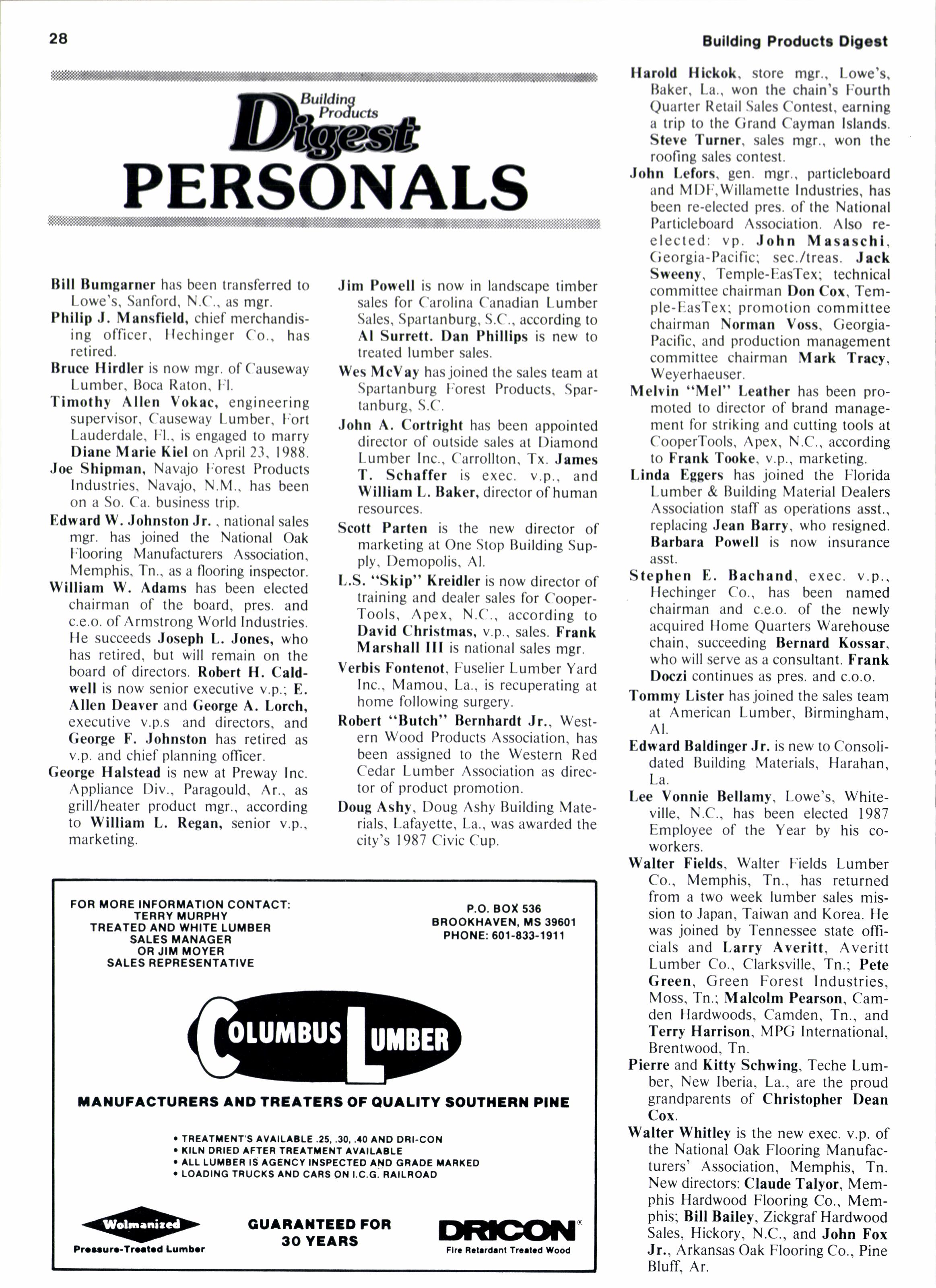 1988, Cutler Publishing, Inc. Cover and entire contents are fully protected and must not be reproduced in any manner without written permission. Building Products Digest assumes no liability for materials furnished