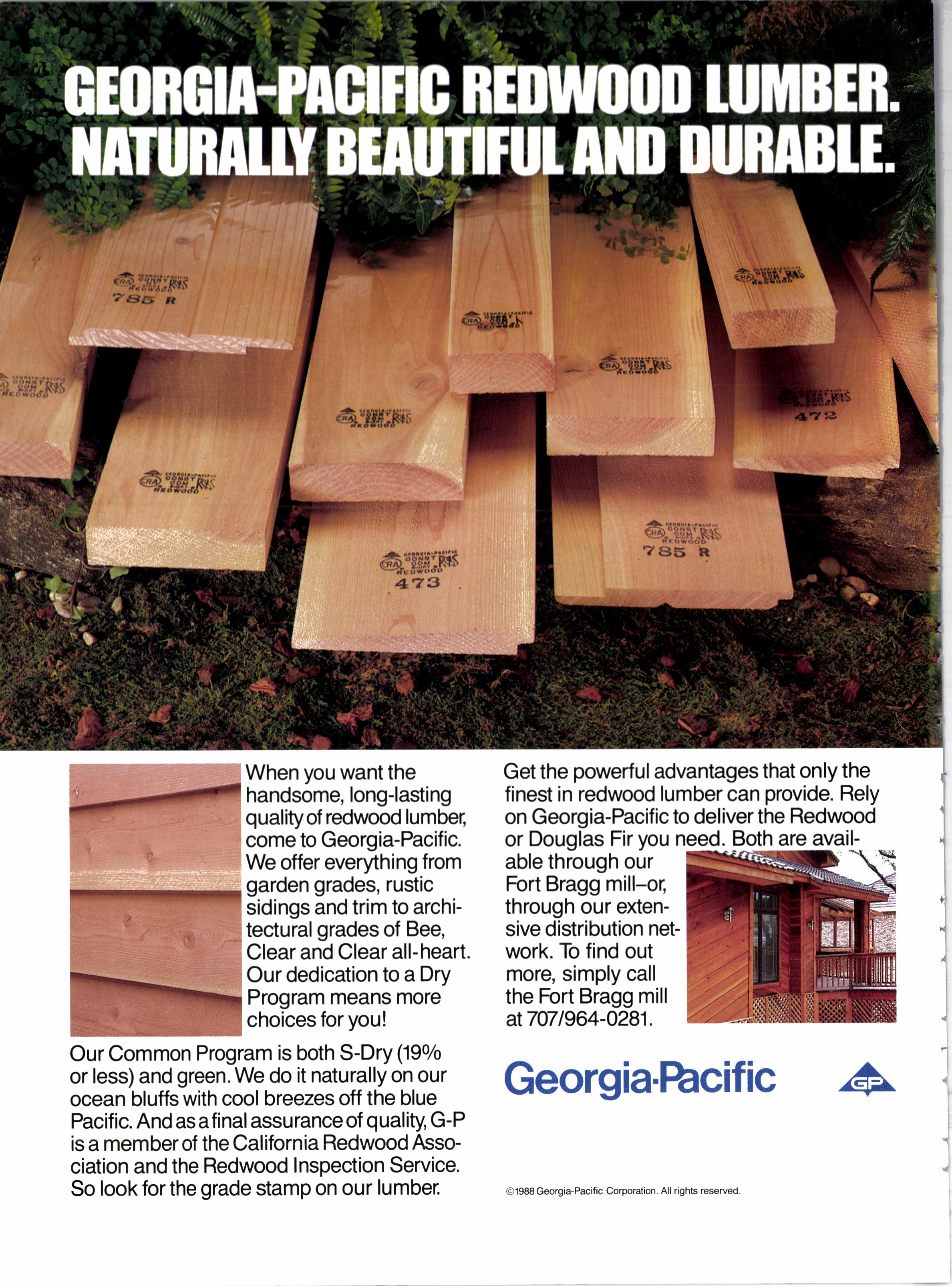 Get the powerful advantages that only the finest in redwood lumber can provide. Rely on Georgia-Pacific to deliver the Redwood or Douglas Fir you need. Both are available through our Fort Bragg mill-ol through our extensive distribution network. To find out more, simply call the Fort Bragg mill at7071964-0281.