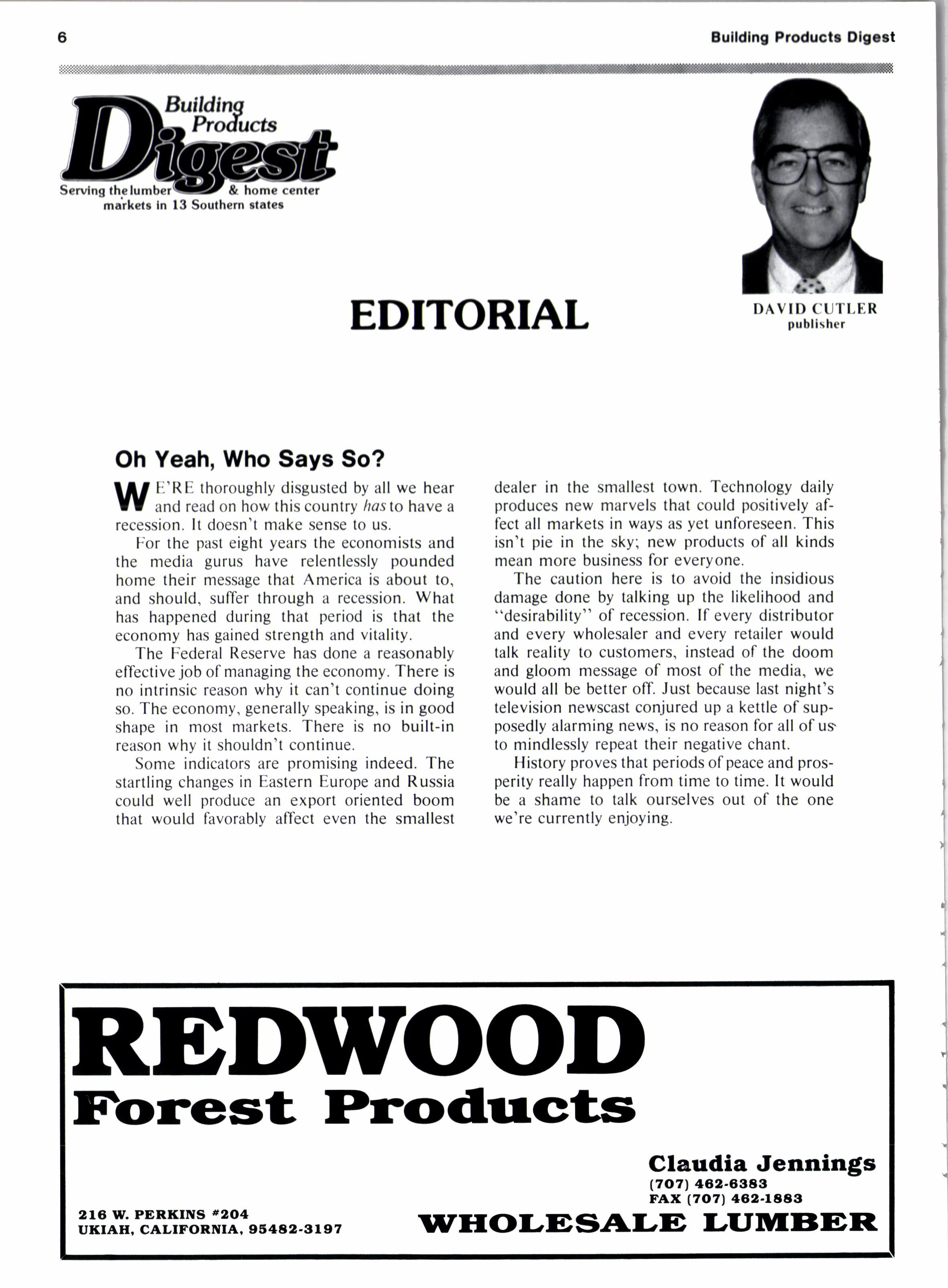 9 ro l2 14 t5 2l 24 26 38 40 Calendar | 9 Classified 37 Advertisers Index 40 Editorial 6 News Briefs l6 Home Center Merchant 20 Operating Opportunities 22 Southern Assn. News 25 Copyrighto 1990, Cutler Publishing, Inc. Cover and entire contents are fully protected and must not be reproduced in any manner without written permission. All Rights Reserved. Building Products Digest {ssumes no liability for materials lurnished to it. markctr ln l3 Southcrn riater