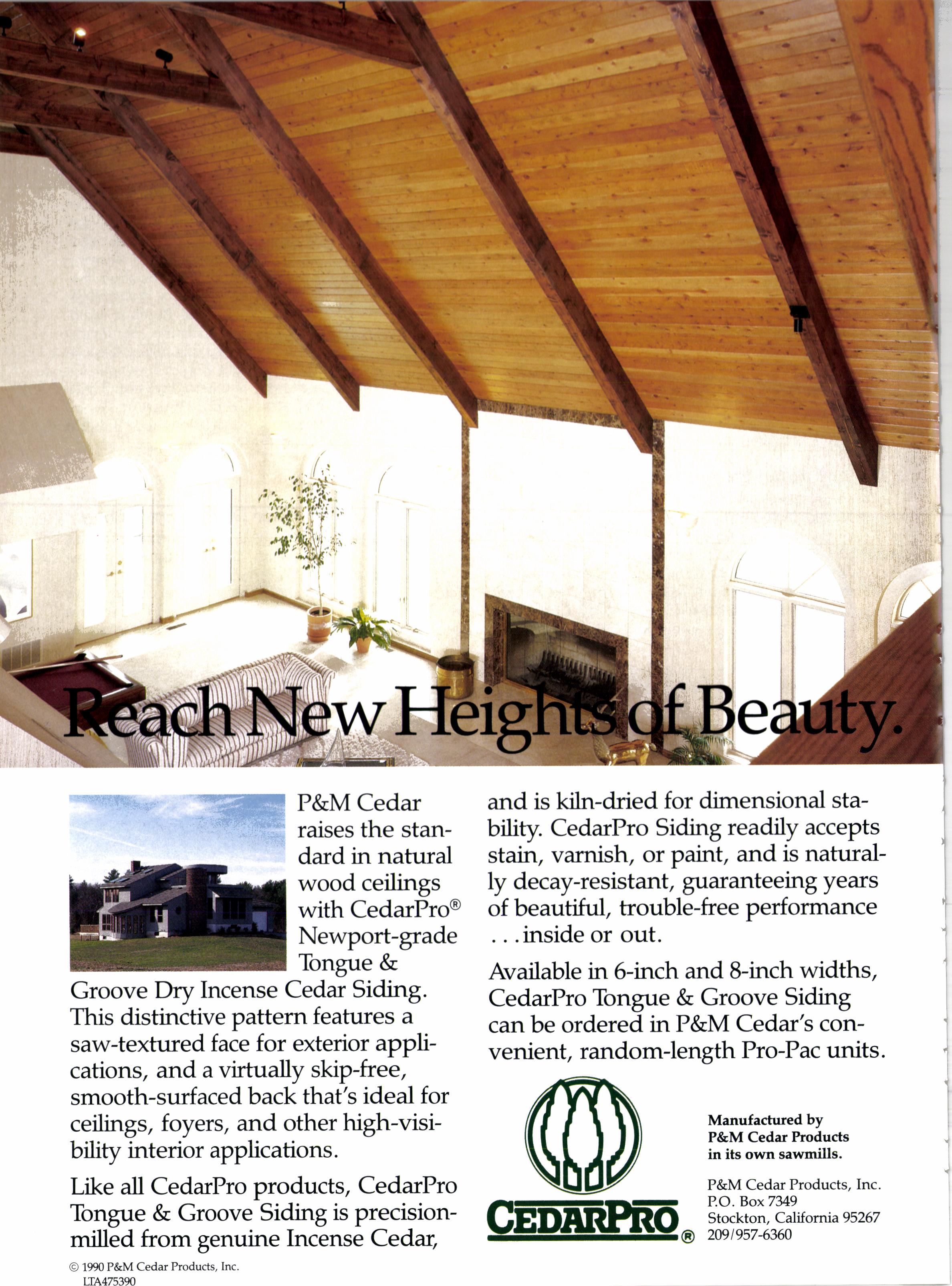 P&M Cedar raises the standard in natural wood ceilings with CedarPro@ Newport-grade Tongue & Groove Dry Incense Cedar Siding. This distinctive pattern features a saw-textured face for exterior applications, and a virtually skip-free, smooth-surfaced back that's ideal for ceilings, foyers, and other high-visibility interior applications.
