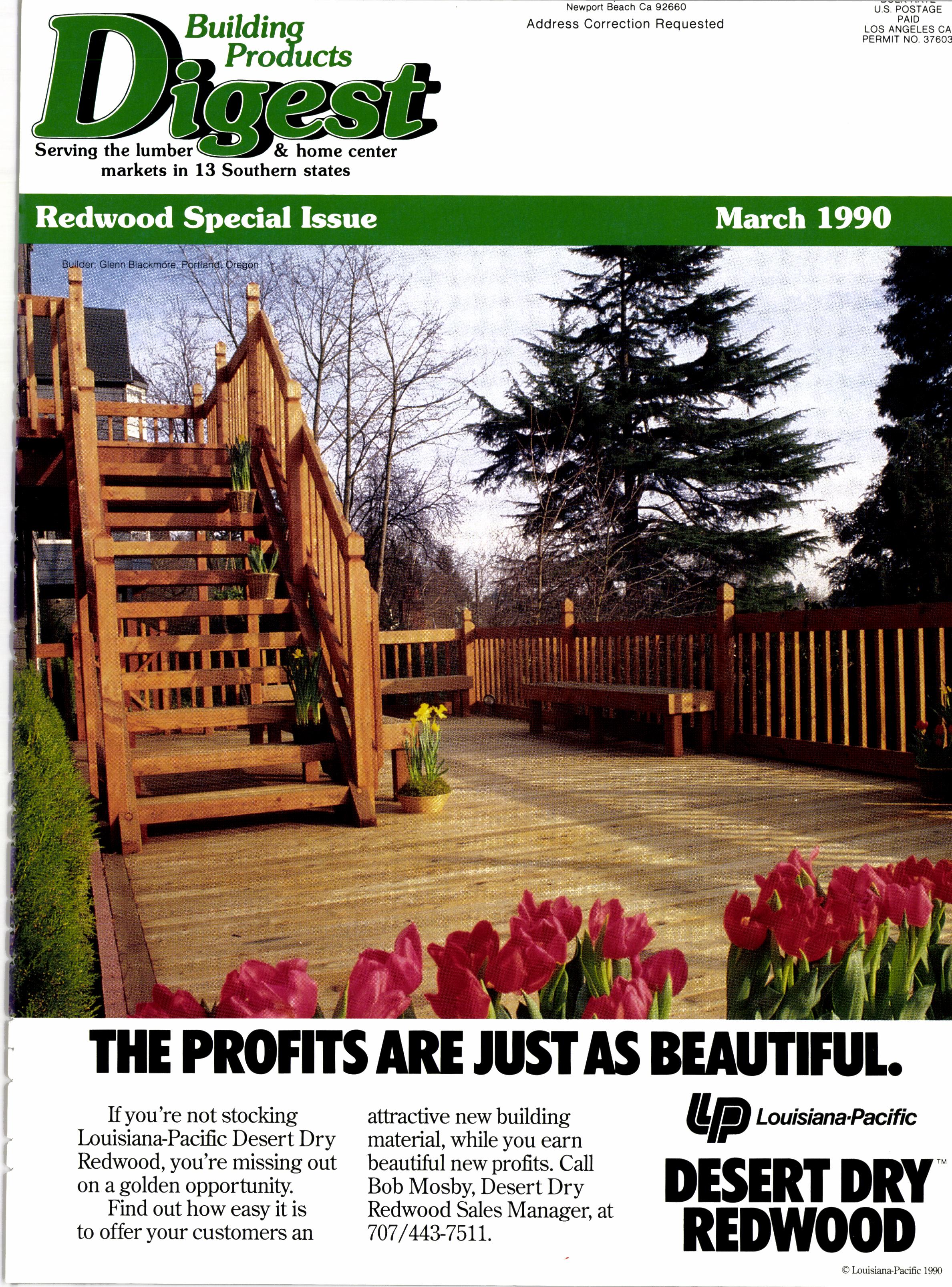 'ildinq Proi[ucts Address Correction Requested N€wport Beach Ca 92660 U.S. POSTAGE PAID LOS ANGELES CA PERMIT NO, 37603 markets in 13 Southern states THE PROFIISARE IU$AS BEAUTFUL If you're not stocking l,ouisiana-Pacific Desert Dry Redwood, you're missing out on a golden opporhrnity. Find out how easy it is to offeryour customers an atfractive newbuilding material, while you earn beautiful new profits. Call Bob Mosby, Desert Dry Redwood Sales Manager, at 707/443-75Lr. UIP Louisiana'Paciric DESERTDRYREDWOOD O Lpuisima-Pacific 1990