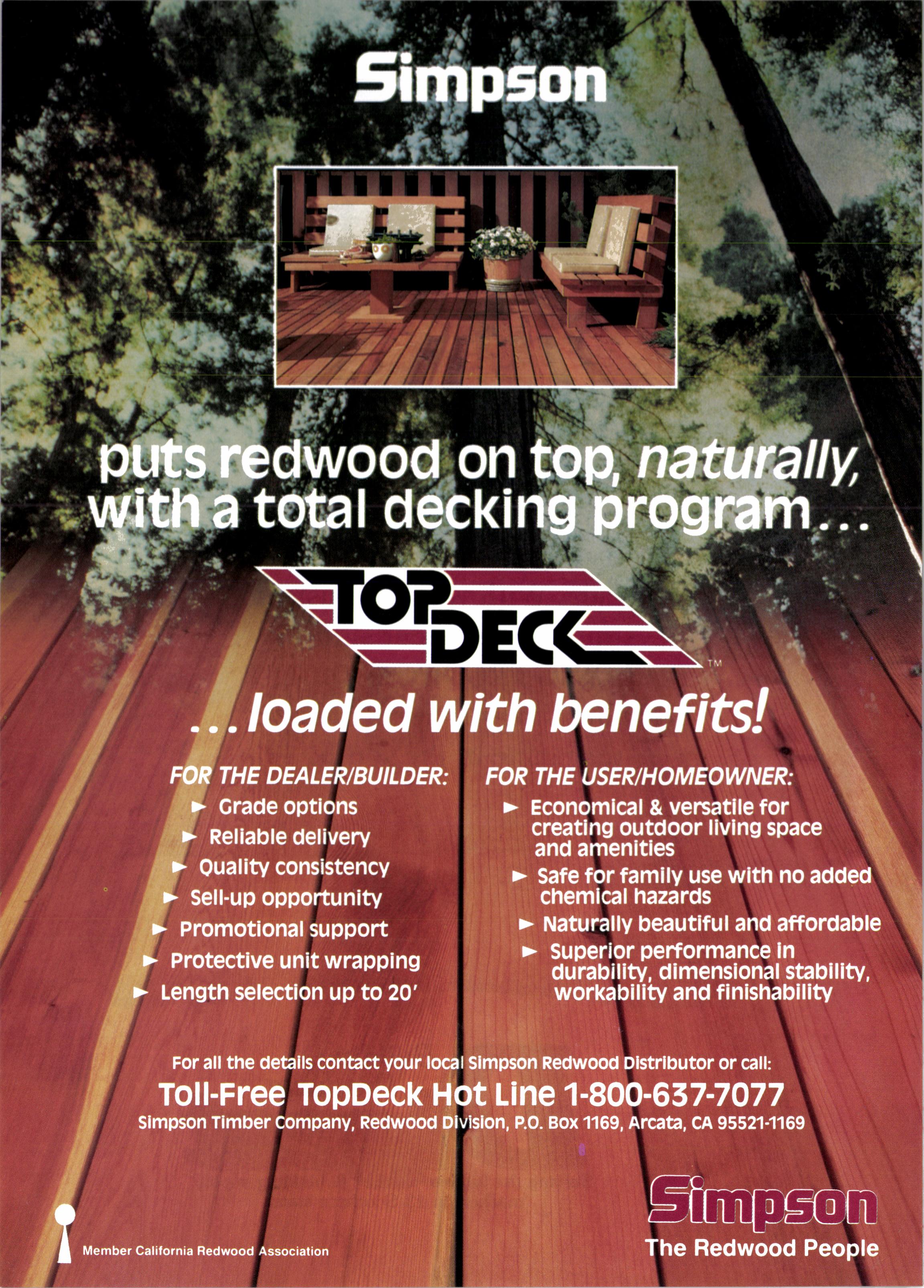 That's a lot of opportunity for sales to deck builders, remodeling contractors and do-it-yourselfers. Participating in the Califomia Redwood Associationl Home Mechanix deck contest is a way to increase store traffic and cash in on the perennial popularity of redwood decks.