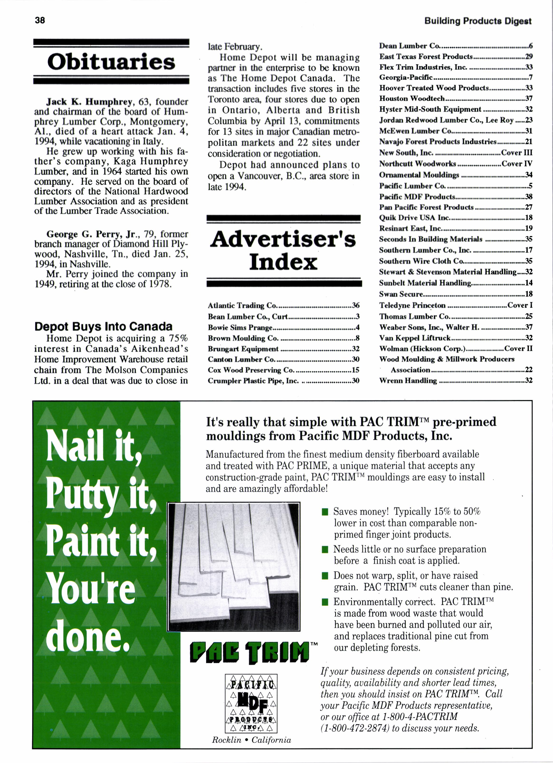 Jeck K. Humphrcy, 63, founder and chalrman of the board of Humphrey Lumber Corp., Montgomery, Al., died of a heart attack Jan. 4, 1994, while vacationing'in ltaly.
