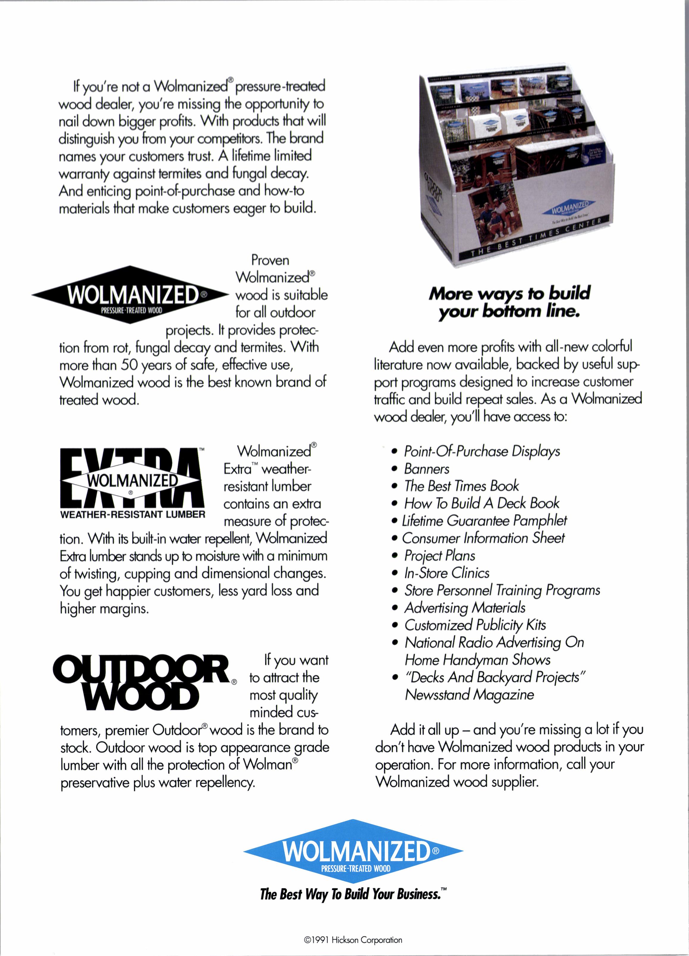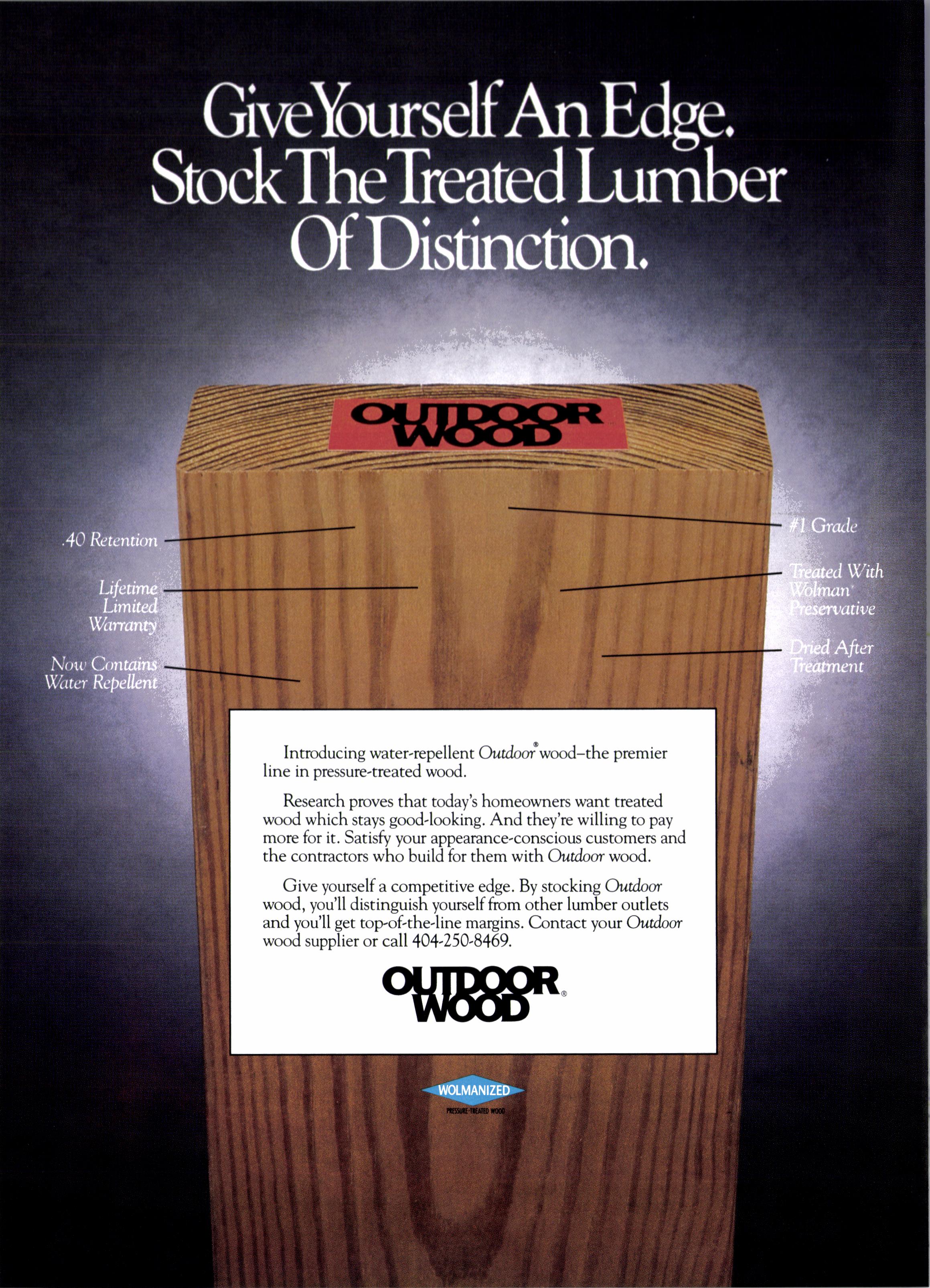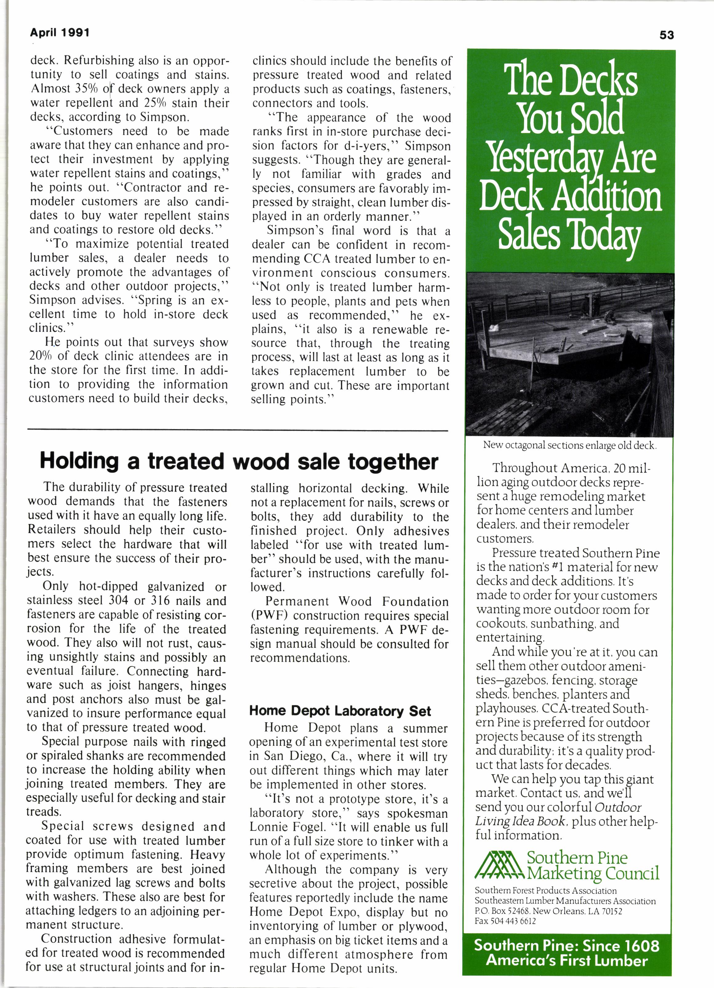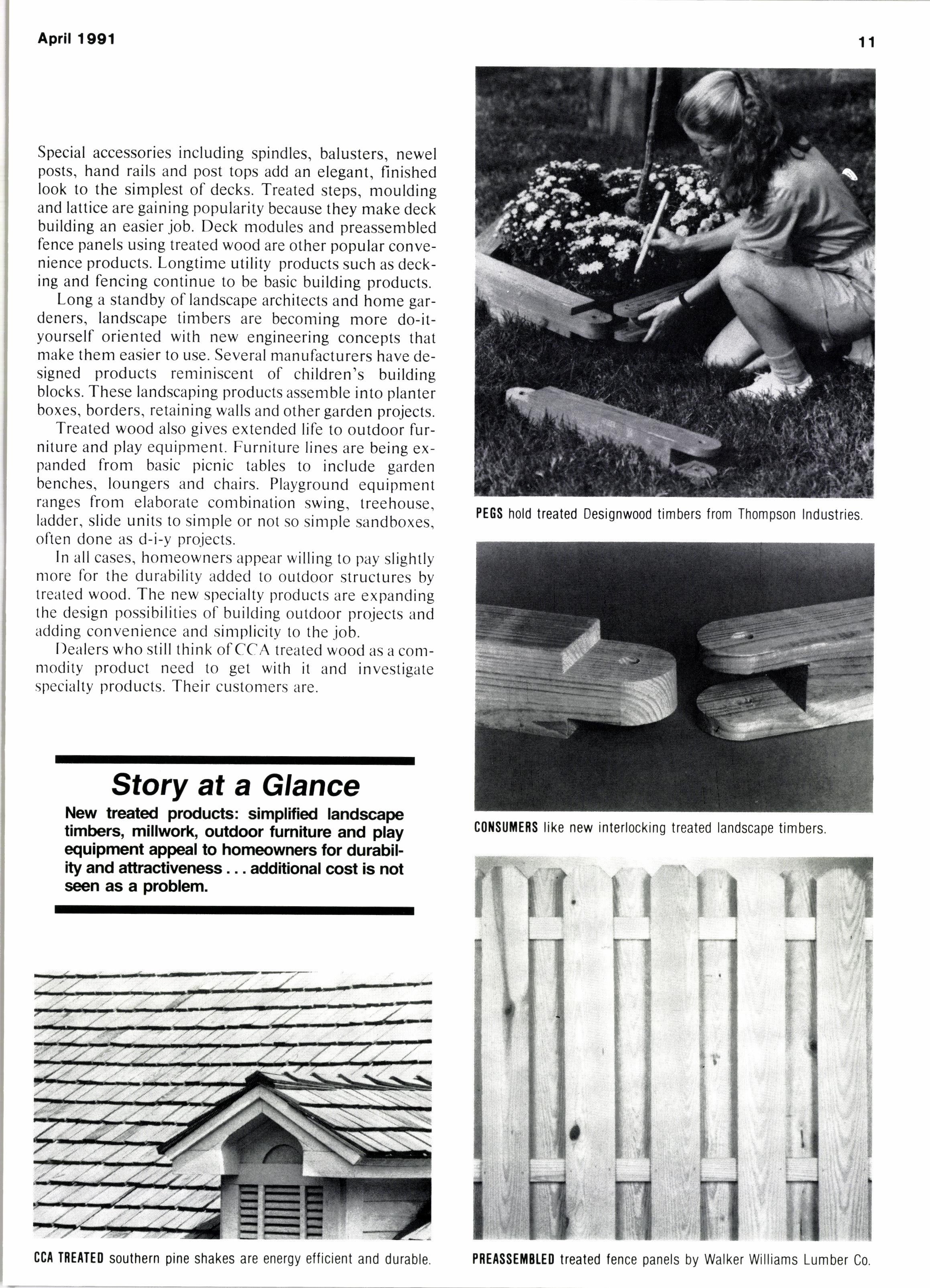 He also suggests that since most treated wood customers are repeat buyers, sales can be increased by providing ideas for additional outdoor projects, Decks are by no means your only opportunity for treated wood sales, he stresses. Treated wood is ideal for fences, benches, tables, gazebos, recreational projects, pool decks and landscaping.
