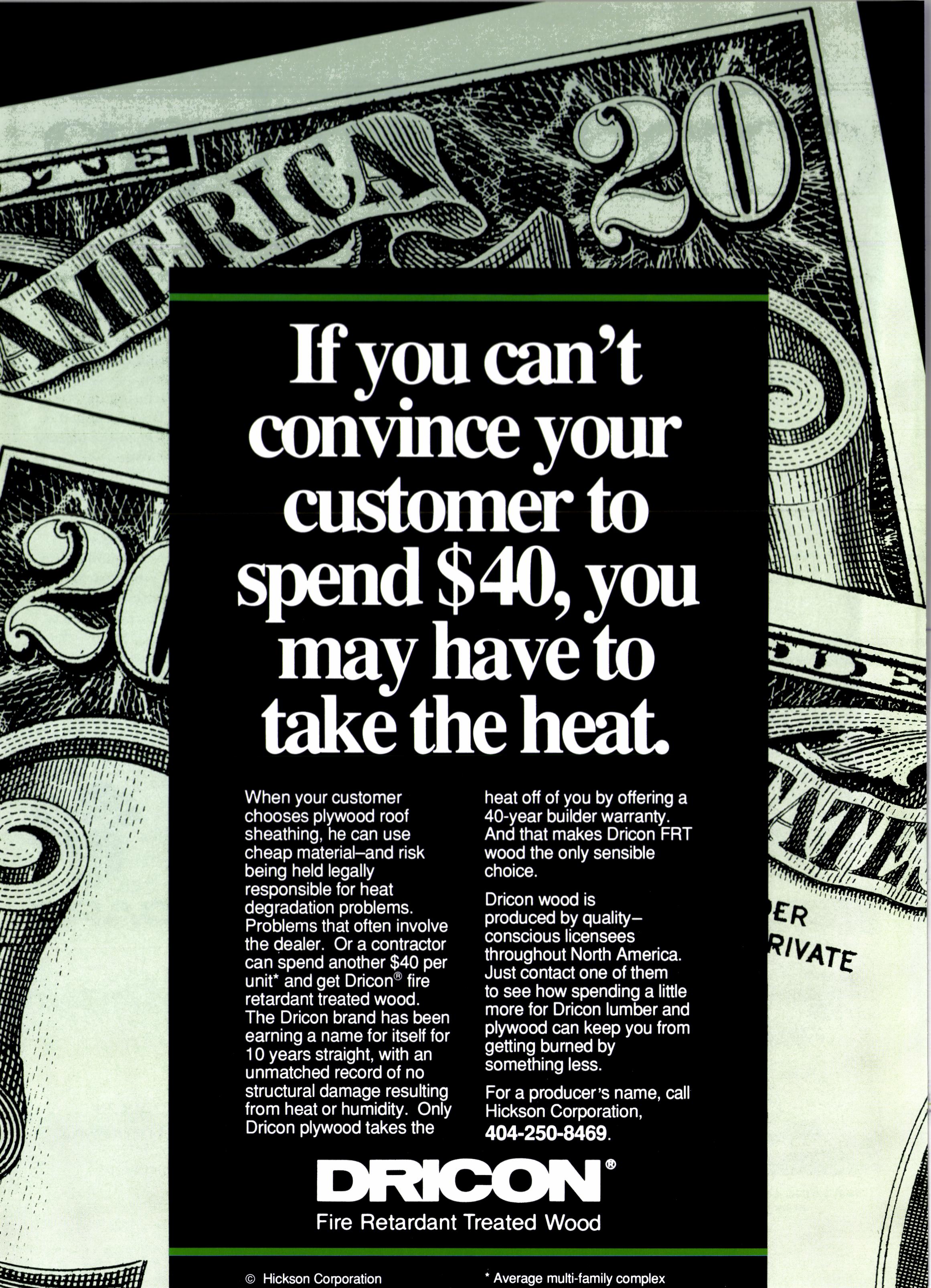 Recommendations on the Consumer Information Sheet are appropriate to any type of construction: e.9., protect eyes with safety goggles, wear a dust mask, wash after working. There is only one special precaution - treated wood should not be burned because burning breaks down the chemical bond - but the American Medical Association also cautions against burning plywood, particleboard and old furniture. Even though Consumer Information Sheets may scare some customers, Baldwin urges dealers to make them available. "They are part of a voluntary Consumer Awareness Program agreed to by the industry," he explains. "lf this information is not widely distributed, we may have mandatory regulations imposed that could create a burden for treaters and dealers."