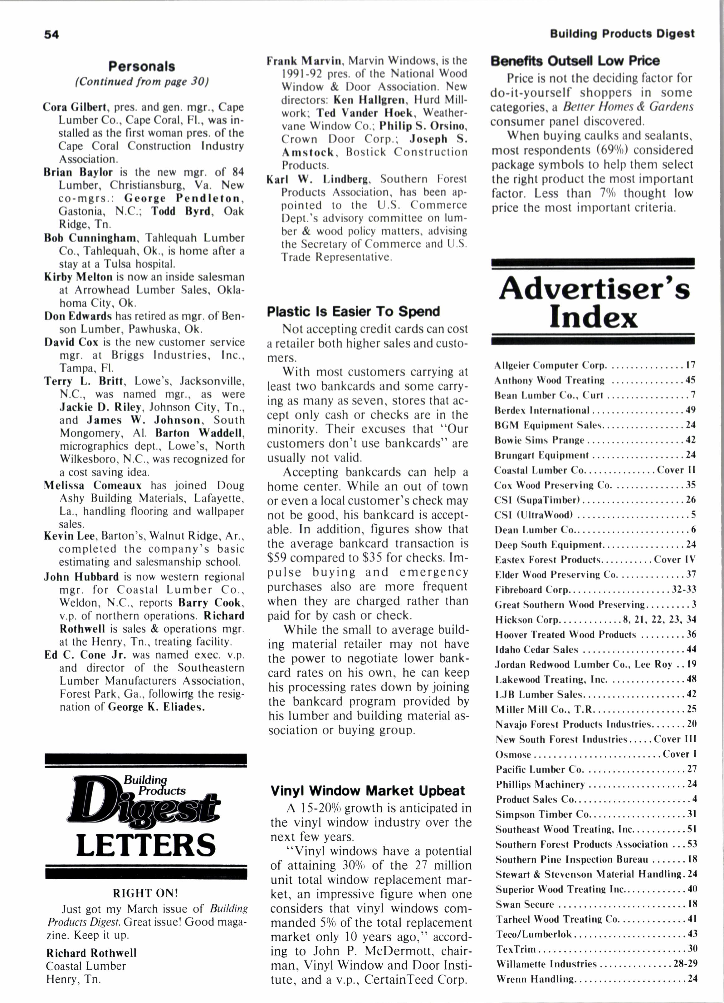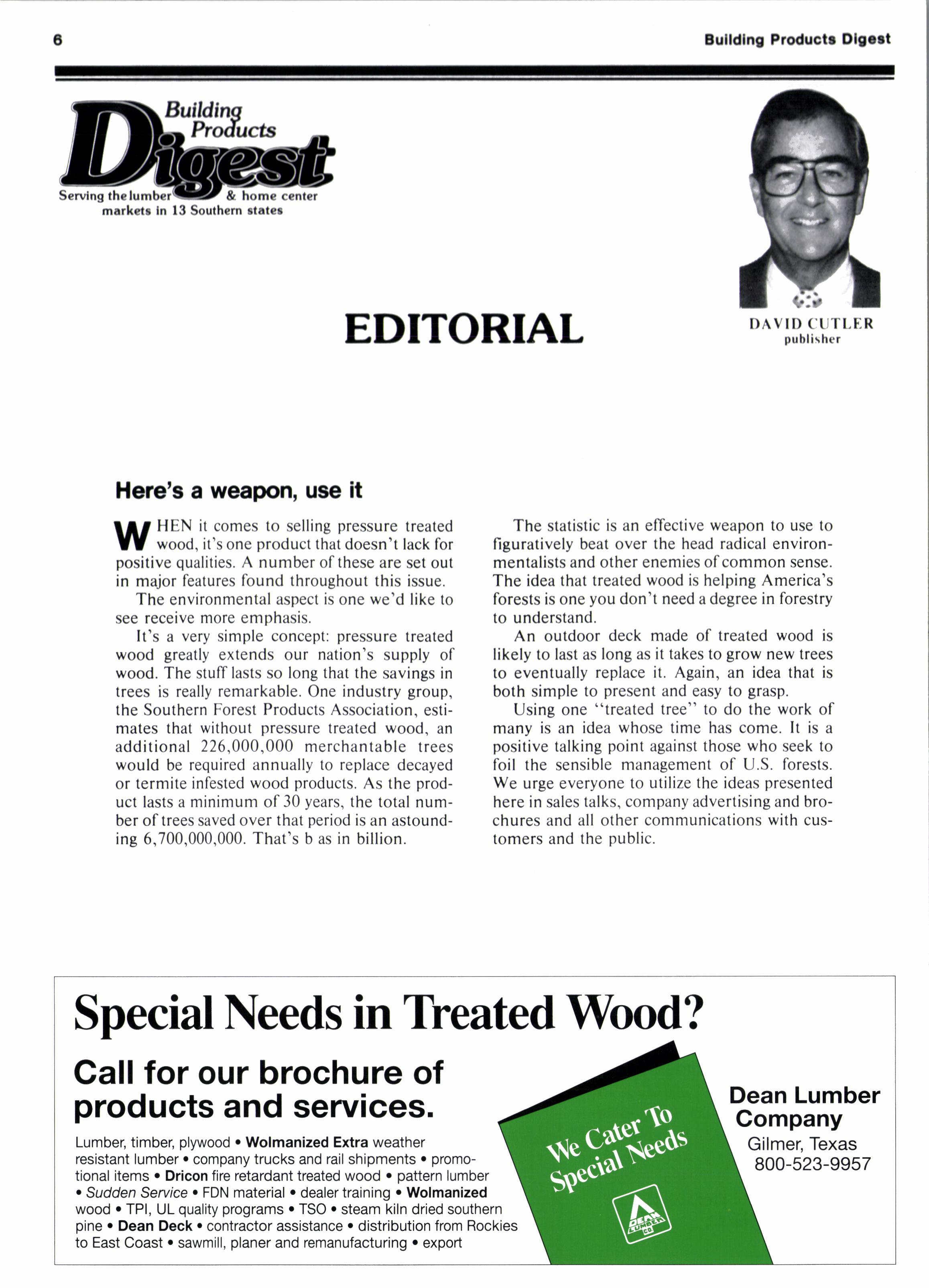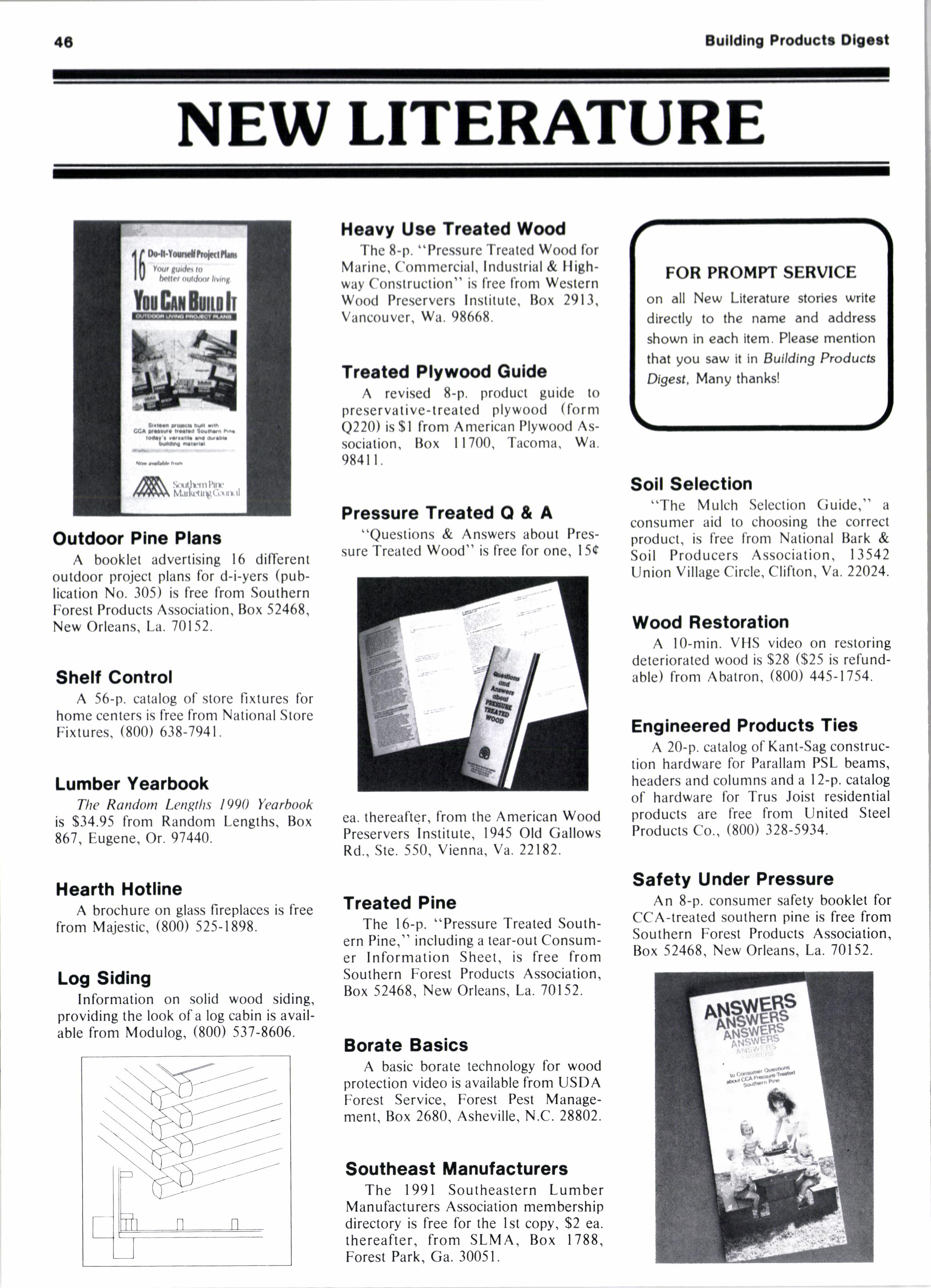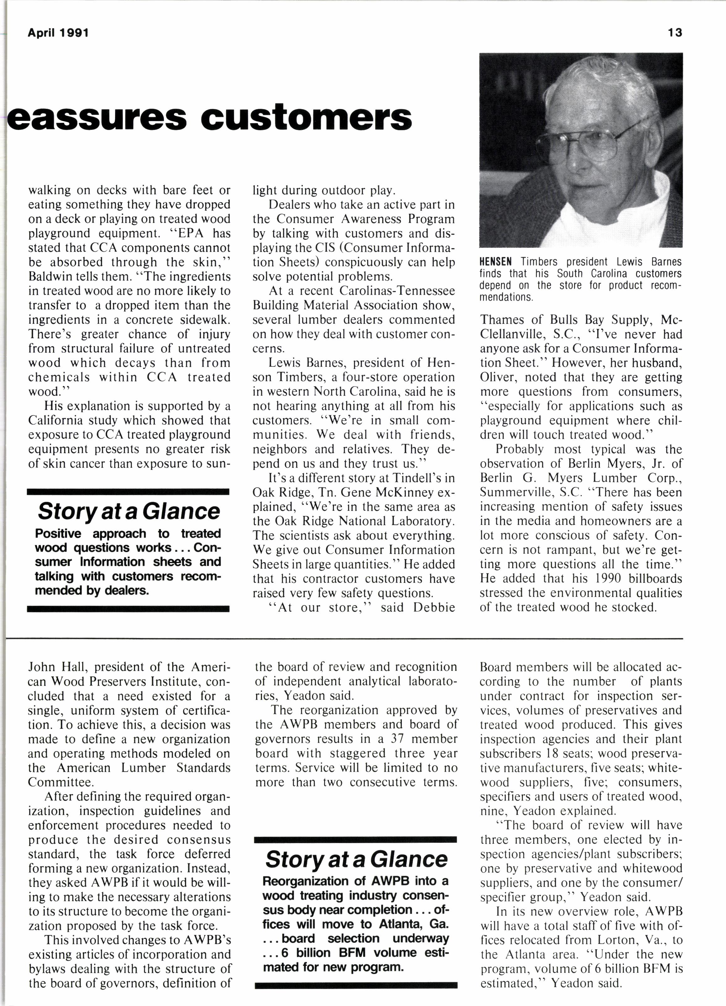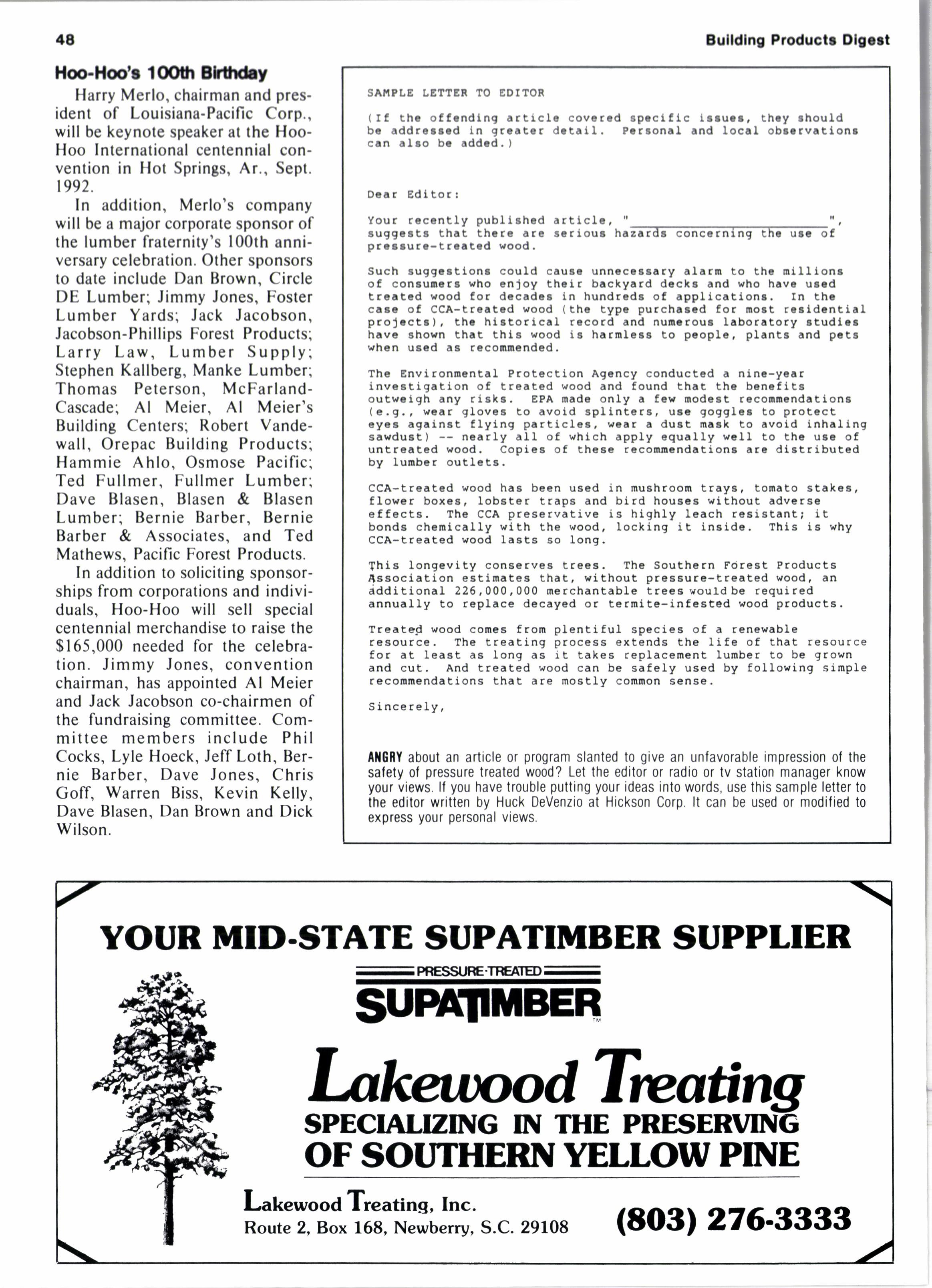 Probably most typical was the observation of Berlin Myers, Jr. of Berlin G. Myers Lumber Corp., Summerville, S.C. "There has been increasing mention of safety issues in the media and homeowners are a lot more conscious of safety. Concern is not rampant, but we're getting more questions all the time." He added that his 1990 billboards stressed the environmental qualities of the treated wood he stocked.