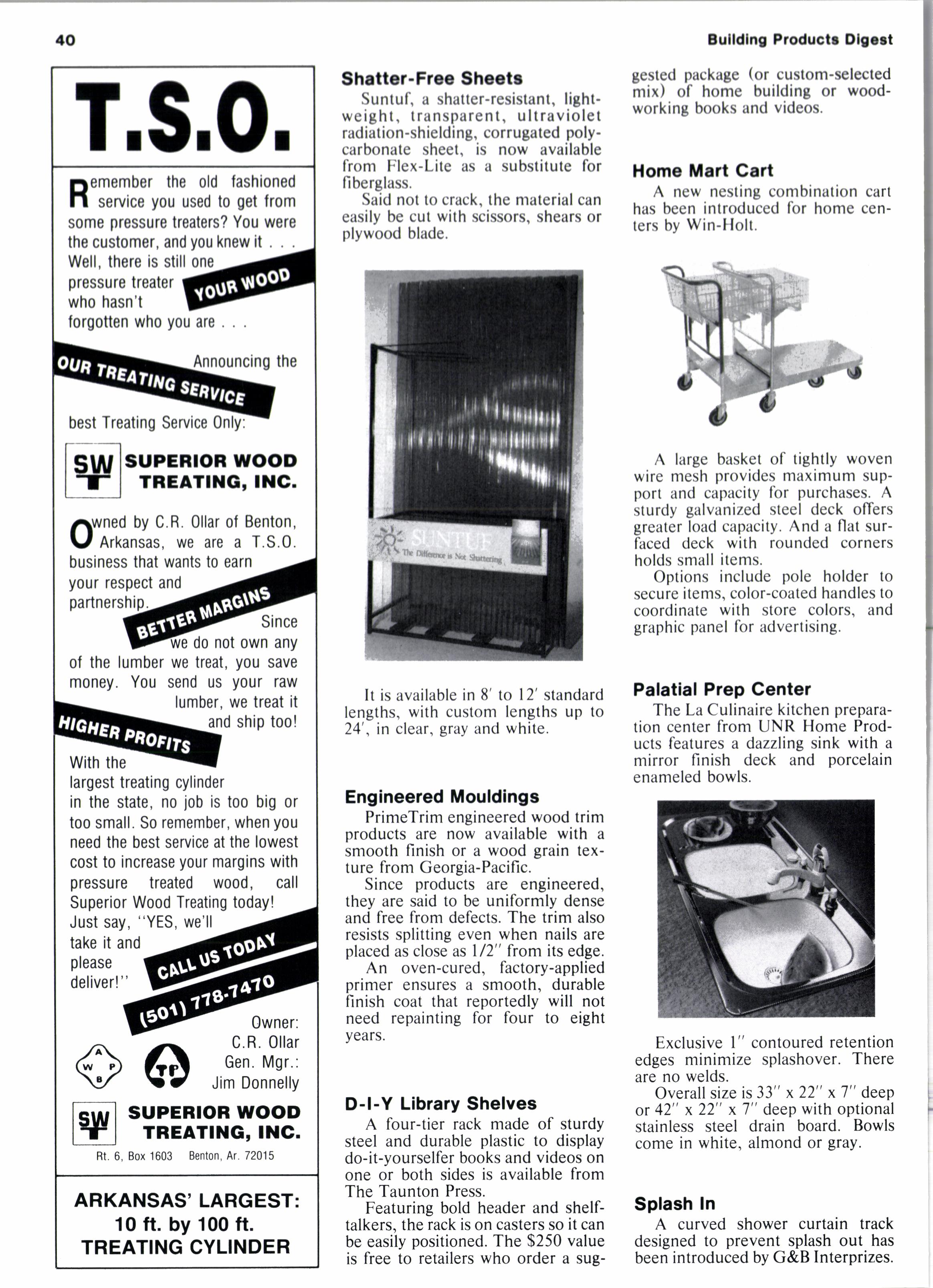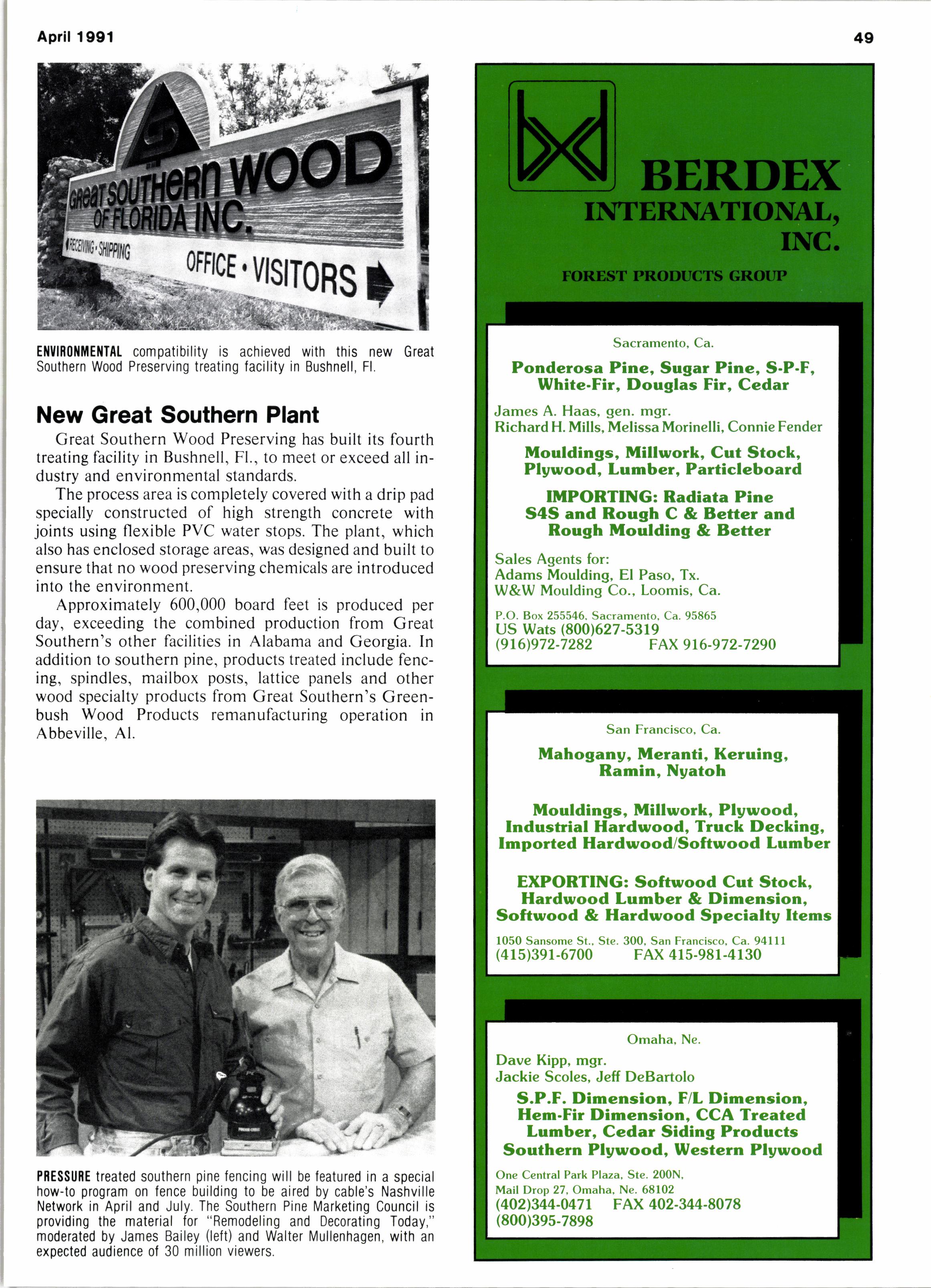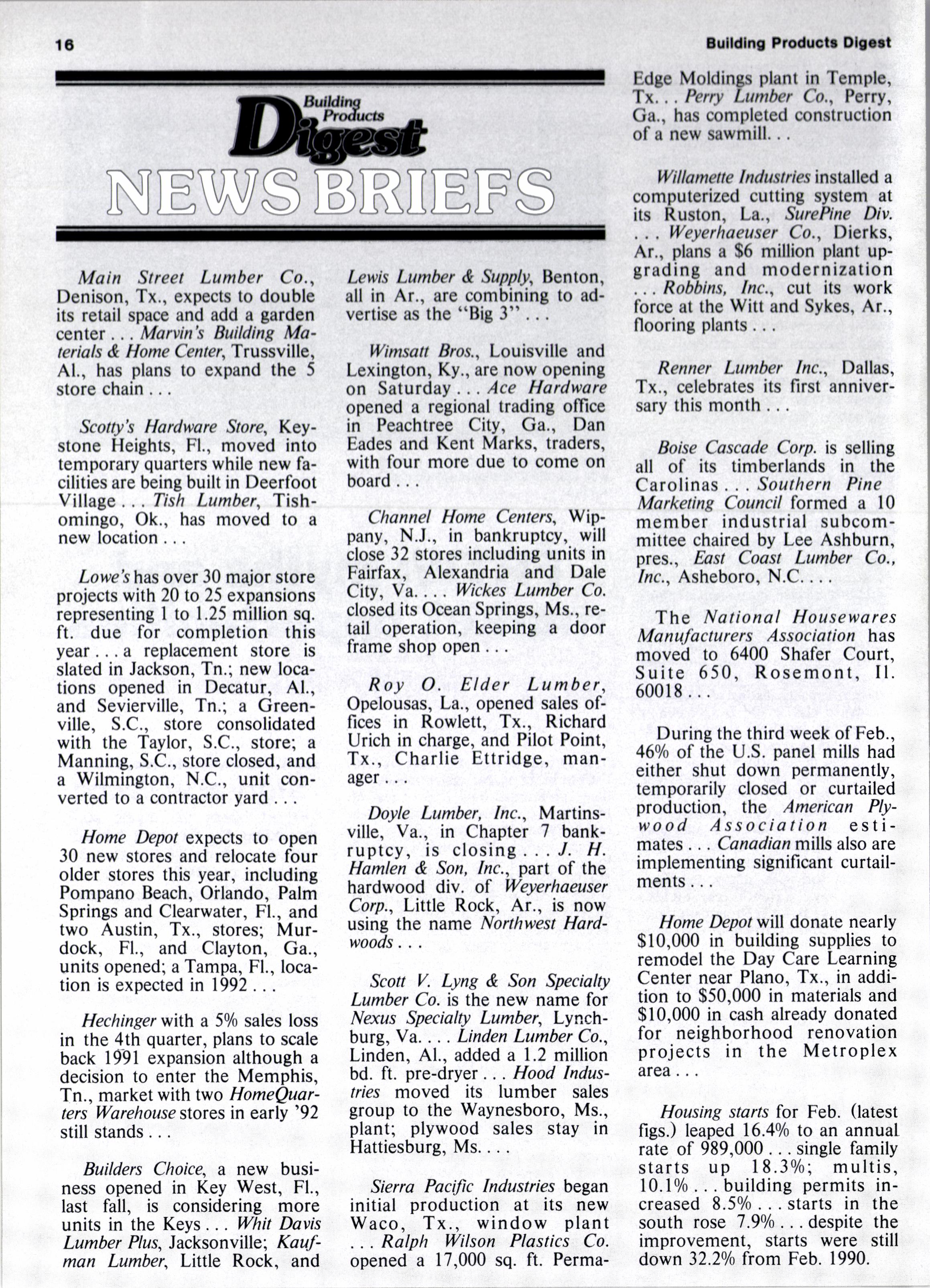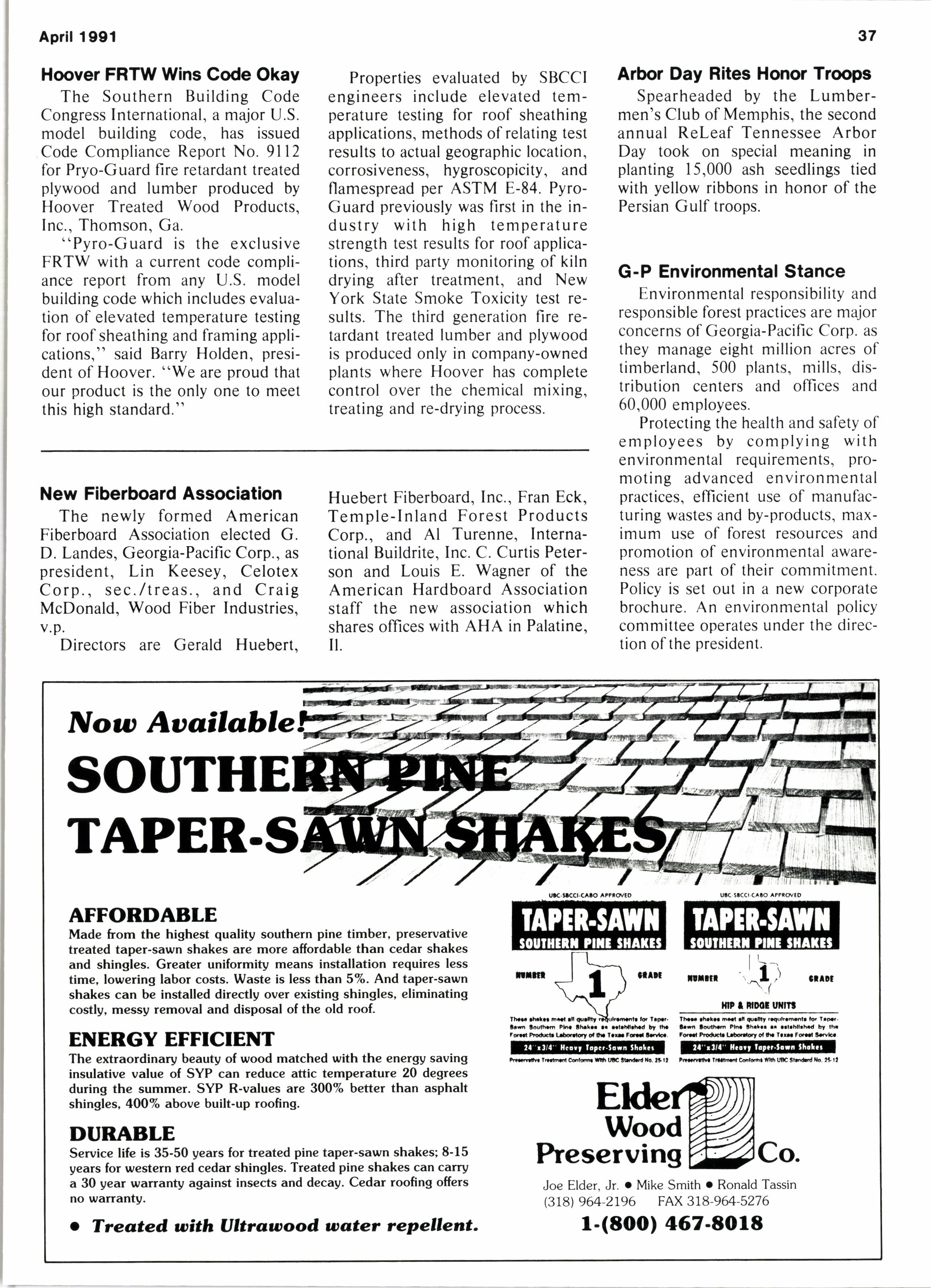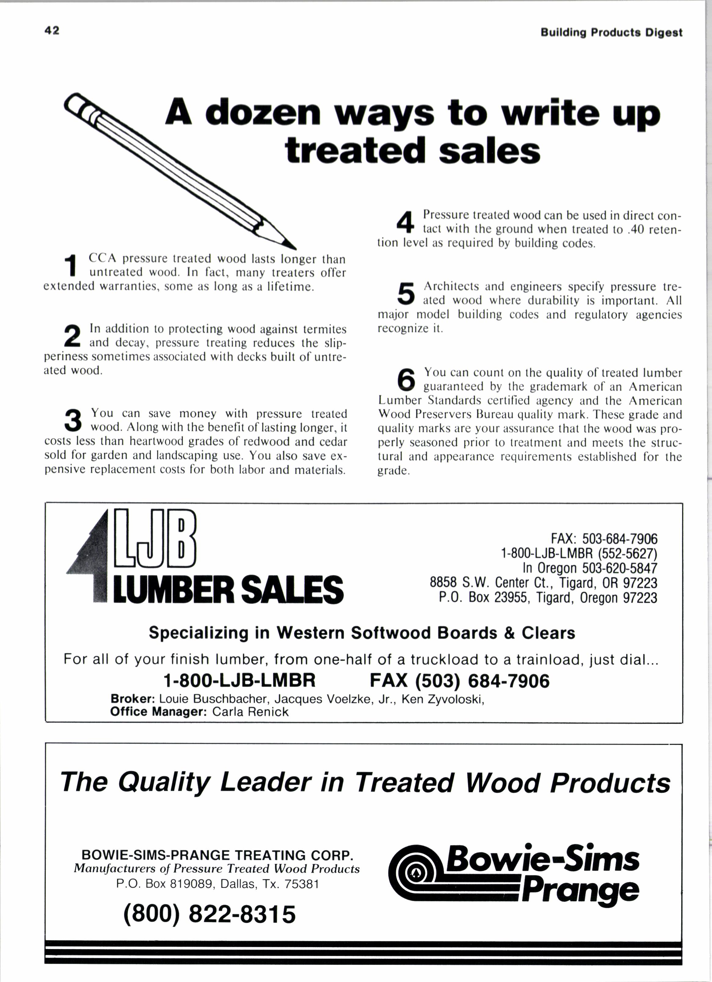 Probably most typical was the observation of Berlin Myers, Jr. of Berlin G. Myers Lumber Corp., Summerville, S.C. "There has been increasing mention of safety issues in the media and homeowners are a lot more conscious of safety. Concern is not rampant, but we're getting more questions all the time." He added that his 1990 billboards stressed the environmental qualities of the treated wood he stocked.