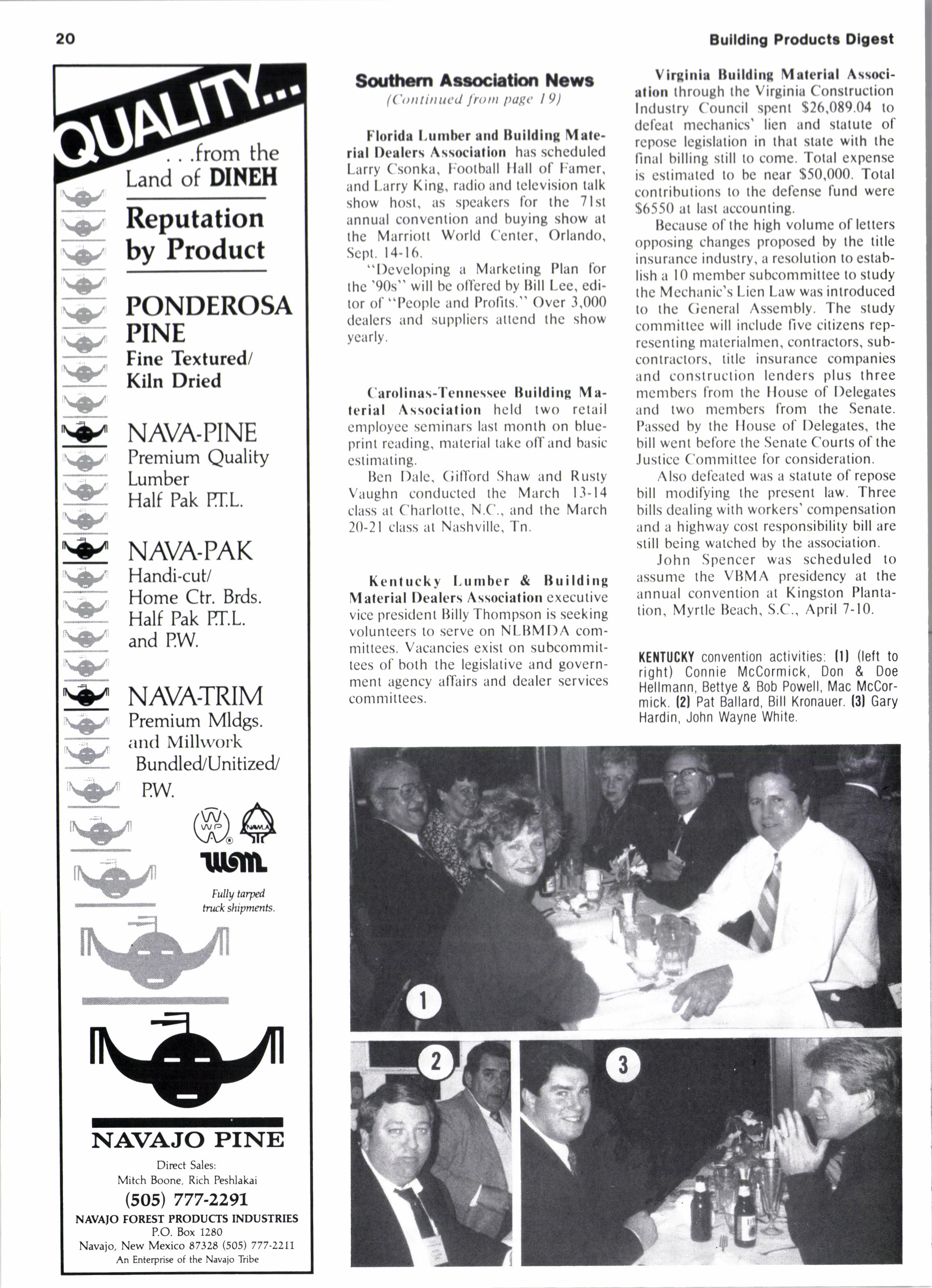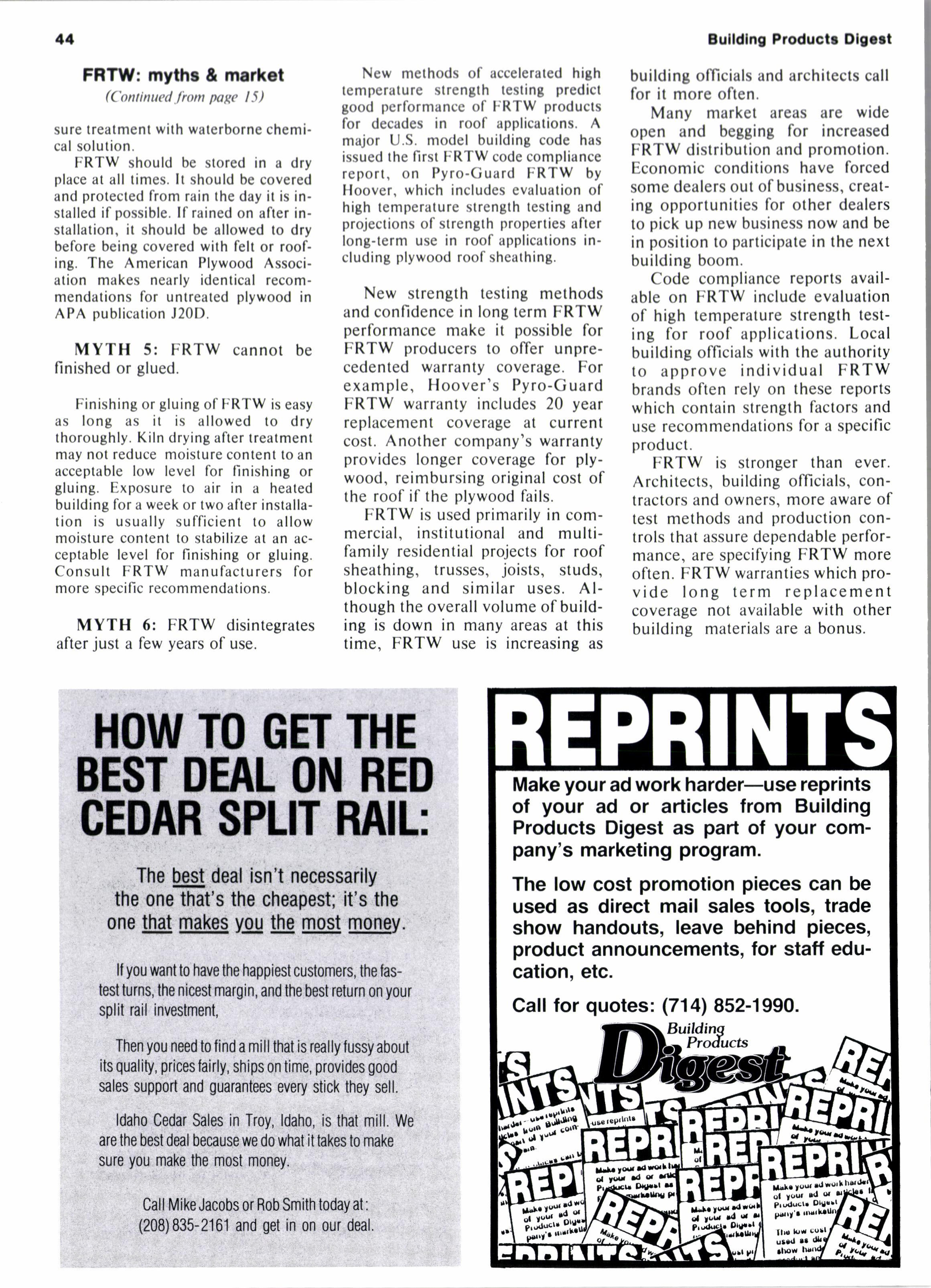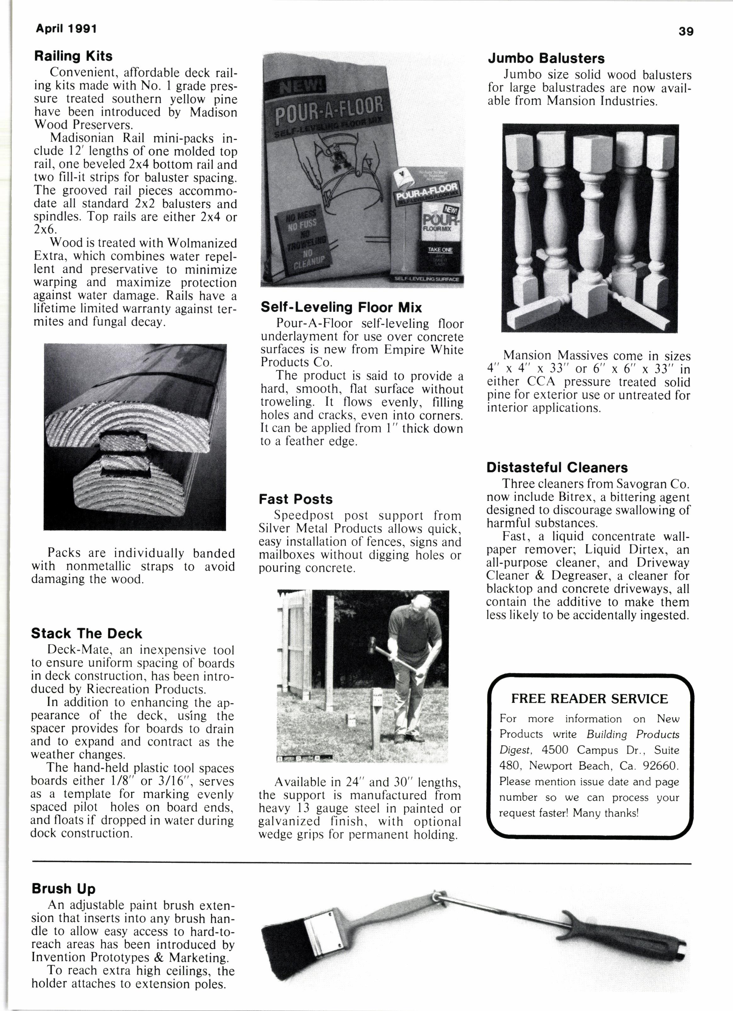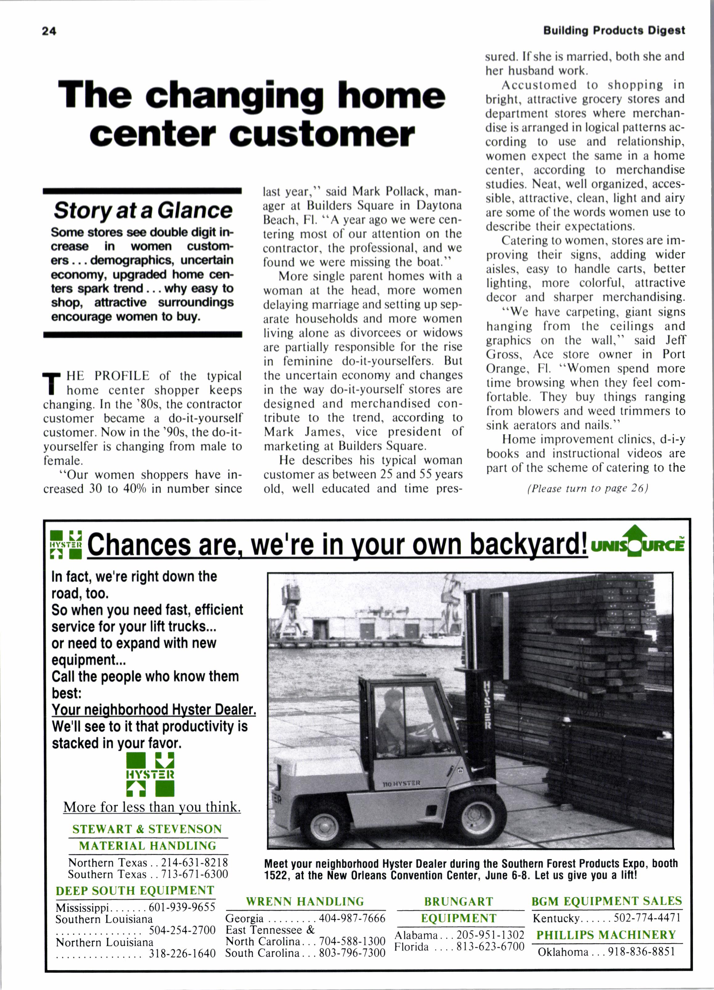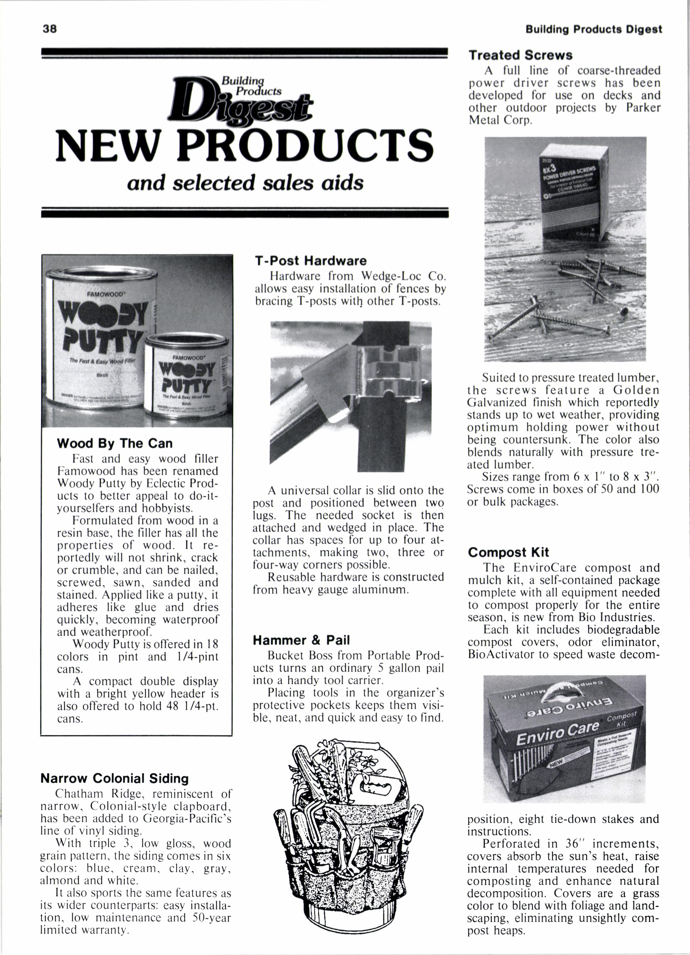 Probably most typical was the observation of Berlin Myers, Jr. of Berlin G. Myers Lumber Corp., Summerville, S.C. "There has been increasing mention of safety issues in the media and homeowners are a lot more conscious of safety. Concern is not rampant, but we're getting more questions all the time." He added that his 1990 billboards stressed the environmental qualities of the treated wood he stocked.