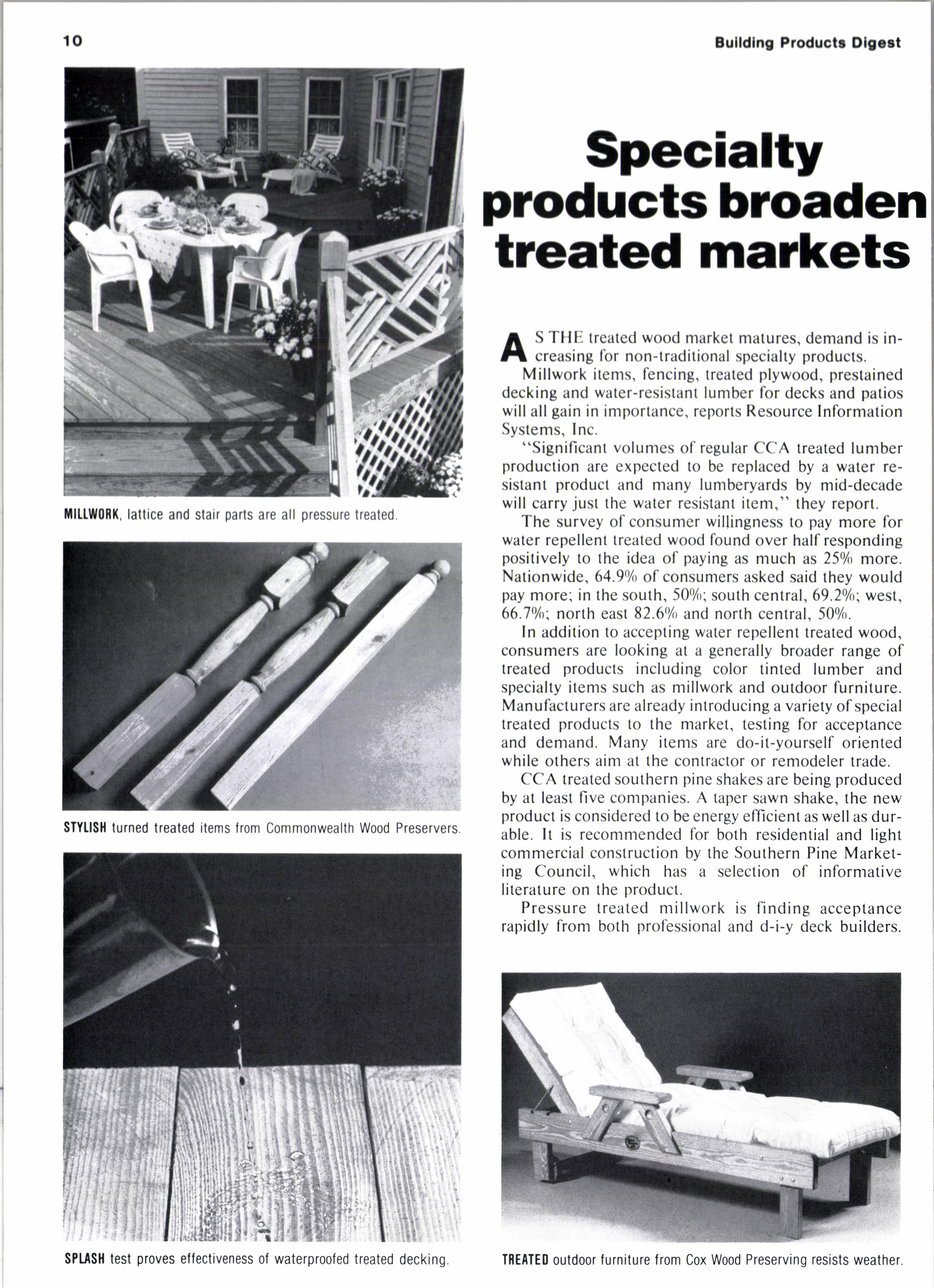 In addition to accepting water repellent treated wood, consumers are looking at a generally broader range of treated products including color tinted lumber and specialty items such as millwork and outdoor furniture. Manufacturers are already introducing a variety of special treated products to the market, testing for acceptance and demand. Many items are do-it-yourself oriented while others aim at the contractor or remodeler trade.