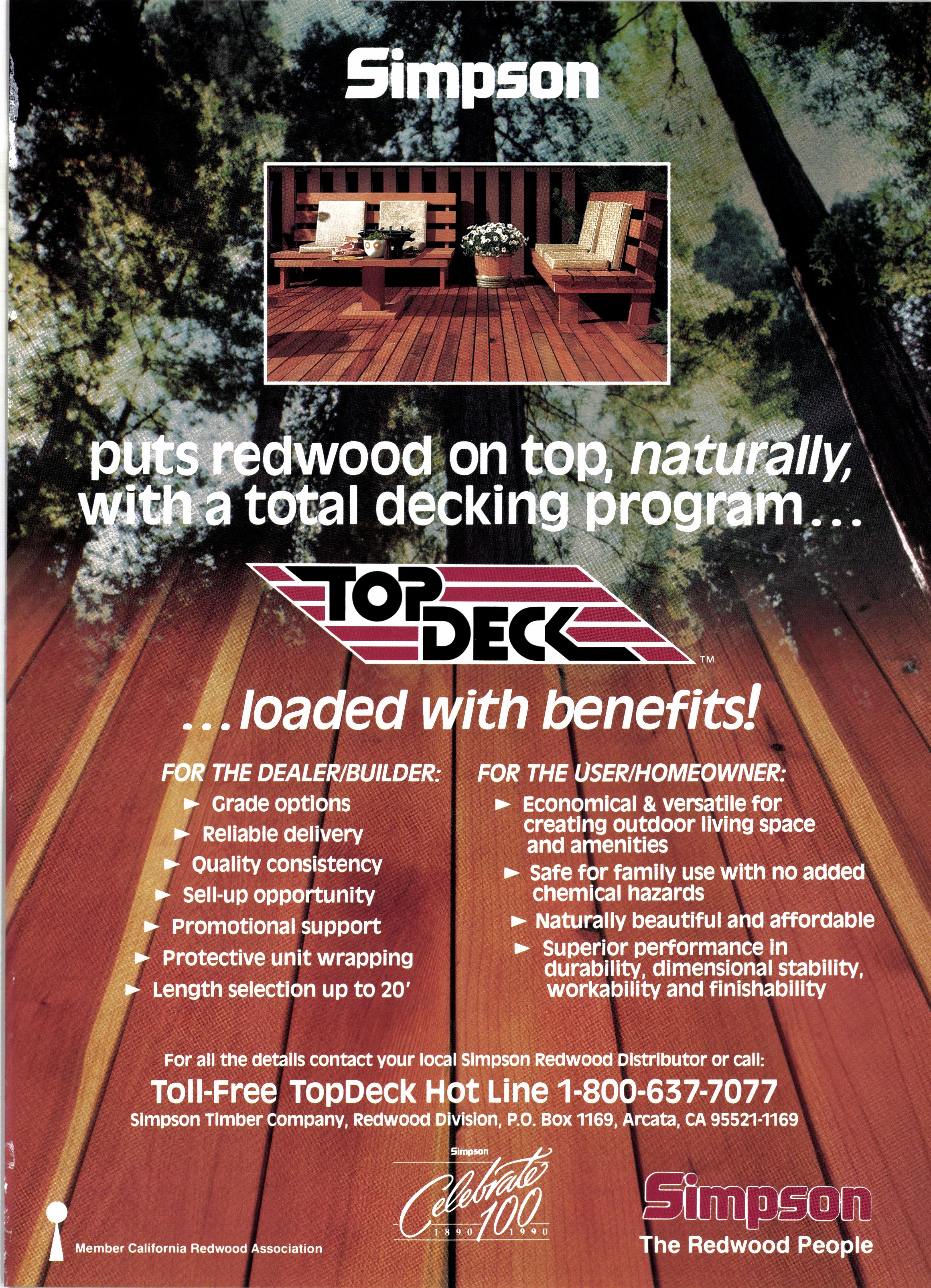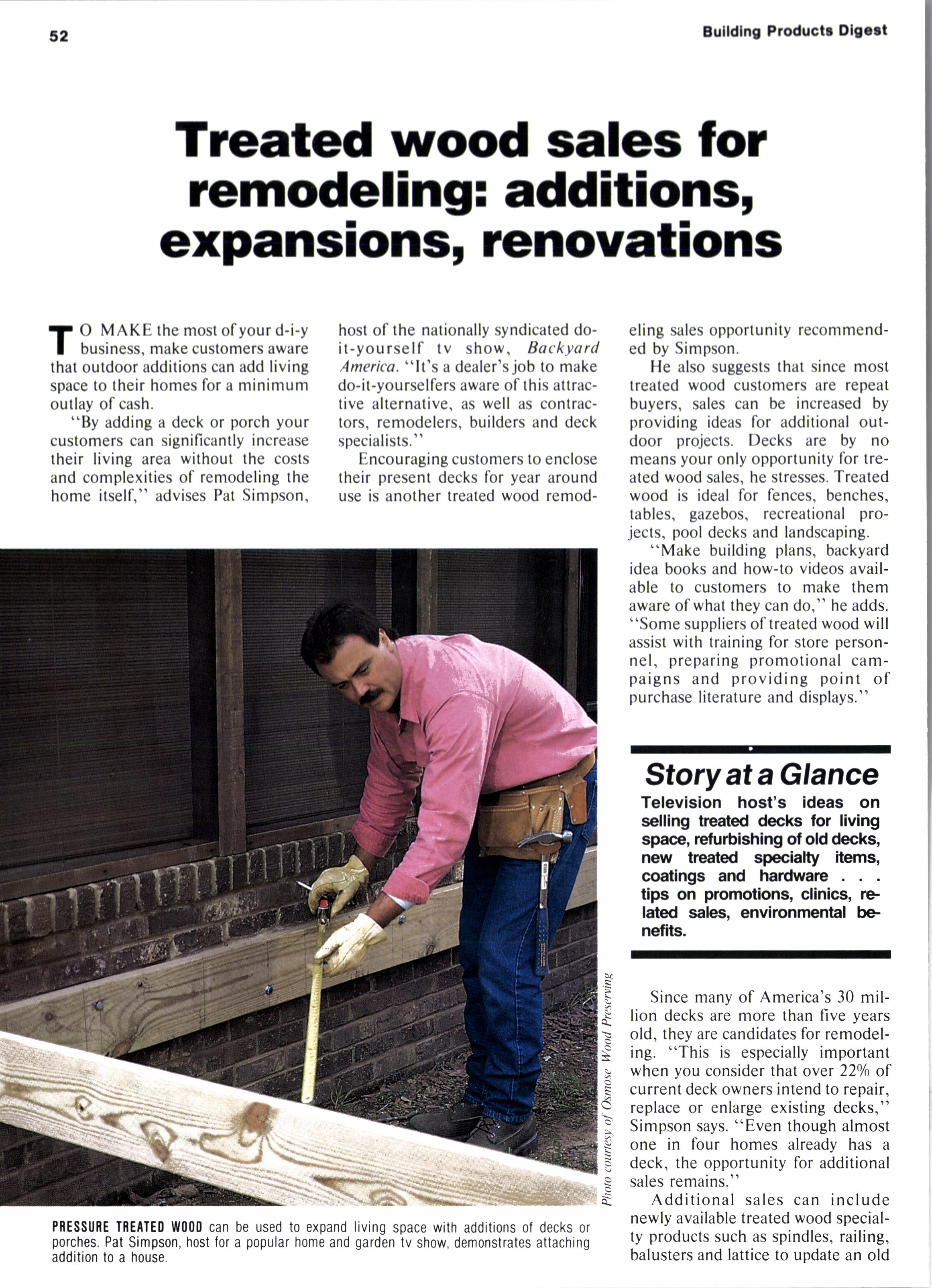 "To maximize potential treated lumber sales, a dealer needs to actively promote the advantages of decks and other outdoor projects," Simpson advises. "Spring is an excellent time to hold in-store deck clinics. "
