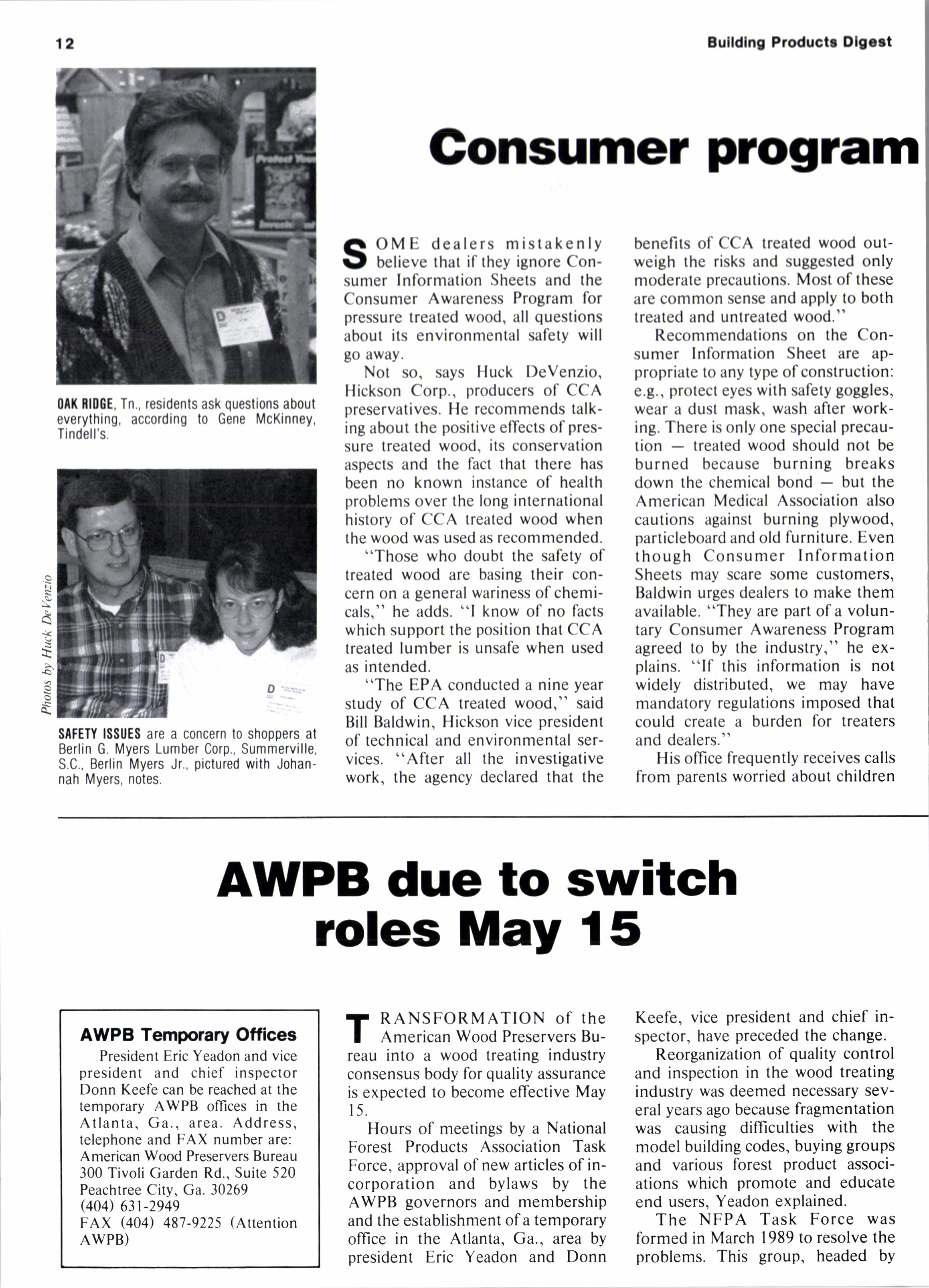 President Eric Yeadon and vice president and chief inspector Donn Keefe can be reached at the temporary AWPB offices in the Atlanta, Ga.. area. Address, telephone and FAX number are: American Wood Preservers Bureau 300 Tivoli Garden Rd., Suite 520 Peachtree City, Ga. 30269 @04) 631-2949