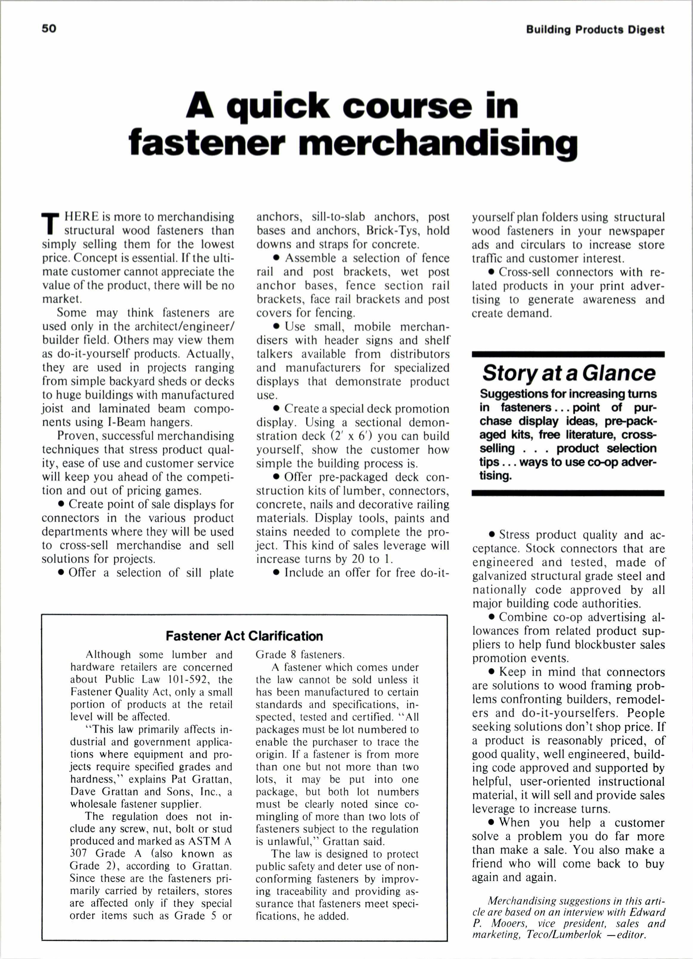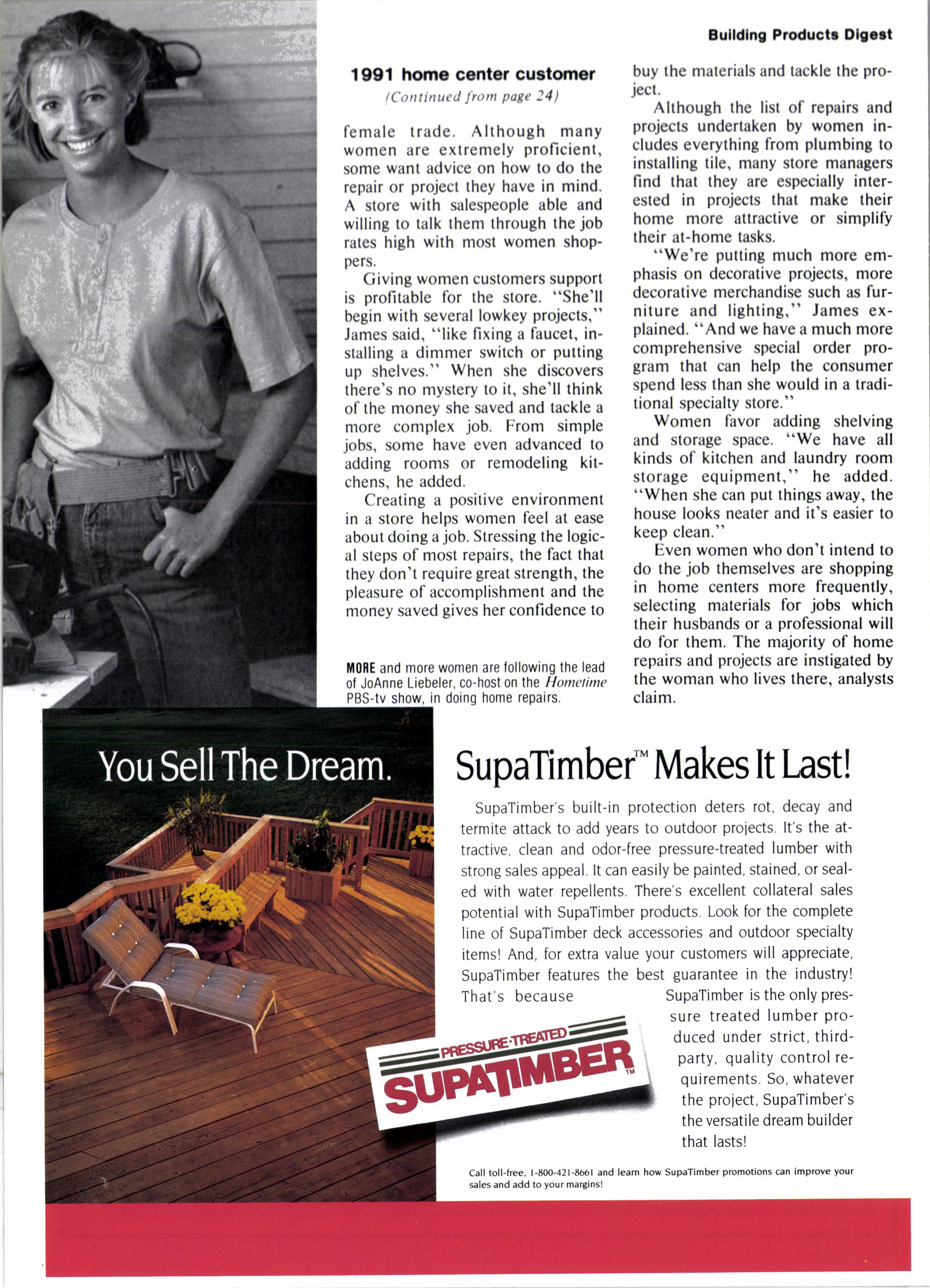 "The appearance of the wood ranks first in in-store purchase decision factors for d-i-yers," Simpson suggests. "Though they are general- ly not familiar with grades and species, consumers are favorably impressed by straight, clean lumber displayed in an orderly manner."