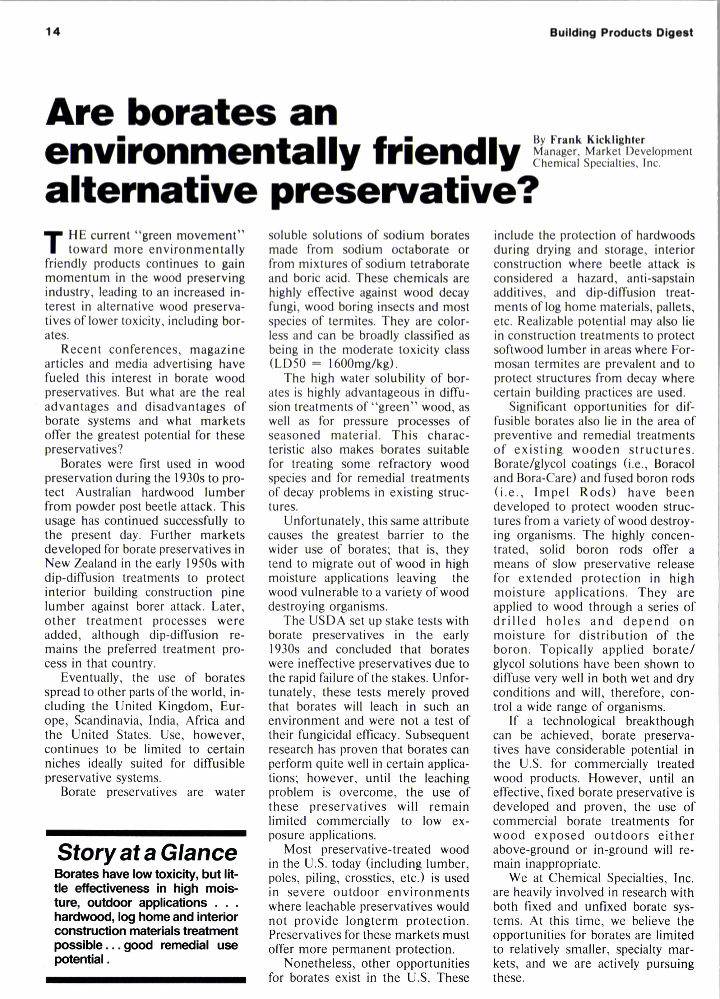 I toward more environmentally friendly products continues to gain momentum in the wood preserving industry, leading to an increased interest in alternative wood preservatives of lower toxicity, including borates.