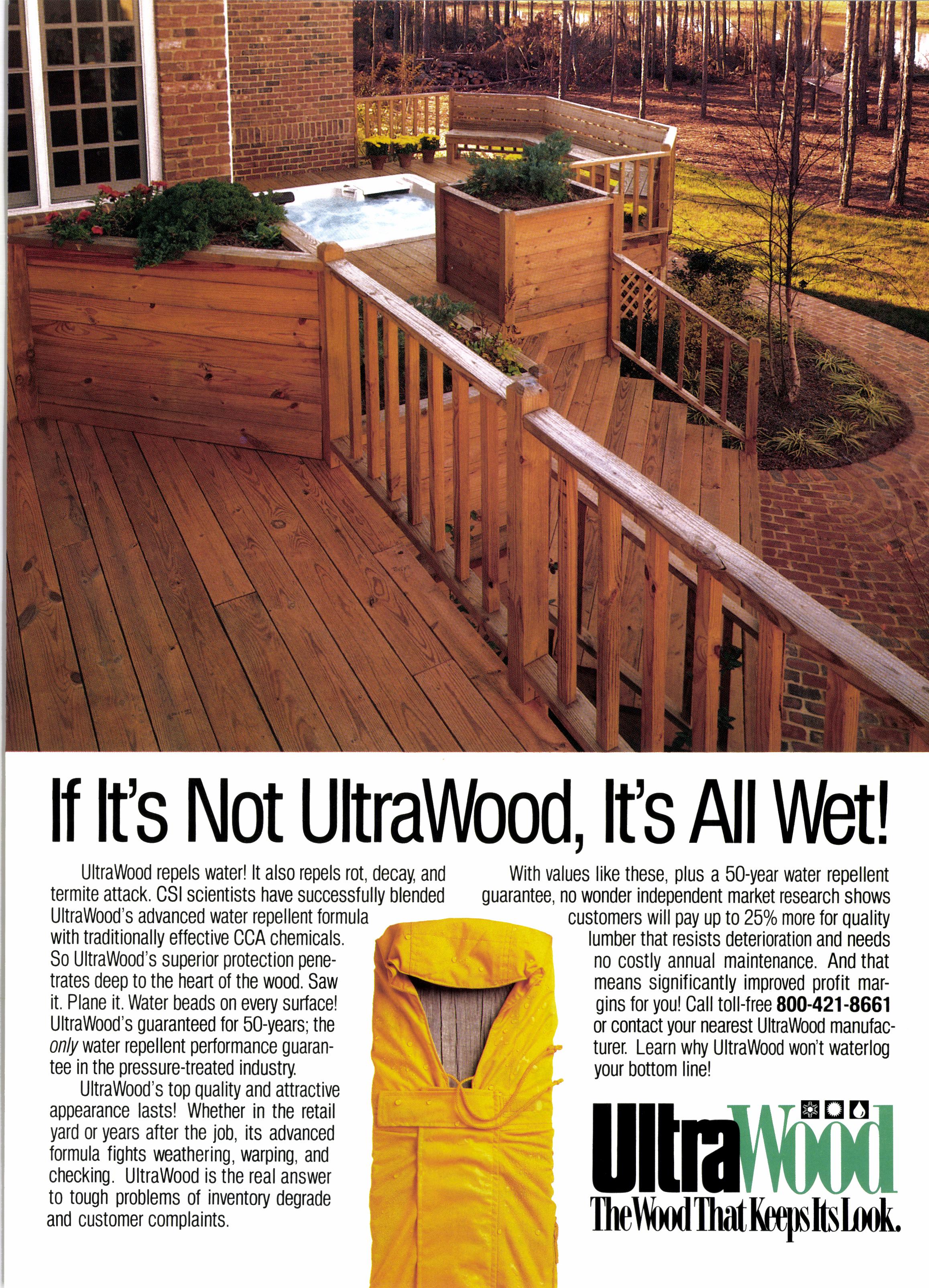 UltraWood repels waterl lt also repels rot, decay and termite attack. CSI scientists have successfully blended UltraWood's advanced water repellent formula with traditionally effective CCA chemicals. So UltraWood's superior protection peneilates deep to the heart of the wood, saw it. Plane it. Water beads on every surface! UltraWood's guaranteed for 5O-years; the only water repellent performance guarantee in the pressure-treated industry.