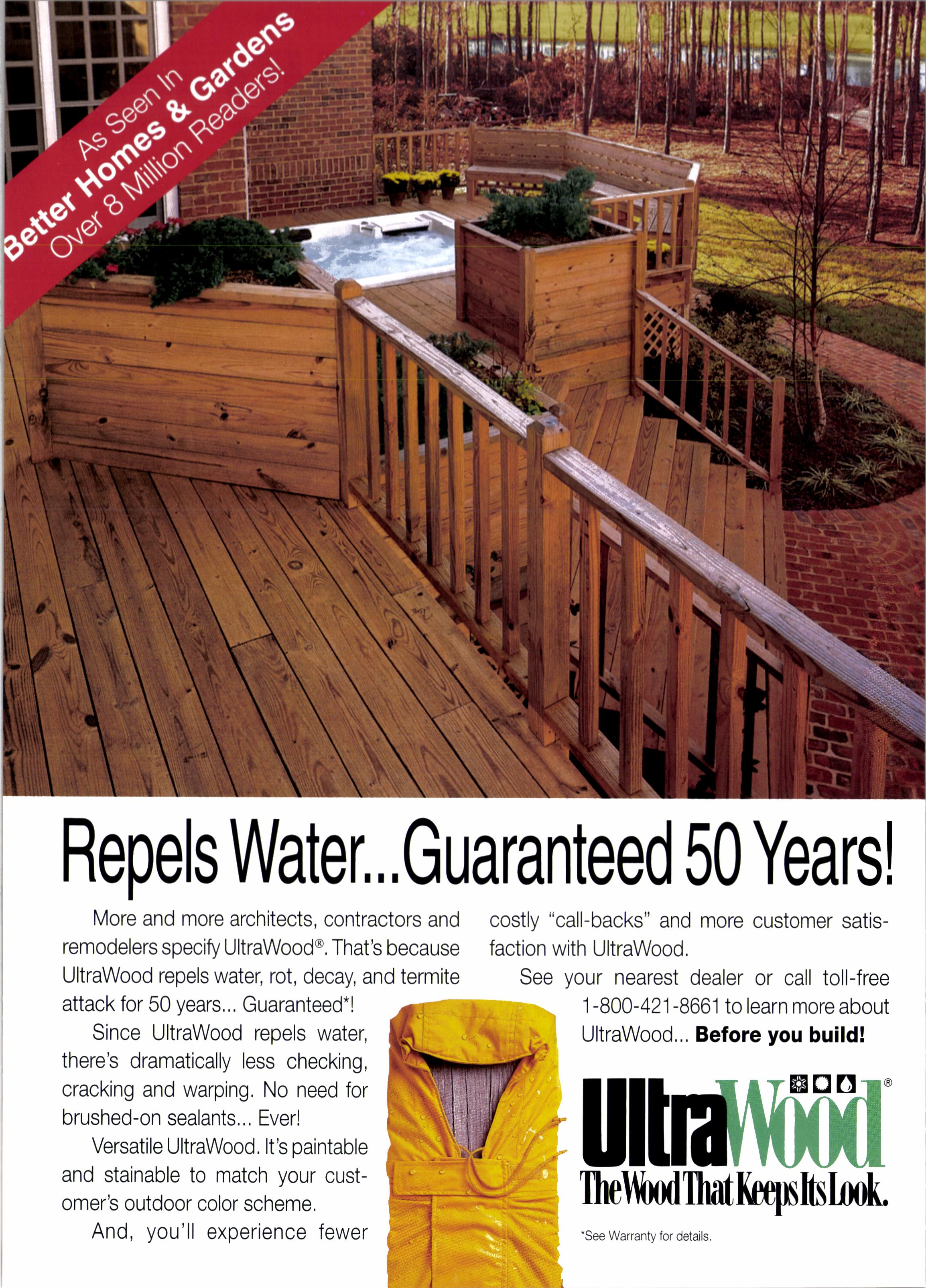 More and more architects, contractors and remodelers specify U ltraWood@. That's because UltraWood repels water, rot, decay, and termite attack for 50 years.,. Guaranteed-!