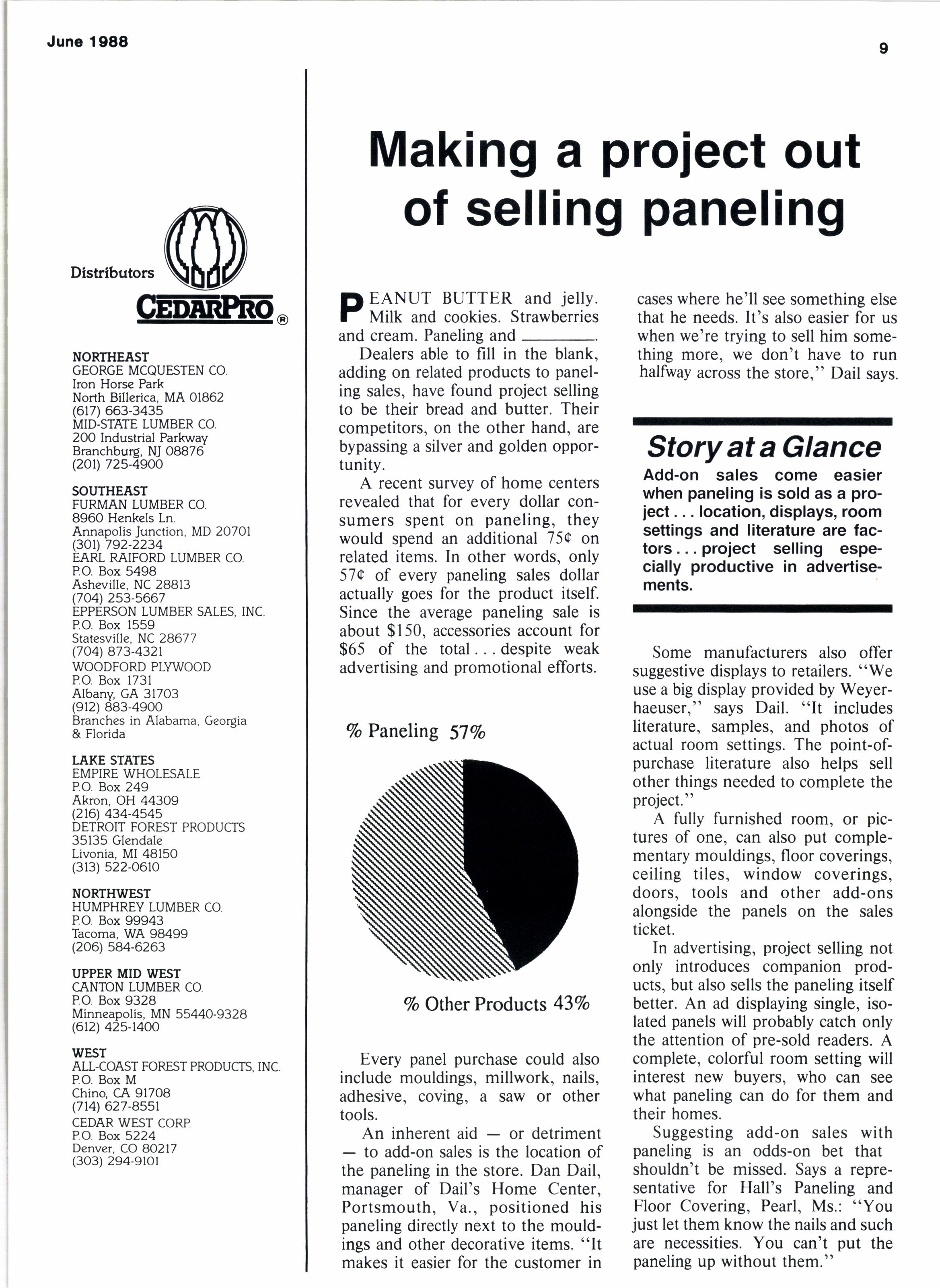 One interesting fact that we discovered in our research for this issue is that for every dollar of paneling sold, an additional 75 cents in sales is generated in related purchases such as nails, moulding, glues, paints, tools, saw blades, etc.