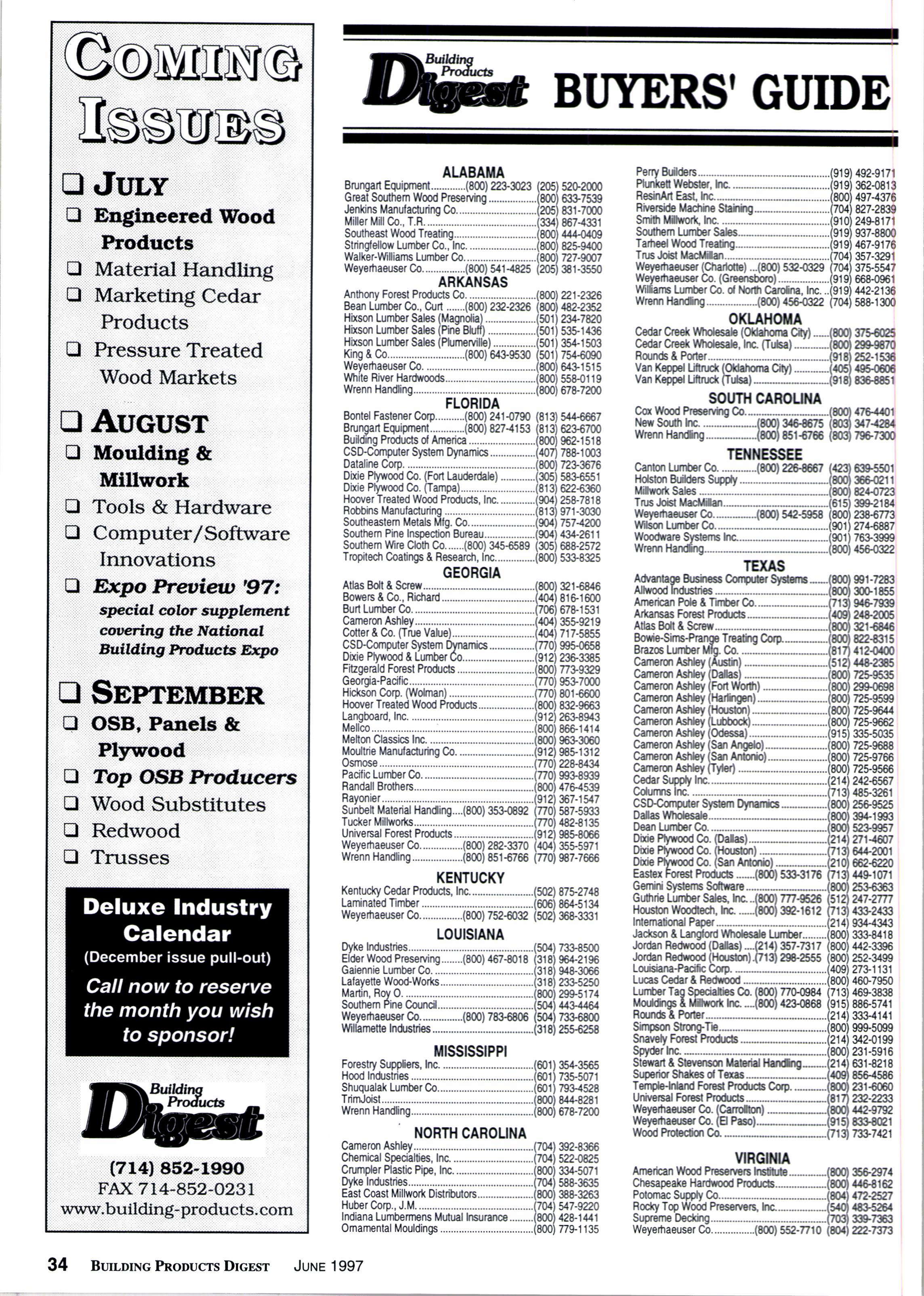 Finish Timbers Ilecking Dimenslon Fencing At*, So.r0t tt Yellow Pine KD. vulLunms LUMBER COMPANY OF N.C., llfc. P.O. Drawer 4198, Rocky Mount, North Carolina 27ffi3 FAX 919/1420765 (gfg) tpll2-2t36 Circle No. 104 on p. 38 4 Burr.uxc Pnonucts Dlcrsr JuHe 1997