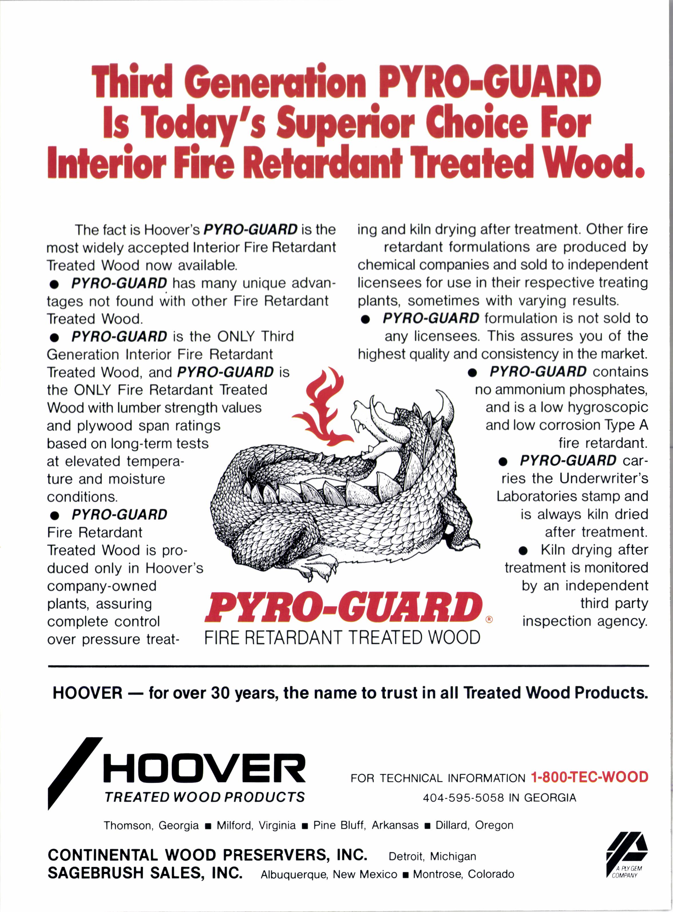 PYNO-GAAM'. FIRE RETARDANT TREATED WOOD HOOVERfor over 30 years, the name to trust in all Treated Wood Products. t HoovER 7 TREATED WOOD PRODUCTS FoR rEcHNrcAL TNFoRMAToN 1-800-TEC-WOOD 404-595-5058 tN GEORGTA Thomson, Georgia r Milford, Virginia r Pine Bluff, Arkansas r Dillard, Oregon CONTINENTAL WOOD PRESERVERS, lNC. Detroit, Michigan SAGEBRUSH SALES, lNC. Albuquerque, New Mexico r Montrose, Colorado ffi