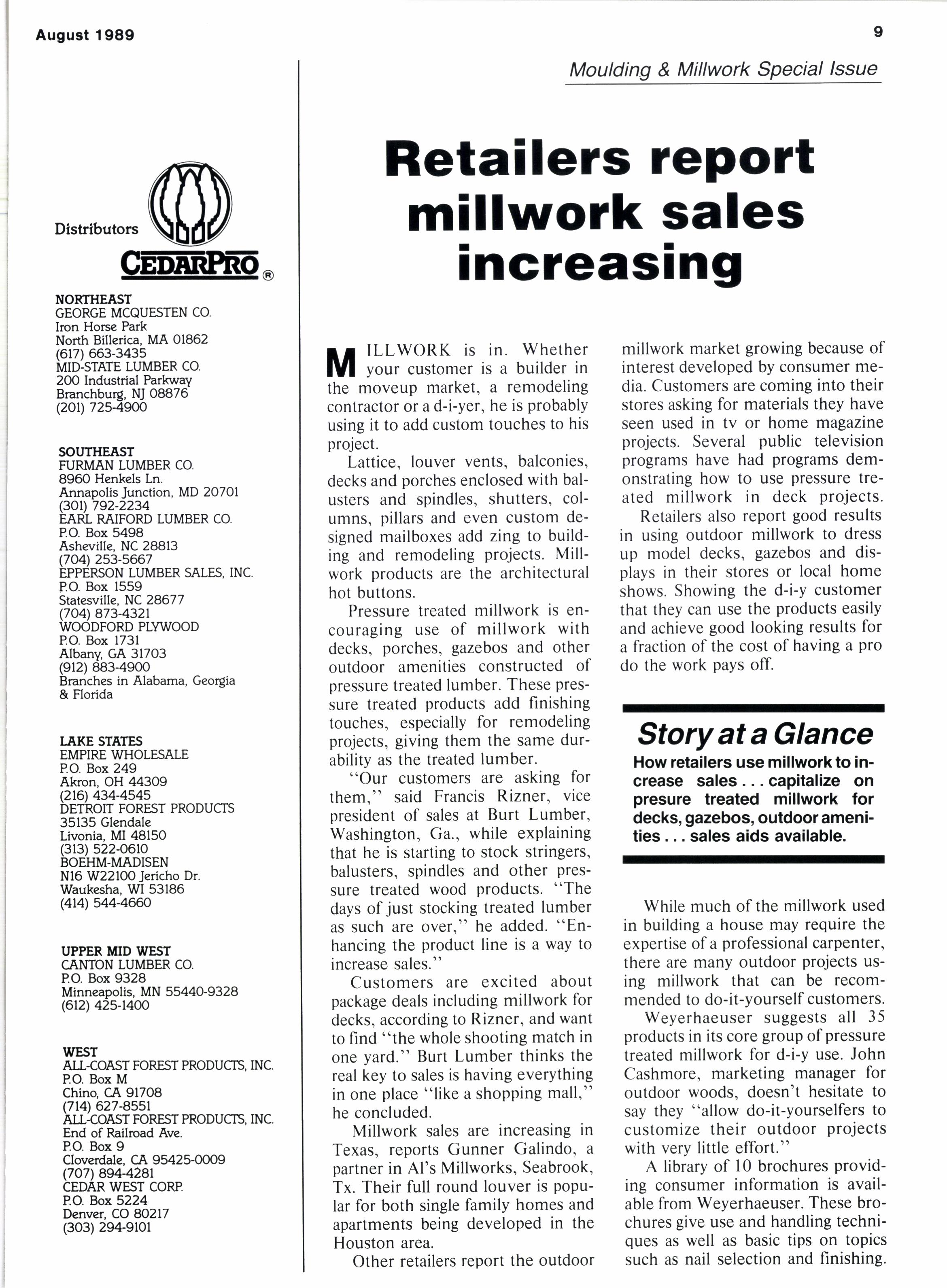 4 Bulldlng Productr b[oet VOLUilIE 8, No. 6 Serving l3 Southern states AUGU9T | 989 tourDrl{c & HrrrwoRK sPEcrAr rssuE Retailers Report Increased Sales In Millwork Moulding & Millwork Trends Influence Demand Just-ln-Time Delivery Builds Millwork Profit Thinking Like A Customer Brings In Big Bucks Definitions For Everyone Who Sells Millwork Wholesalers See lncreased Just-ln-Time Demand Eric Yeadon Appointed New President Of AWPB Southern Pine Continues Popular Truss Material Association Announces Revised Door Standards Virginia Treater Builds Space Age Facility Woodpecker lmpact On Timber Cutting ln Region Editorial 6 News Briefs l6 Home Center Merchant 23 Southern Assn. News 24 Operating Opportunities 26 Personals 27 New Products 28 New Literature g4 Letters 38 Obituaries 38