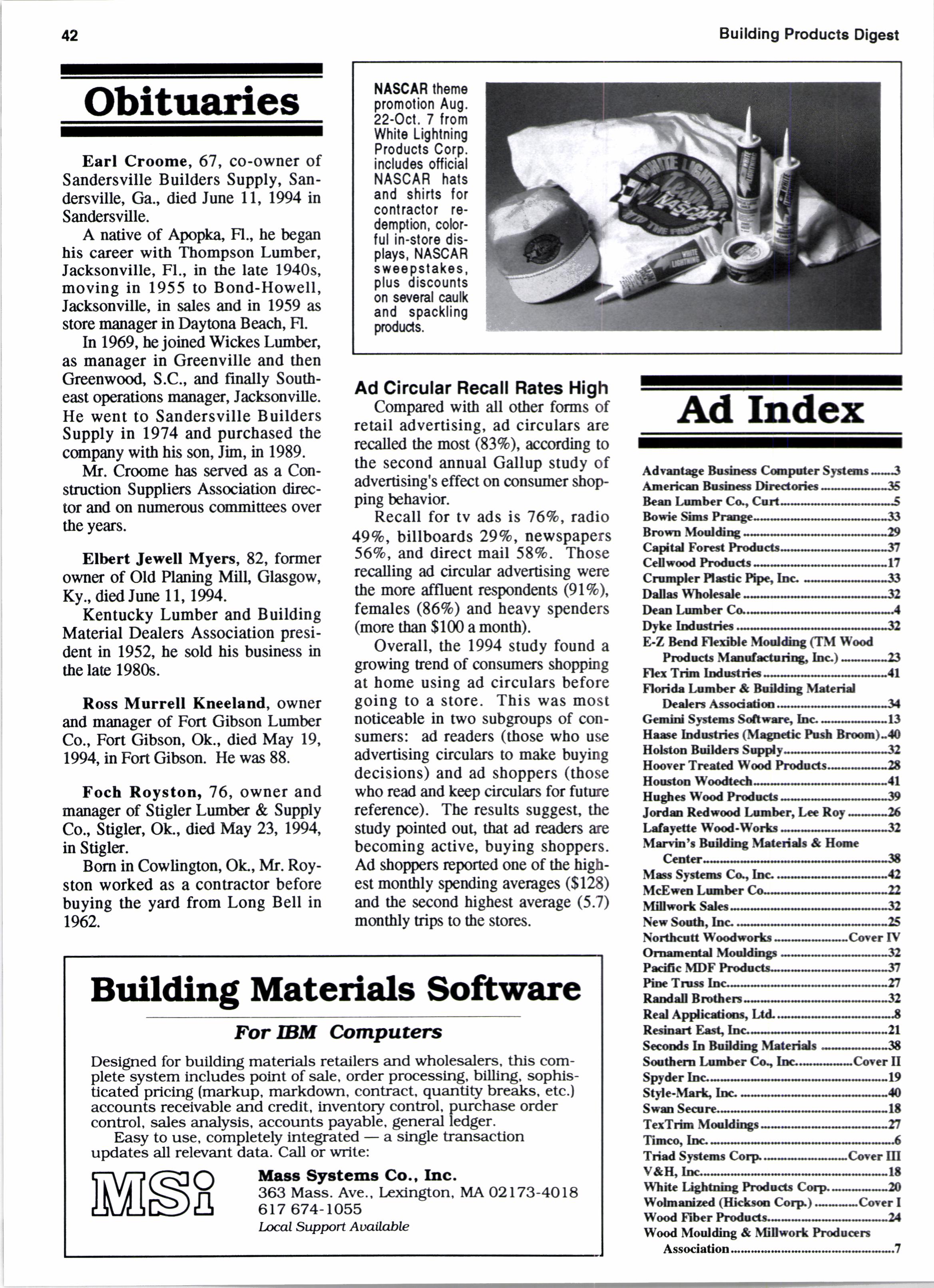 A native of Apopka Fl., he beqan his career with Thompson Lumber, Jacksonville, Fl., in the late 1940s, moving in 1955 to Bond-Howell, Jacksonville, in sales and in 1959 as soor€ nanager in Daytona Beach, Fl.