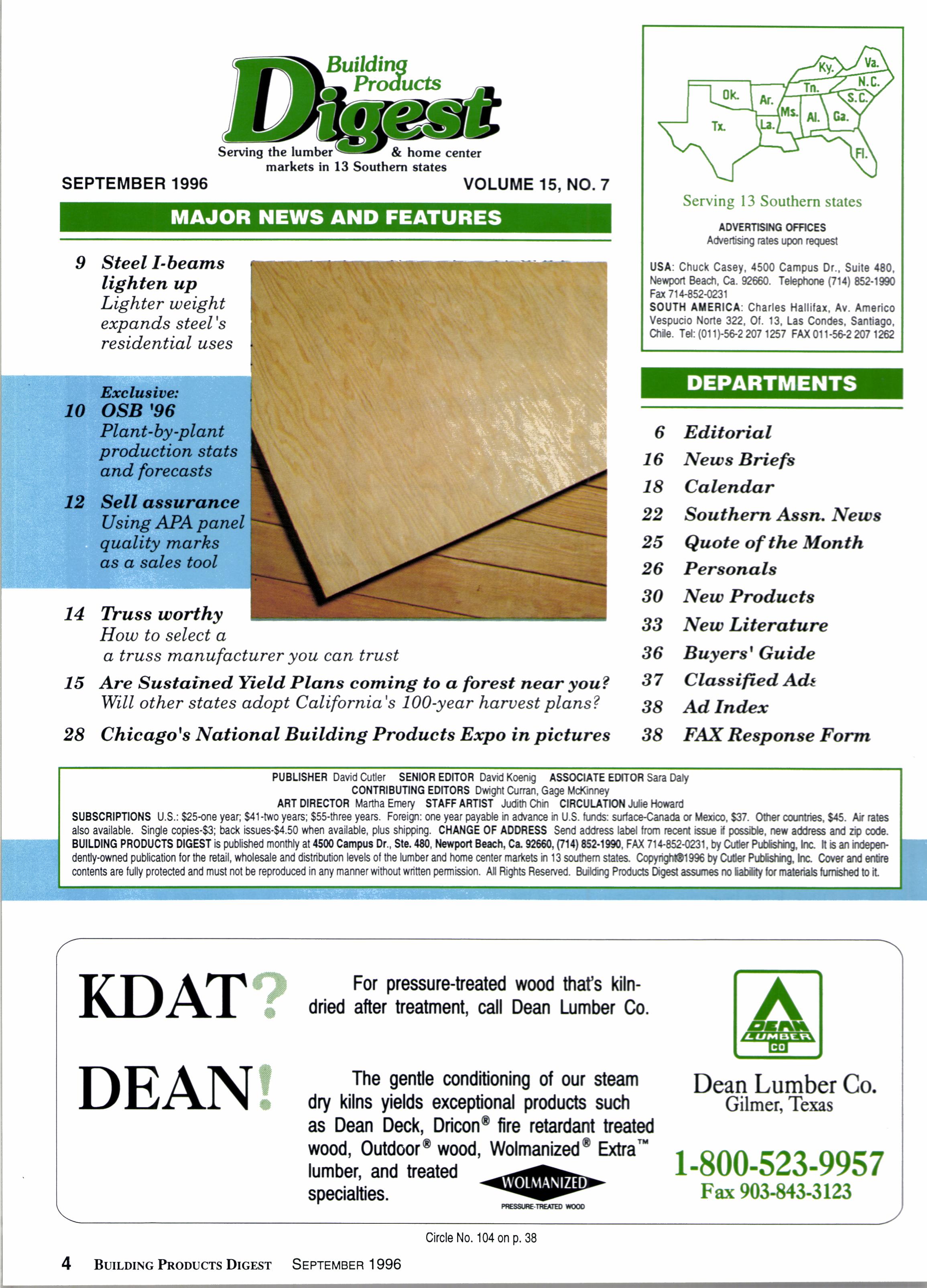 ildinq Products & home center markets in l3 Southem states \- \ -1 ..... AOVERTISING OFFICES :':: -'.. :.--: USA C',:' ::si, .::-: Ca-:-s C' S- ..1:: ',i^;:1 E;;:' :" :,.-i- -:n:-:-: -'.1 j::-'r:al -'a-l L I SOUIH AMERICA C'a':s Ha 'ax r, A-€'.: \'"s:-: : \:-:i :21 A' ' j L3s C---:c i:-',^^ C' e T, : -' ' -i6-2 2l t- '2:7 FAX :'' -:+2 2,1 ',2a2 SEPTEMBER 1996 VOLUME 15, NO.7 9 Steel l-beams Iighten up Lighter weight expands steel's residential uses 10 12 14 75 Erclusiae: osB,96 Plant-by-plant production stats and forecasts Sell assuranee Using APA panel qudlity rnarks as a sales tool Tluss worthy