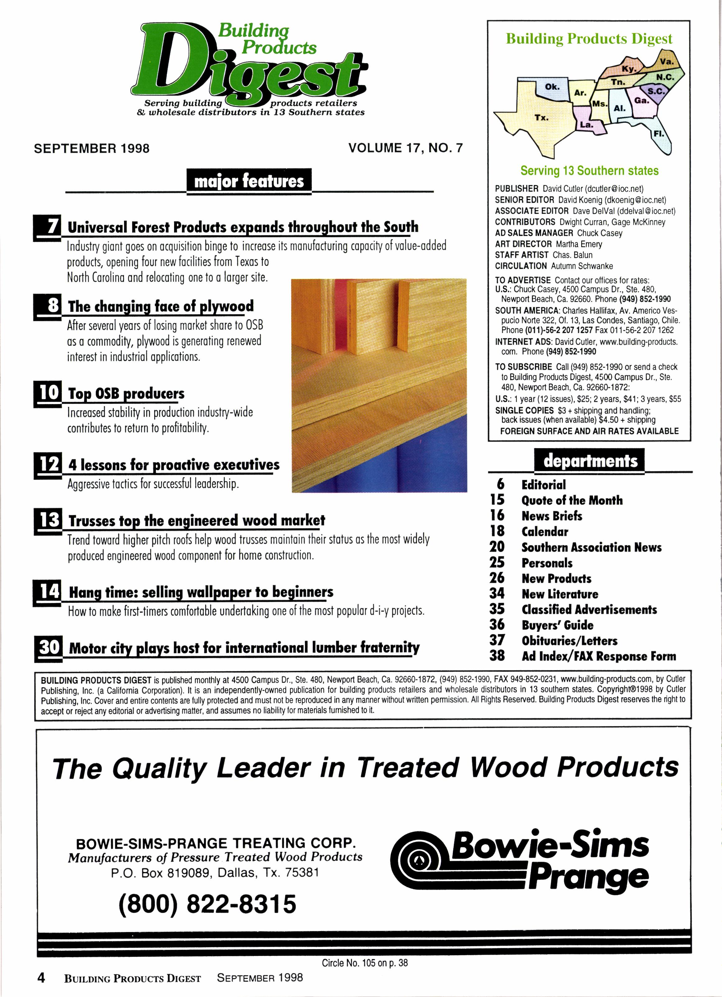 The Quality Leader in Treated Wood Products BOWIE.SIMS.PRANGE TREATING CORP. Monulocturers oJ Pressure Treated Wood Products P.O. Box 819089, Dallas, Tx. 75381 (800) 822-8315 @hf,r* Circle No. 105 on p. 38 4 Burlunc Pnooucts DIcrst SepreMaen 1998