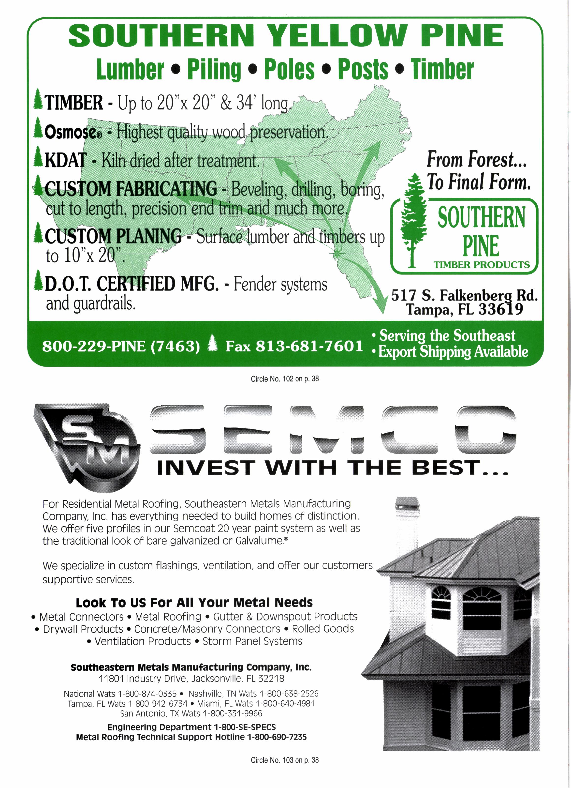 lum[er . Piling . Poles . Posts r limbet *rmnER - up to 20"x 20' &.34' long"'r': ui i : 1 ,-t. *osmoM'wood''fiieservatigr{{:,.-;: lxoRtto prec$0n SOUTHERN l,0M n length, From Forest,,, To Final Form, 517 S. Falkenbero Rd. Tampa, fl- gg0lg * to 10"x *D.o.T. MFG. - Fender svstems and guardrails. Circle No. 102 on p.38 6w ',@S@$ INV @^ ilr .u;@i@" sT___ EST WITH THE BE roD lia r@ €6& Hw/il .* .tP {5 @ # '@*