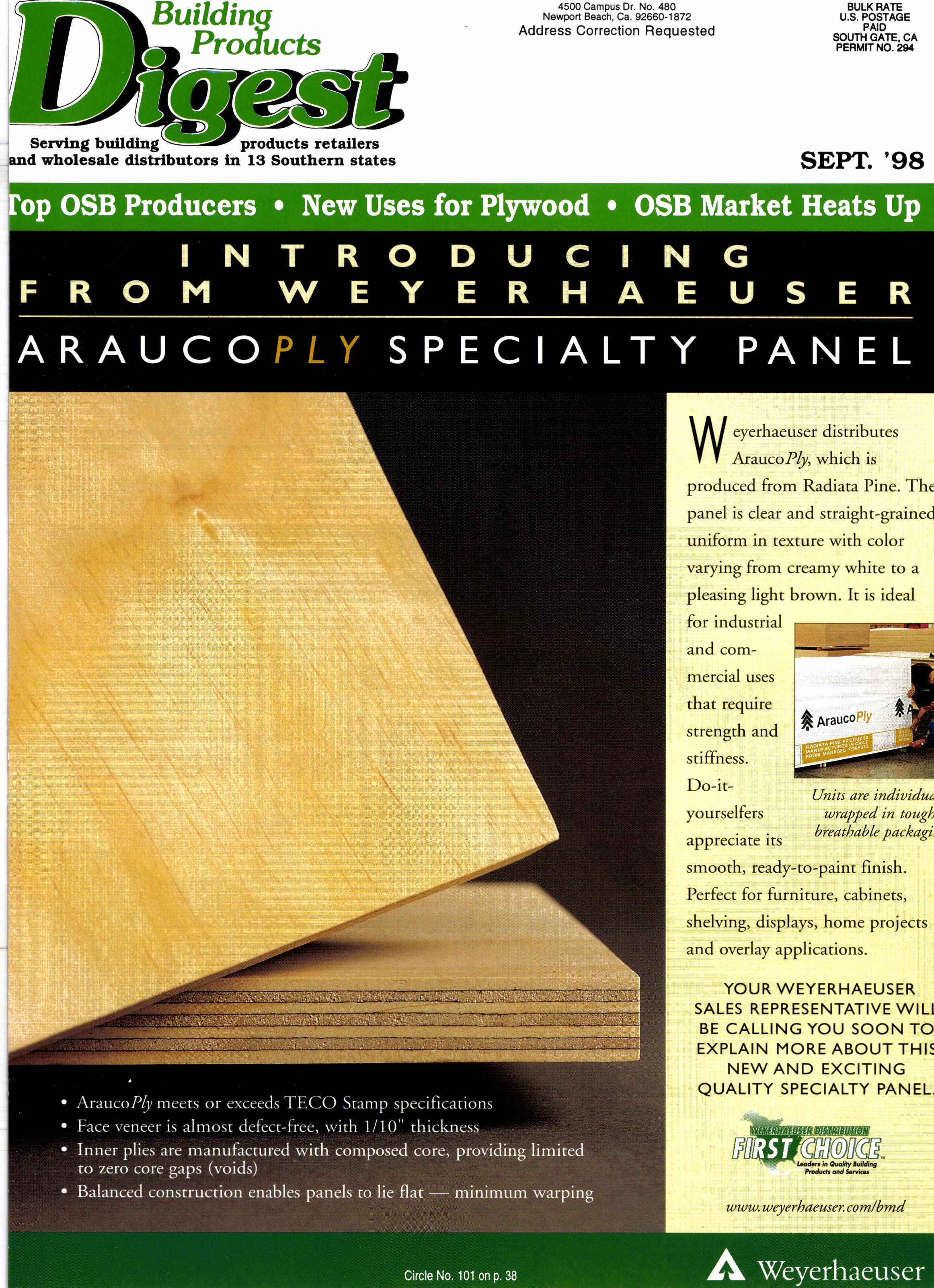 eyerhaeuser distributes AraucoPly, which is produced from Radiata Pine. The panel is clear and straight-grained uniform in texture with color varying from creamy white to a pleasing light brown. It is ideal for industrial and commercial uses that require strength and stiffness.