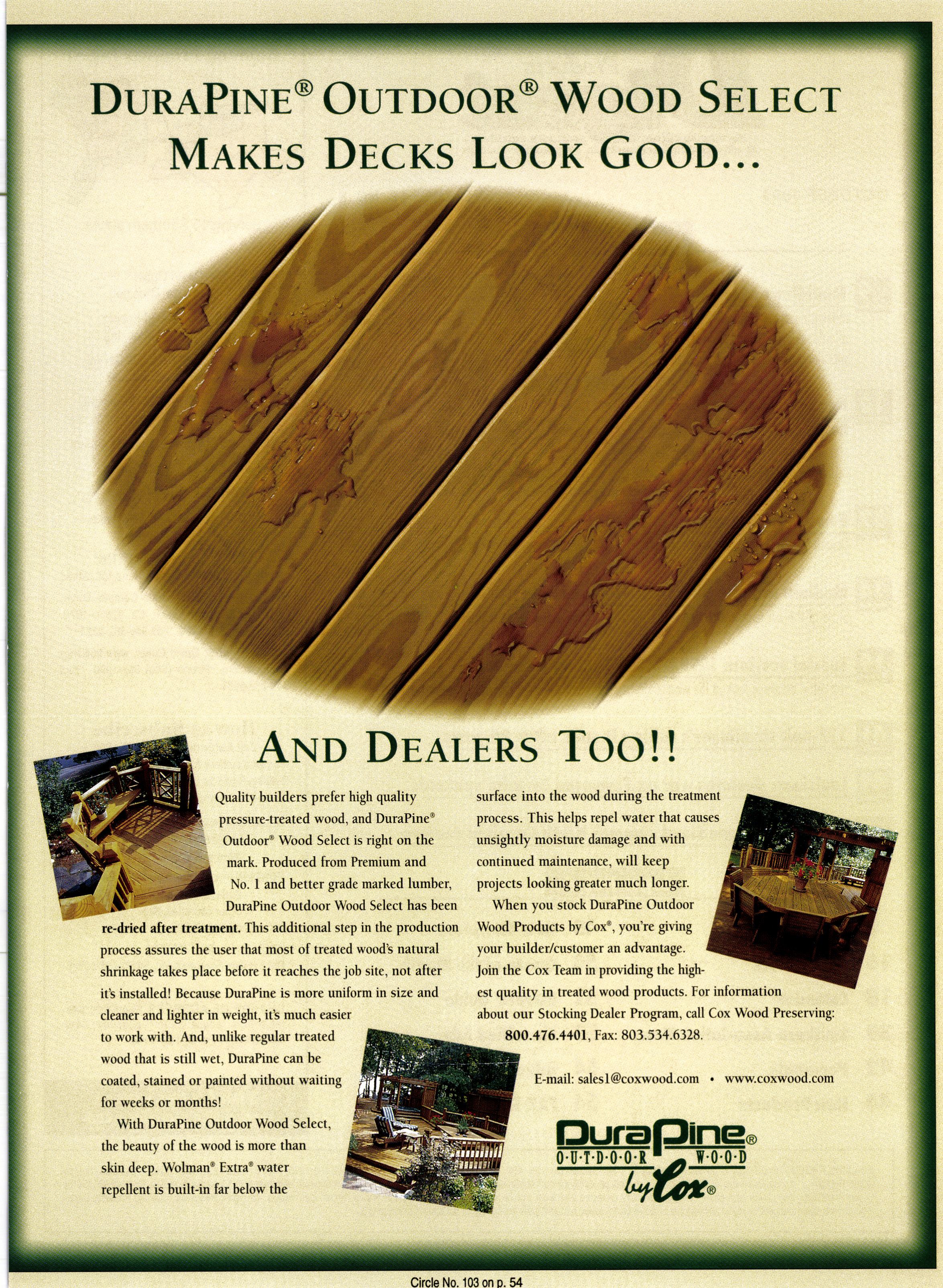 Quallty builders prefer high quality pressure-treated wood, and DuraPineu Outdoor' Wood Select is right on the mark. Produced from Premium and No. I and better grade marked lumber, DuraPine Outdoor \r\bod Select has been