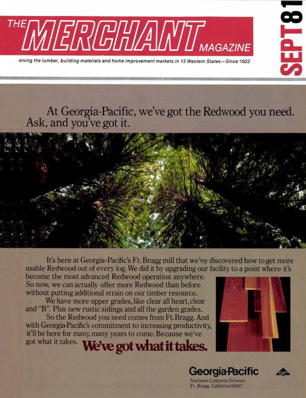 The September 1981 front cover promoted redwood from GeorgiaPacific’s mill in Fort Bragg, Ca. The facility, originally built by Union Lumber, spent more than a century as the world’s second largest redwood mill before closing in 2002.