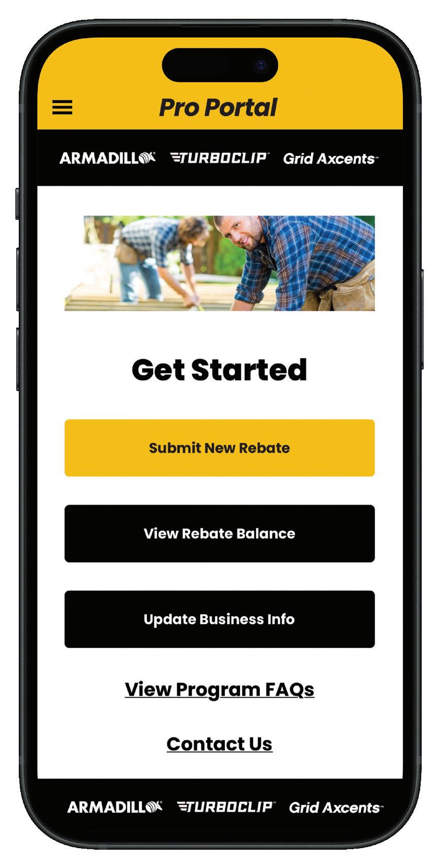 3 STEPS TO REBATE! 1. UPLOAD RECEIPT & DECK PHOTO 2. ENTER JOB SITE ADDRESS 3. CLICK SUBMIT IT’S EASY! Use it at the job site, on the go, at home or anywhere! BUILDER REBATE APP TODAY! DOWNLOAD THE SCAN THE CODE! WILL BE FEATURED ON AIRING THIS FALL ON FAST SUBMIT REBATES BACK GET CASH SELL MORE. BUILD MORE. EARN MORE. PARTNER WITH ARMADILLO