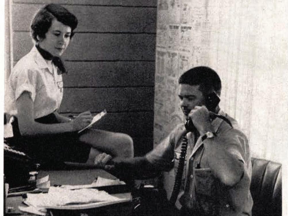 SECRETARY Carolyn Smith is ready to take dictation from VP Bishop White.