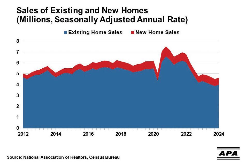 PURCHASES OF existing and new homes followed different paths in 2023. Quarterly sales of existing homes consistently fell through 2023 and totaled 4.09 million at the end of the year, down 18.7% from 2022. Higher mortgage rates certainly played a role in driving the sales decline. Also contributing was the historically small number of homes available for sale. In 2023, the number of existing homes for sale averaged 1.06 million at the end of each month, compared to an average of 1.82 million in the years 2016 to 2019.