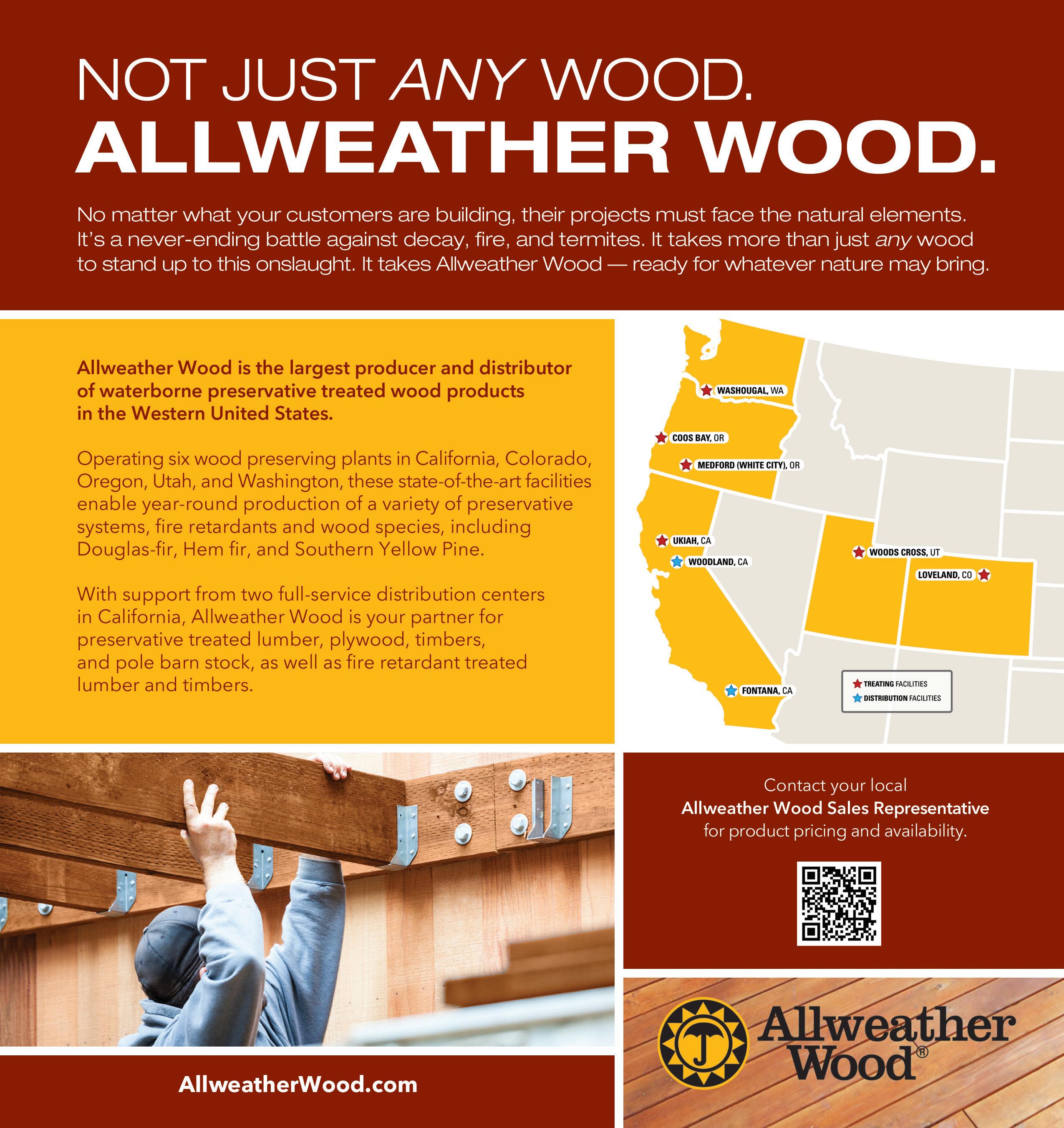 Allweather Wood is the largest waterborne preservative-treated lumber manufacturer and distributor in the western U.S., with six treating plants in California, Colorado, Oregon, Washington and Utah. Treatments include borates, CA-C, CCA, MCA and interior FRTW.