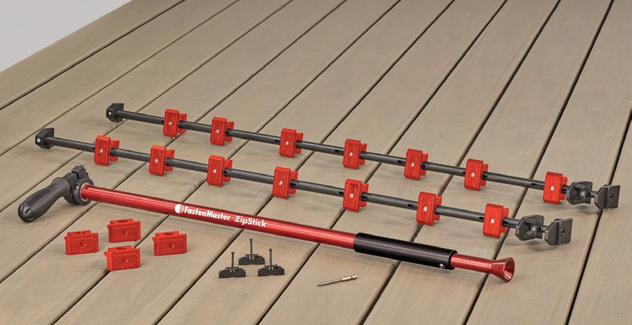 The Zip Hidden Fastening System is comprised of three integrated components: the Gapper (a spacing tool used to gap multiple boards at the same time for consistent uniform gapping without jacking or damaging the boards), ZipClip (an integrated clip and fastener that locks down grooved deck boards when installed), and ZipStick (a stand-up cordless drill attachment used to install ZipClips). ZipStick is compatible with all variable speed drills and provides pros with the option to stand and drive ZipClips.
