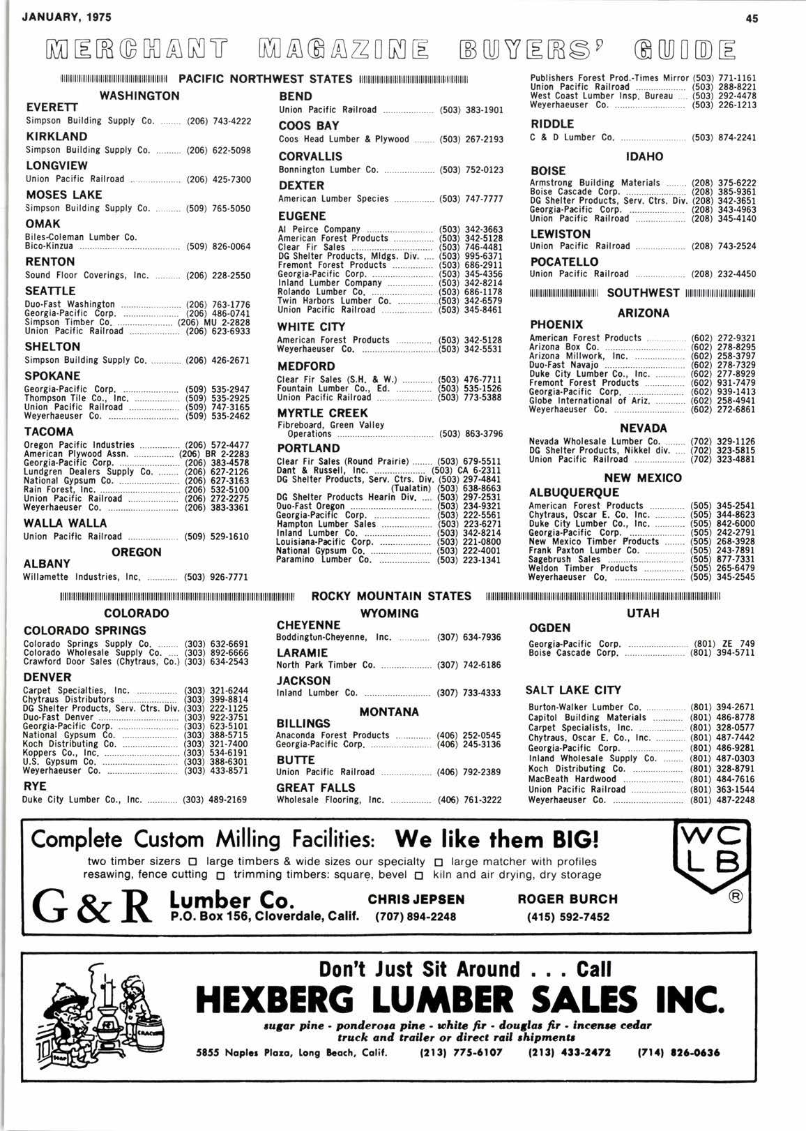 EVERETT Simpson Euilding Supply Co. ........ (206) 743-4222 KIRKLAND Simpson Building Supply Co. .,--...... (206) 622-5098 LONGVIEW Union Pacific Railroad MOSES LAKE (206) 425-7300 Simpson Building Supply Co. .......-.- (509) 765-5050 OMAK Biles4oleman Lumber Co, Bico-Kinzua RENTON (509) 826-0064 Sound Floor Coverings, Inc. (206) 228-2550 SEATTLE Duo-Fast Washington ........,-.,....-.....,. (206) 763-f776 Georgia-Pacific C0rp. .....................- (206) 4E6-074r Simpson Tinber Co. ...............-...... (206) MU 2.2828 Union Pacific Railroad (206) 623.6933 SHELTON Simpson Building Supply Co. (206) 426-2671 SPIOKANE Georgia-Pacific Corp. ............-......... (509) 535-2947 Thompson Tile Co., Inc. (509) 535-2925 Union Pacific Railroad (509) 747-3165 Weyerhaeus€r Co. (509) 535-2462 TACOMA oregon Pacific Industrios QA6) 372-4477 Amsrican Pfywood Assn. (2OS) BR 2-22t3 Georgia-Pscific Corp. (2(r) 3834578 Lundgren Deaf6rs Supply Co. (2061 627-2126 National Gypsum co. (206) 627-3r63 Rain Forest, Inc. ...........................-.... (206) 532-5lOO Union Pacific Railroad ...................- (2OG) 272-2?75 Weyerhaeuser Co. (206) 383-3361 WALI.A WALLA Union Pacillc Rallro.d (509) 529-1610 OREGON ALBANY Willamette Industries, Inc. (503) 926-7771 COLORADO COLORADO SPRINGS Colorado Springs Supply Co. (303) 632-6691 Colorado Wholesale Supply Co. .-.. (303) 892-6666 Crawford Door Sales (Chytraus; Co.) (303) 634-2543 DENVER Carpet Specialties, Inc. (303) 32f-6244 Chytraus Distfibutors ......---............. (303) 399-EEf4 DG Shelter Products, S€rv. Ctrs. Dlv. (303) 222-1125 Duo-Fast Denver (303) 922.375f G€orgia-Pacitic Corp. ..........,-...........- (303) 623-5101 National Gypsum Co. ...........-.......... (303) 388-5715 Koch Distributing C0. (303) 32f.7400 Koppers C0., Inc. ...._..._...-....-.....-...... (303) 534-6191 U.S. Gypsum Co. (303) 388.630r Weyerhaeuser Co. ...............-.......-.... (303) 433-8571 RYE Duke city Lumber co., Inc. ..........__ (303) 489.2169 BEND Union Pacific Rrilroad ...-..-....... COOS BAY Coos Head Lumber & Plywood CORVALLIS Bonnington Lumber Co. .....-,...-.. DEXTER American Lumber Species JANUARY, 1975 45 ROCKY MOUNTAIN STATES WYOMING Publlshers Forest Prod.-Tlmes Mirror (503) 771-1161 Union Pacific Railroad (503) 28E-E221 West Coast Lumber Insp. Bureau (503\ 292-4478 Weyerhaeuser Co. ............-..........,-... (503) 226-1213 RIDDLE c & D Lumber co. ._...,..._................ (503) 874-2241 IDAHO BOISE Armstrong BuildinS Materials (208) 375-6222 Boise cescade corp, (20t) 3t5-9361 DG Shelter Products. Serv. Ctrs. Div. (208) 342.3651 Georgia-Pacific Corp. (206) 343-4963 Union Pacific Railroad (208) 345-4140 LEWISTON Union Pacific Railroad FOCATELTO Union Pacific Railroad ilililillil1ilililililil1ilr souTHwEsT ilililililtrililililililililIt1 ARIZONA PHOENIX American Forest Products Arirona Bor Co. .-................. Arirona Millwork, Inc. Duo-Fast Navaio Duko City Lumber Co., Inc. Fremont Forest Products Georgia-Pacific Corp, Globe International of Ariz. Weyerhaeuse. Co. NEVADA Nevada Wholesale Lumber Co. (702) 329.1f26 DG Shelter Products, tlikkel div. ...- (702) 323-5Ef5 Union Pacific Rallroad ..........-..-...... (702) 323-48E1 NEW MEXICO ALBUQUERQUE UTAH (503) 383-1901 (503) 267.2r93 (s03) 752-0123 (503) 747-7777 (208) 743-2524 (208) 232-4450 (602) (602) (602) (602) (602) (602) (602) (602) (602) MEDFORD Cloar Fir Sales (S.H. & W.) (503) 476-7711 Fountain Lumbcr Co., Ed. .-.........-.. (503) 535-1526 Union Pacific Reilroad (503) 773-53E8 MYRTLE CREEK Fibreboerd, Green Valleyoperations ..-..-.. (503) 863-3796 PORTLAND Clo.r Fir Sales (Round Prairi.) .....-.. (503) 679-55f1 Dent & Russell, Inc. (503) CA 6-231f DG Shefter Products, Sery. Ctrs. Div, (503) 2974|d41 ourt.tin) (503) 638-1663 DG Shelter Products Heerin Diy. .-.. (503) 297-2531 ouo-Fast or{on (503) 234-9321 Georgia.Prcif lc Cofp. (503) 222-5561 Hampton Lumbsr SllGs (503) 223-627 | Inland Lumber Co. ............-............. (503) 342-8214 Louisifis-P*ific Corp. (503) 22f-0E00 ]{atlonrl Gypsum Co. ..-.....-............... (503) 222-4001 Parsmino Lumber Co. (503) 223-f341 272-9321 278-8295 258-3797 278-7329 277-8929 931-7479 939-t413 258-4941 272-686r CHEYENNE Eoddingtun-Choyenno, Inc. LARAMIE North Park Timber Co. JACKSON lnland Lumber Co. OGDEN (307) 634-7936 GeorgilP.citic Corp. Soise Cescade Corp. (307) 7426186 (307) 7334333 SALT LAKE CITY (801) ZE 749 (E0r) 394-57r1 (E0r) 394-267r Cagitol Building Materiels .-....-..... (801) 486-E77E Carpet Specielists, Inc. ..........,....... (80f) 328-0577 Chytrars, Oscar E. Co., Inc. .-.......,.. (801) 487-7442 Georgie.Pacitlc Corp. (Eof) rU6-9281 hland wholesale supply co. ....._.. (Eol) 487-0303 Koch Distributin8 Co. (801) 328.8791 Mec8eath Hardwood (801) 484-7616 Union Pacific Railroad (80f) 363-f544 Weyerhaeuser Co. (801) 487-2248 MONTANA BILLINGS Anaconda Forest Products .............. (406) 252-0545 Georgia-Pecitlc Corp. ........-.....-.-,...... (406) 245-3136 BUTTE Union Pacific Railroad ..................-. (4OO) 792-2389 GREAT FALLS Wholesafe Ffooring, Inc. (406') 761-3222 Complete Custom Milling Facilities' We like them BlGt w .L G ec R LH.qlFff "Fo"o;.",", .",n. ",Tl',t i.=.f.=,* two timber sizers O large timbers & wide sizes our specialty r€sawing, fence cutting tr trimming timbers: squarg, bevel O c B I O large matcher with profiles kiln and air drying, dry storage ROGER BURCH ('015) 592-74s2 Don't Just Sit Around . . . Gall HEXBERG TUMBER SALES INC. rujat pinc - pndetota pta,c - uhtu fv - douda fw - lnccrlrc cdat truck and tr.ollct ot dtrcct mil rhlpmcnu 5t55 Noplo ?loro, long looch. Colif. l2l3l tt5-610t l2l3l 1rr-2a7, Itlal t2a{6t6