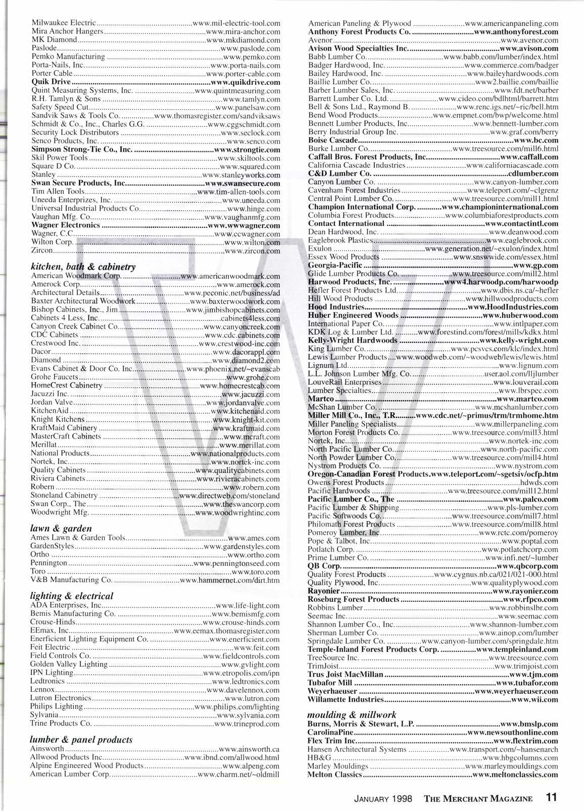 BILLINGS Georgia-Pacific Corp ......(800) 83C7370 COLOBADO DENVER All-Coast Foresl Products....(8cn) 332-8977 (303) 761-9882 Capilallumberoo. .......(303) 321-4003 Georgia-Pacific Cory ......(800) 8307370 Prim€Sourc€............ ......(303) 227-9000 Tdmco Millwofi....... ......(303) 371-8888 Weyefiaeuse. C0...(ln Co.) (800) 332-8291 (303) 433-8571 GRAND JUNCTION Trimco Millwoft....... ......(970) 434-0800 UTAH SALT LAKE CITY Capilal Lumberco.. ......(801) 484-2007 Cleadield Conveyors...........(800) 453-2446 (801) 77$131 1 Diablo Timber.......... ......(801) 76&8519 Dimensions, Inc....... ......(800) 648-5065 Forest Producls Sales .........(800) 666-2467 (801) 262-6428 Georgia-Paciliccorp ......(800) 83G7370 MacBeath Hardwood .....(801) 484-7616 Trimco Millwork....... ......(801) 467.0077 Utah Wmd Preserving.........(800) 666-2467 (801) 295-9449 Weyerhaeuser C0................(800) 283-9663 (801) 972-5525 IDAHO BOISE Boise Cascade Corp ......(800) 228-0815 Georgia-Pacific Corp ......(800) 83S7370 0.8. C0rp................ ......(208) 756-4248 Tdmco Millwort (Boise)..................................(208) 336-9000 Tdmco Millwork (ldaho Falls) ...........,.............(208) 528-3069 WeyefiaeuserCo... ......(800) 221-3064 COEUR D'ALENE ldaho Cedar Sales (Troy)...............................(208) 835-2161 Millriver Architectural Hardwoods...................(208) 762-9663 Weyerhaeuser C0.................(800) 221-3064 (208) 362-5261 MONTANA c MAIII OFFICE & OISNIBUIIOII YAfiD: SAN FRANCISCO, CA. (800) 233-0782 (41s1 U7 -0782 FAX 415-647-7766 E-mail macbeath@worldnel.att.nel ANY SALT LAKE CITY. UT. (800) 225-3743 (801) 484-7616 FAX 801 -484-7633 [NERE E 9@URGE @F RDW@@D9 ' RARE EXOTIC HARDWOOD TEAK. BOCOTE 'ROSEWOOD' EBONY ZEBRAWOOD 'crxurxrMAHOGANY. NORTHERN RED OAK 'INDIANAWHITE OAK EATTERN rucrWAINUT r HARDwooD PLYWOODS ' xrnpwooDMOUtDlNGS 'xrnowoopVENEER MONTEBELLO,CA. EDINBURGH, IN. (800)325-2170 (213)723-3301 ConcentrationYard&DryKilns FAX213-888-1291 (800)322-9743(812)526-9743 FAX 81 2-526-6032 OMP BERKELEY, CA. (51 0) 843-4390 FM 510-843-9378 LTL, TL, Mixed TL & Container Shipments Our Specialty httpJ flww.macbeath.com Circle No. 142 on p.46 Jnruuenv 1998 THr MrncHlxr Mlclzlxr 45