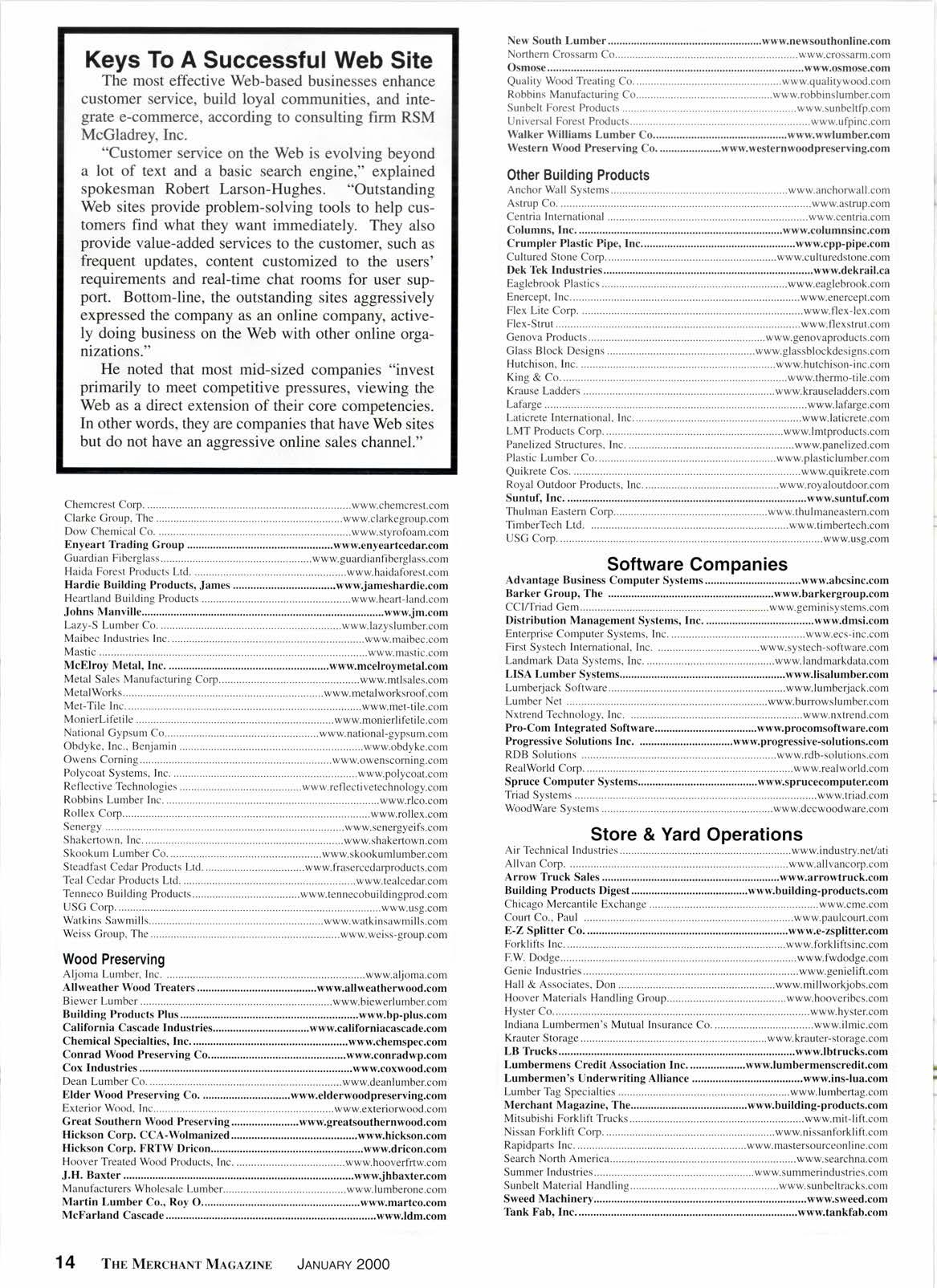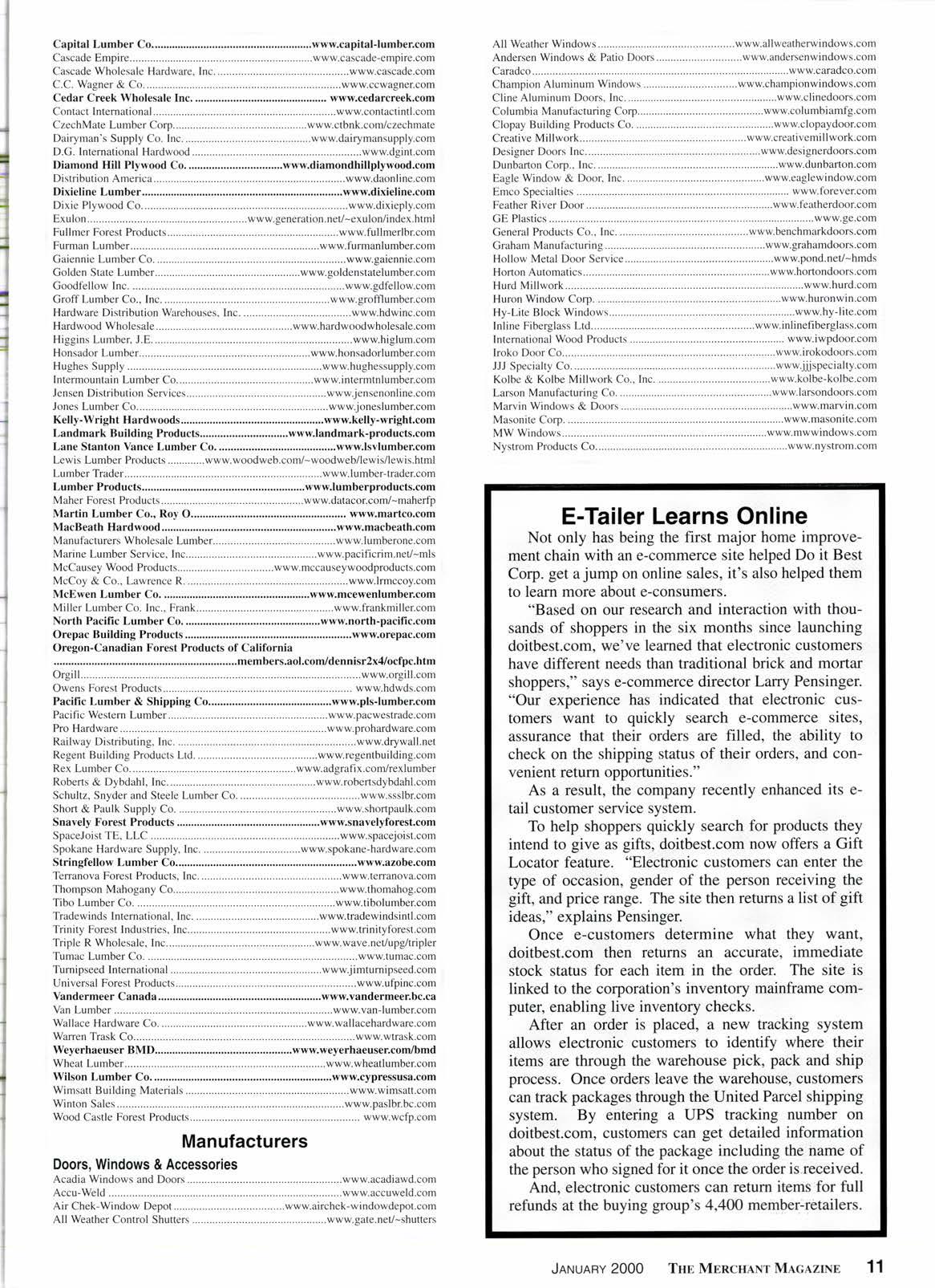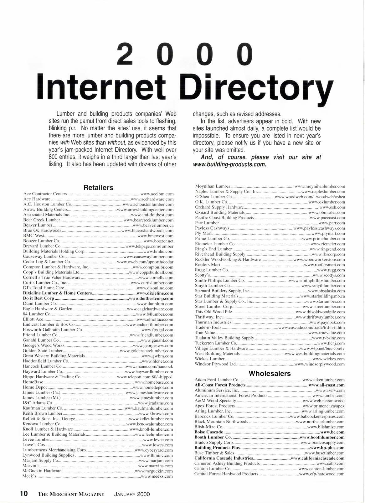 Lumber and building products companies' Web sites run the gamut from direct sales tools to flashing, blinking p.r. No matter the sites' use, it seems that there are more lumber and building products companies wth Web sites than without, as evidenced by this yea/s jam-packed Internet Directory. With well over 800 entries, it weighs in a third larger than last year's listing. lt also has been updated with dozens of other