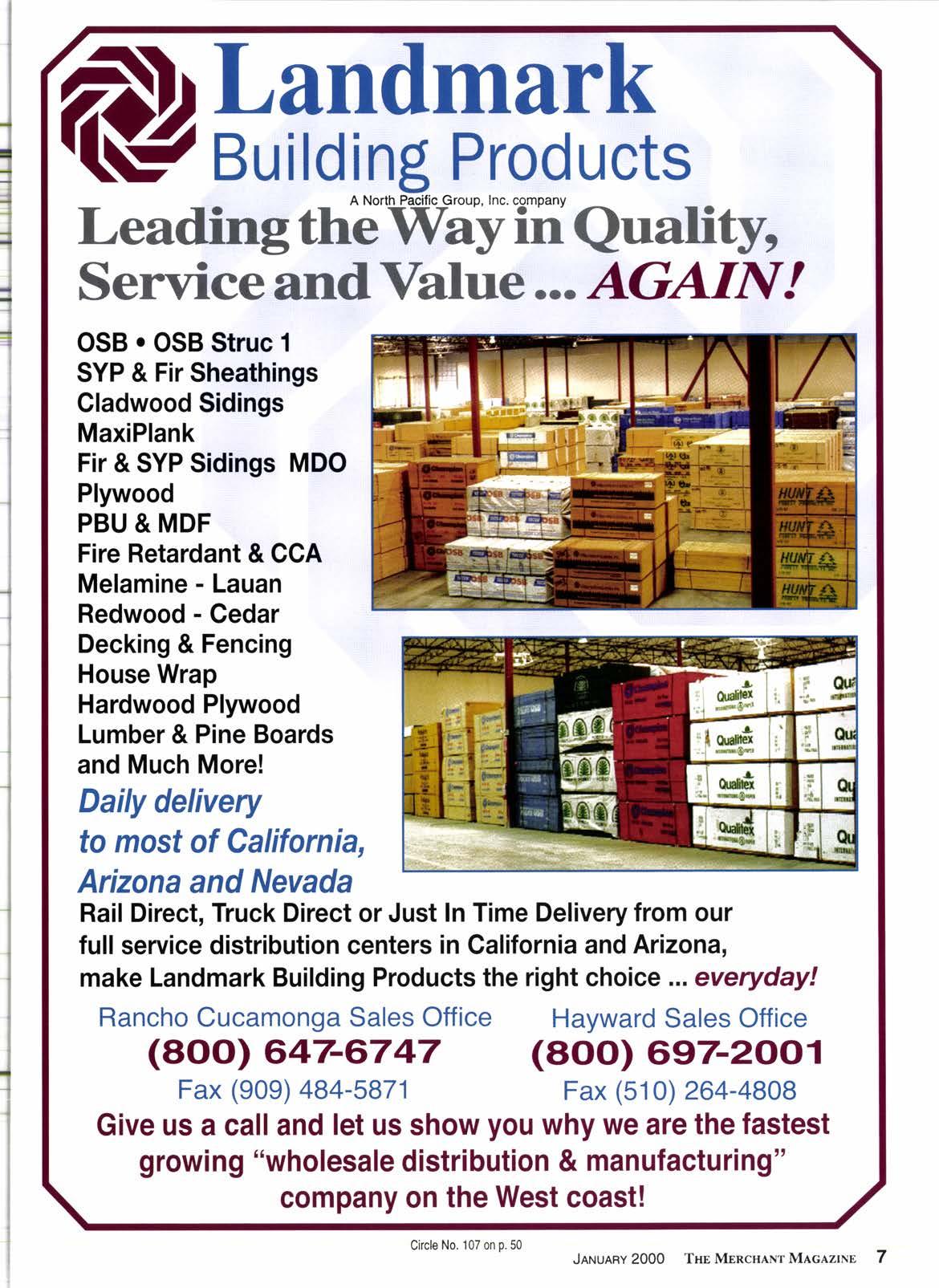 ill. f crrarlnacrrb -r- --. \II z.-7 tlST Building Products Leadins thd'WHi fii Quali ty, Senrice and Valu€ ... lGrlIN ! OSB . OSB Struc 1 SYP & Fir Sheathings Gladwood Sidings MaxiPlank Fir & SYP Sidings MDO Plywood PBU & MDF Fire Retardant & CCA Melamine - Lauan Redwood - Cedar Decking & Fencing House Wrap Hardwood Plywood Lumber & Pine Boards and Much More! Daily delivery to most of California, Arizona and Nevada Rail Direct, Truck Direct or Just In Time Delivery from our full service distribution centers in California and Arizona, make Landmark Building Products the right choice ... everyday! Rancho Cucamonga Sales Office Hayward Sales Office (8OO) 647-6747 (8OO) 6.97-2()()1 Fax (909) 484-5871 Fax (51 0) 264-4808 Give us a call and let us show you why we are the fastest growing "wholesale distribution & manufacturing" company on the West coast! circle No' 107 on p' 50 Jaruumv 2000 THB MrncHlxr: MlcnzrNs 7