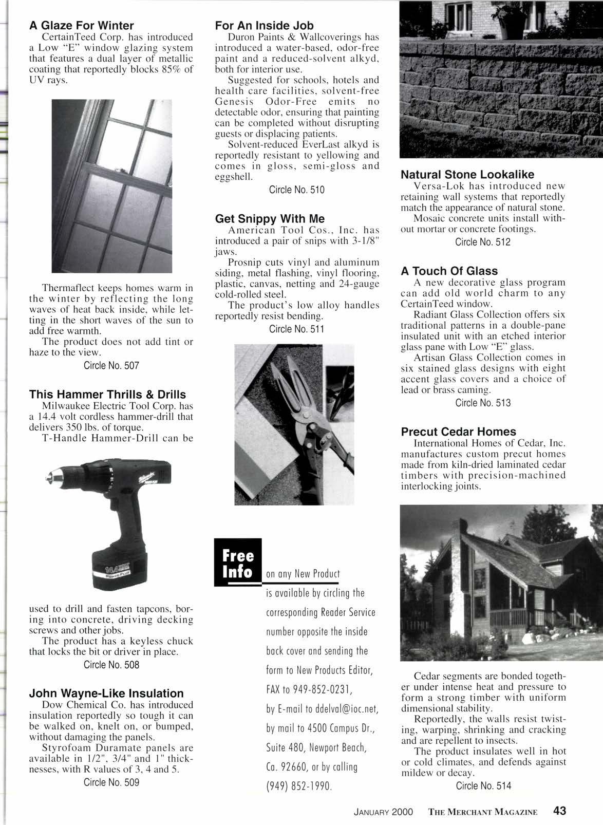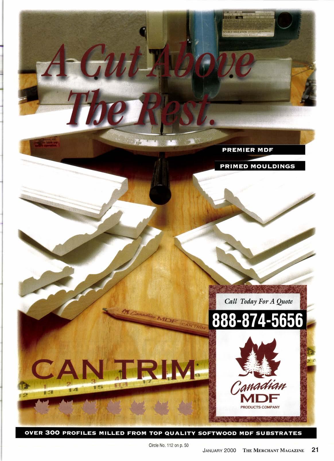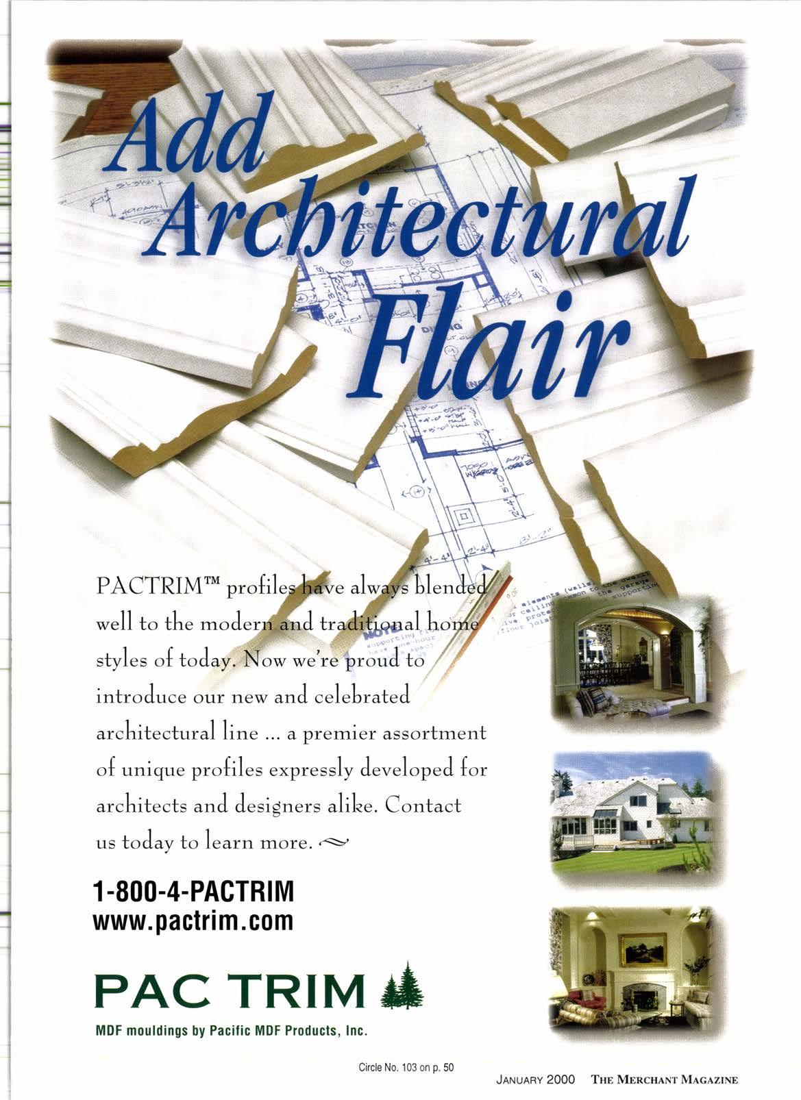 I = I I : ! tfryrul@wr ,Aq{Fry@ **+'-oc PACTRIM* p'ofll " rl- 1". -"ll to the .rroJ", ul h"' tr styles "f t"J ' r*rff I ow we're broud to introJuce our new unJ ""l"brut"J ur"hit""tural litr" ... a premier assortment o{.rniqrr" pro{il"s expressly J",r"lop"J {o. ur.hit".ts anJ J"rign".r rliL". Contact us toJay to learn more. .:/ 1-800-4-PACTRtM www.pactrim.G0m PAC TRIM* MDF mouldings by Pacific MDF Products, InG. Circle No. 103 on p. 50 Jnnunnv 2000 Tne MrncHenr Meclzrxn