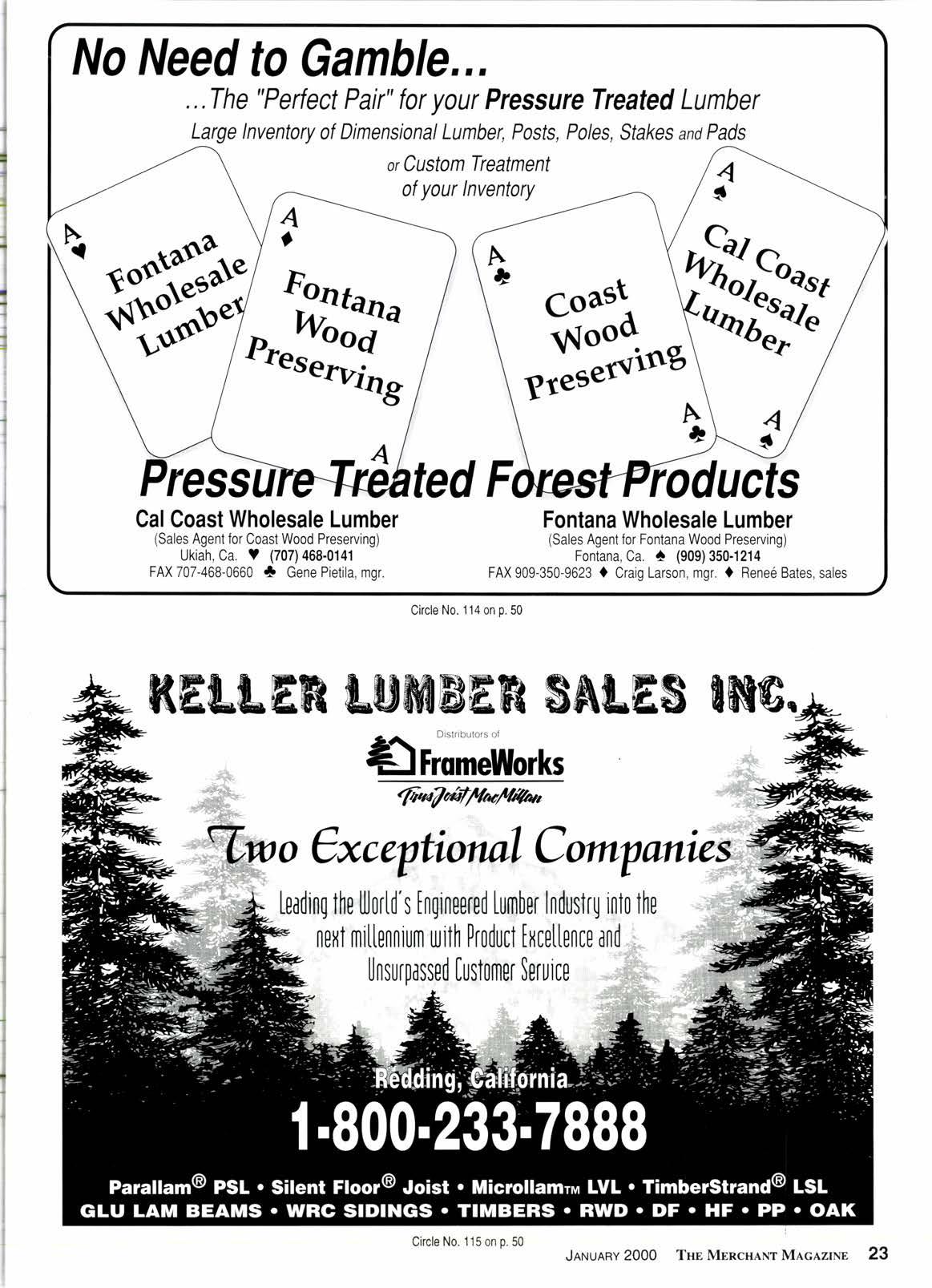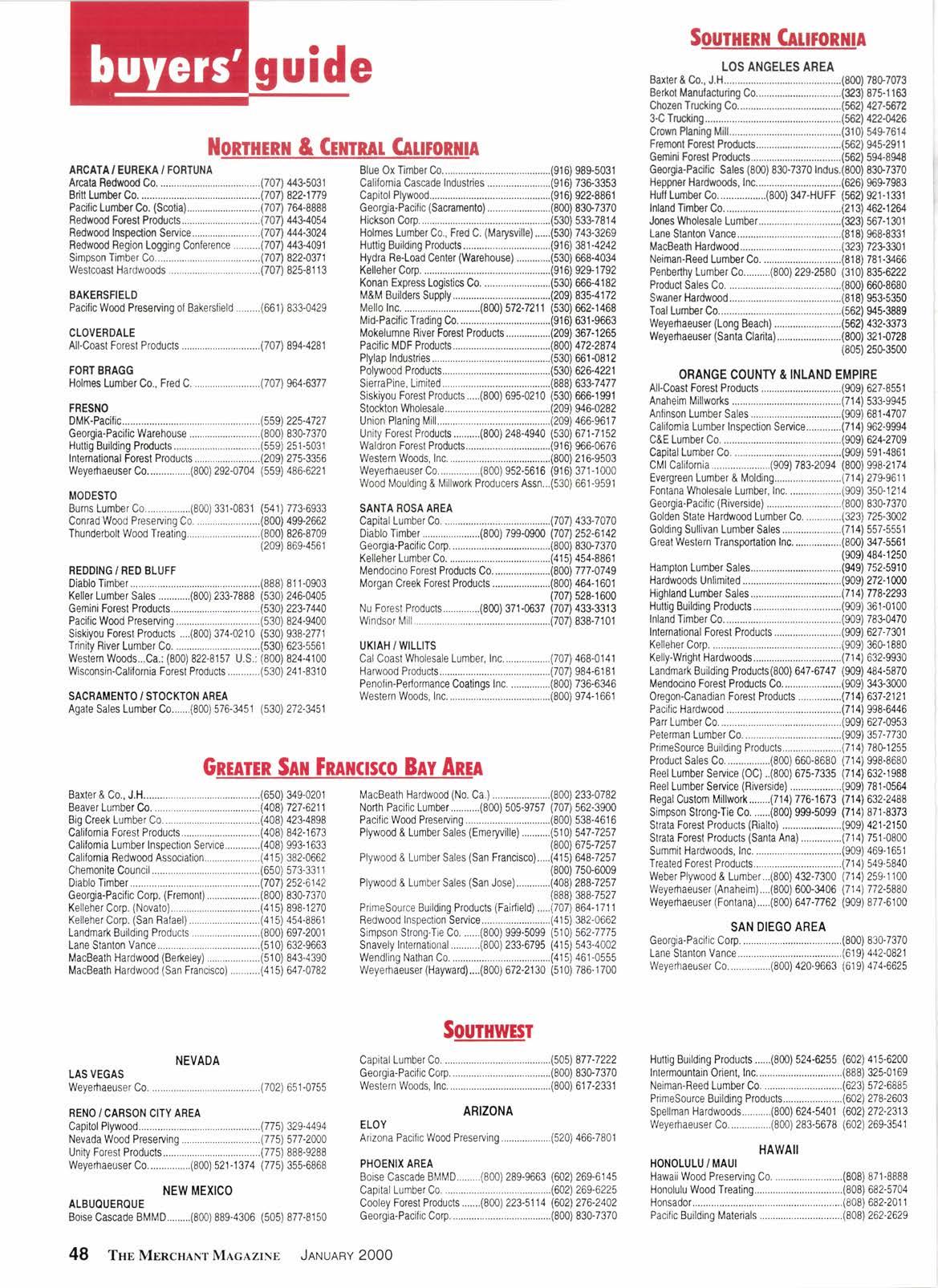 Baxter&C0., J.H..... ......(800) 7807073 Berkot Manulacturing C0................................(343) 875.1 163 Chozen Trucking Co ....,(fi2l.427-fi72 3-C Truckin9............ ....,(ffi21422.0426 Crown Planing Mill... ......(310) 5497614 Fremonl Forest Products................................(562) 945-291 1 Geminj Forest Products .(562) 594.8948 Goorgia-Pacific Sales (800) 830-7370 Indus.(800) 83G7370 Heppnor Hardwoods, Inc................................(626) 9697983 Huff Lumber C,o..................(800) 347-HUFF (562) 921-1331 lnland Timber C0..... ......(2131 462-1264 Jones Wholesale 1umber...............................(323) 567-1301 Lane Slanton Vance ......(818) 968-83i)l MacBeath Hardwood .....(323) 72$3301 Neiman-Reed Lumber Co. ........,....................(81 8) 781.3466 Penberthy Lumber C0..........(8m) 229-2580 (310) 835-6222 Producl Sales Co. .........(800) 66G8680 Swanerllard{ood... ......(818) 95}5350 Toal Lumber C,o....... ......{562) 945-3889 Weyeftaeuser (Long Beach).........................(562) 432-31]73 Weyerhaeuser (Santa Clarita)........................(800) 321-0728 (8os) 25G3500 ORANGE COUNTY & INLAND EMPIRE All-coast Forest Products ..............................(909) 627-8551 Anaheim Millworks.. ......(714) 533-9945 Anfinson Lumber Sales ..................................(909) 681-4707 Calilomia Lumber Inspection Service.............(714) 962-9994 C&E Lumber Co. ......(909) 62+2709 Capital Lumber Co. .......(909) 591-4861 CMI Ca|il0rnia .....................(909) 783-2094 (800) 998-2174 Evergreen Lumber & M01din9.........................(71 4) 279-961 1 Fontana Wholesale Lumber, Inc. ...................(909) 35&1214 Georgia-Pacif ic (Riverside) ............................(800) 83$7370 Golden Slate Hardwood Lumber Co. .............(323) 725-3O02 Golding Sullivan Lumber Sa|es......................(714) 557-5551 Greal West€rn Transporlation Inc..................(800) 347-5561 (909) 484-1250 Hamplon Lumber Sa|es..................................(949) 752-5910 Hardwoods Unlimiled .....................................(909) 272-1000 Highland Lumb€r Sa|es..........-......................17 1 q n 8-2293 Hullig Building Products.................................(909) 361 -0100 lnland Timber C0..... ......(909) 7890470 lnternalional Forest Products.........................(909) 627-7301 Kelleher Corp. .............,.(909) 36G1880 Kelly-Wright Hardwoods.................................(71 4) 632-9930 Landmark Building Products(800) 647-6747 (909) 484-5870 Mendocino Forest Products C0......................(909) 343-3000 Oregon-Canadian Foresl Products ................1714]' 637-2121 Pacllic Hardwood.... ......(714) 998-6446 Parr Lumber Co....... ......(909) 627-0953 Pelerman Lumber C0.....................................(909) 357-7730 PrimeSource Building Produc1s......................(714) 78S1255 Product Sales C0.................(800) 660-8680 (714) 998-8680 Feel Lumber Seruice (OC)..(800) 675-7335 (714) 632-1988 Reel Lumber Service (Riverside) ...................(909) 781-0564 Regal Custom Millwork..,.....(714) 776-1673 (7 141 632-2488 Simpson Strong-Tie Co. ......(8C10) 999-5099 (714) 871-8373 Strata Forest Products (Riallo) ......................(909) 421-2150 strata Forest Products (santa Ana) ...............(714) 751-0800 Summit Hardwoods, Inc. ................................(909) 469-1 651 Treated Forest Produc|s.................................(71 4) 549-5840 Weber Plywood & Lumber...(800) 432-7300 (714) 259-1 100 Weyerhaeuser (Anaheim)....(800) 60G3406 (714) 772-5880 Weyefi aeuser (Fontana).....(800) 647-762 (909) 877-6100 SAN DIEGO AREA Georgia-Pacific Corp ......(800) 830-7370 Lane Stanton Vance .....,(619) 442-0821 Weyerhaeuser C0................(800) 420-9663 (619) 474-6625 Huttig Building Products......(800) 524-6255 (602) 415-6200 Inlermountain Orient, Inc................................(888) 325-01 69 Neiman-Reed Lumb€r C0. ............,................(623) 572-6885 Primesource Building Products......................(602) 278-2603 Spellman Hardwoods...........(800) 624-5401 (602) 27 2-231 3 Weyerhaeuser C0....,...........(800) 283-5678 (602) 269-3541 HAWAII HONOLULU / MAUI Hawaii Wood Preserving Co. .........................(808) 871-8888 Honolulu Wood Treating.................................(808) 682-5704 H0nsad0r................. ..,...{808) 682-2011 Pacilic Building Materials ...............................(8081 262-2629 LOS ANGELES AREA Weslcoasl Hardwoods ........, BAKERSFIELD ....(707)