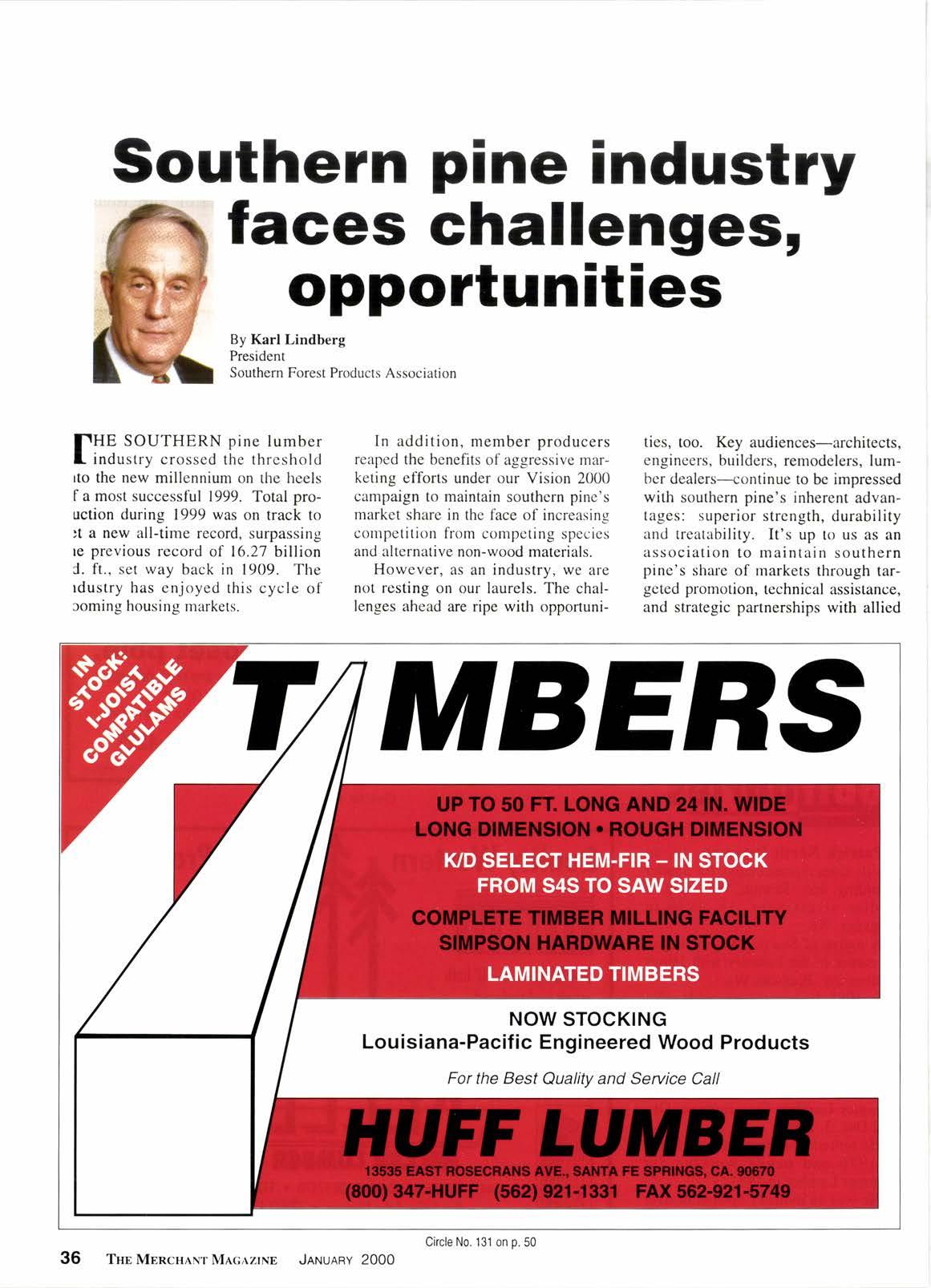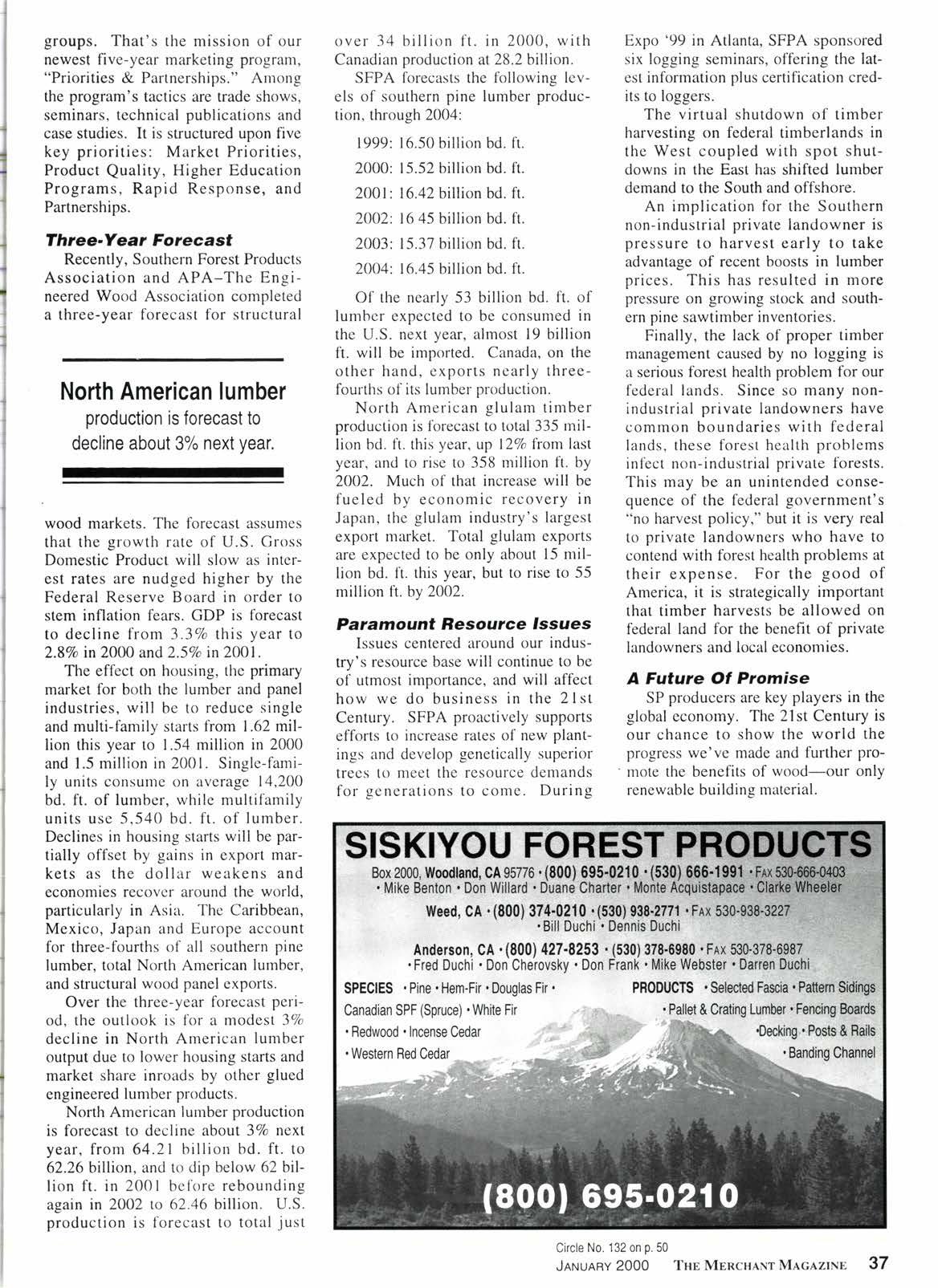 us (see story beginning page 36) that the previous record production of 16.27 billion bd. ft. will be nicely outpaced by an estimated new production record last year of 16.50 billion. Their forecasts show 2001, 2002 and 2004 all breaking the old record. What an amazing accomplishment. So much for America running out of wood.