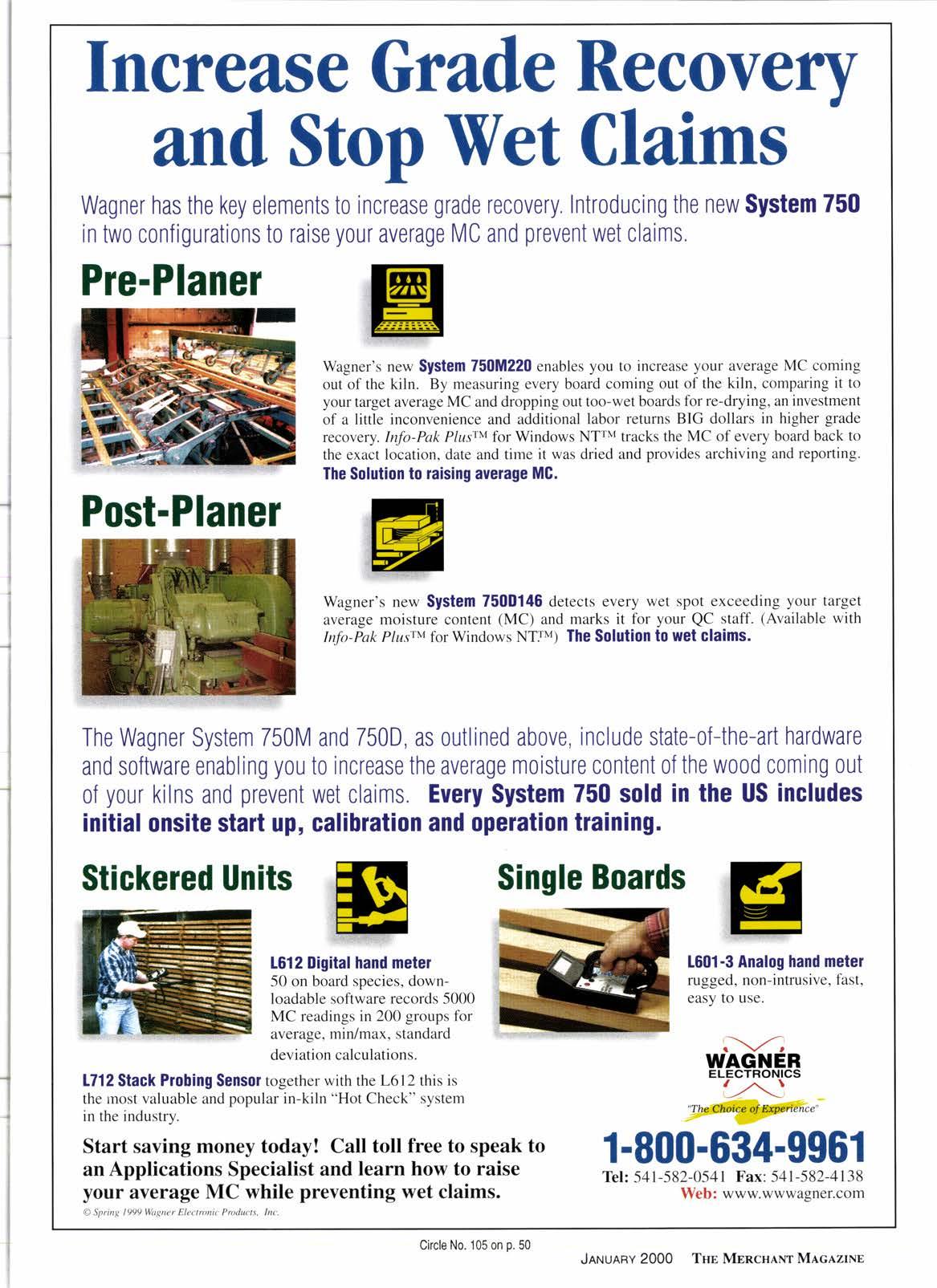 Wagner's new System 750M220 enables you to increase your average MC coming out of the kiln. By measuring every board coming out of the kiln, comparing it to your target average MC and dropping out too-wet boards for re-drying, an investment of a little inconvenience and additional labor retums BIG dollars in higher grade recovery. Info-Pak PlusrM for Windows NTrM tracks the MC of every board back to the exact location, date and time it was dried and provides archiving and reporting. Ihe Solution to raising average MG.