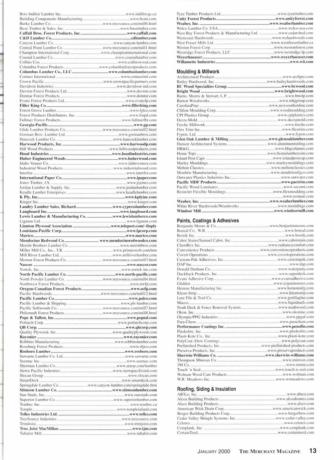 777-8134 693-0057 835-8561 729-9663 ROSEBURG Bois€ Cascade CorD Boise Cascad€ BMMD {Boise)....................., Boise Cascade BMMD {ldaho Fallsl ............, Fillsr Kino .......................................:............. Georoia-Pacific Coro Hoff Forest Pr0ductb............(877) 446-3030 WASHINGTON FERNDALE Allweather Wood Treaters..............................(800) 637.0992 486-7477 779-5077 998-2174 83G7370 681-744 941-2600 735-5780 251 -51 51 426-8430 575-0590 292-5000 435.6630 472-7714 8s4-3s50 924-23/.5 83S7370 687-041 1 426.8430 74&841 1 689.7950 461-7709 759-5909 773-8474 77$3696 471 -8891 McMINNVILLE / CoRVALLIS / SALEM Mary's River Lumber Co. .....{8Cn) 523-2052 (5411 752-0122 Roval Pacilic Industries ............,.....................(5031 434.5450 willamette lndustdes (Albany)........................(5411 926-7771 NORTH BEND Conrad Wood Preserving...............................(541 ) 75e2595 Georoia-Pacilic C0rD......................................(800) Lumb-er Products .................(8m) 759-5960 (5411 McFarland Cascade.......................................{800) Rosboro Lumber Co - .-.......(541) Seneca Sawmill Co. .......................................(541) Weyerhaeuser Co................(800) 742-01 84 (541) MEOFORO / GRANTS PASS Allweaher Wood Treaters..............................(800) Hunio Buildin0 Products.................................(541 ) Lumder Pr0dricts .................(800) 753-3696 (5411 Waldron Forest Products.......,........................(541) Lumber Producls .................(800) 888-961 I O.B. Coro. Weyefi asuser C0................(800) 221-3064 COEUR D'ALENE Braided Accents...... .......(208) 762-9663 ldaho Forest Industries...................................(208) 765-1 41 4 Intermounlain orient. lnc. UTAH SALT LAKE CITY All-coast Forest Producls....(877) 263-7848 Boise Cascade BMMD ......,..............,............. Capital Lumber Co. Forest Products Sales .........(800) 666-2467 Georoia-Pacilic CorD Lumb-er Pr0ducts .................(8m) 388-9393 MacBeath Hardwood...................................... Utah Wood Preservino.........(800) 666-2467 weyefi aeuser Co.....:.........(8001 283-9663 801 801 801 801 800 801 801 801 801 228{815 38+7700 522-6564 sl7-31&4 830-7370 888-0091 5324446 33&391 1 756-4248 %2-5261 v/f,-d$J 973.3943 484-2m7 262-6428 83S7370 972-93S)3 484-7616 295-9449 3 I (-)JZA SPOKANE Boise Cascads BMMD (Spokane)..................(509) 928-7650 Boise Cascade BMMD (Yakima)....................{509) 453-0305 Colville Indian Precision Pine Co. (Omak).....(509) 826-5927 Georoia-Pacific CoD . ............................1800) 8307370 Huttid Buildino Products.................................15091 924-8S57 Lumder Pr0dricts .................(800) 926-8231 i5091 928-8200 weyerhasuser co. ...............(sogl sze-t+tq VANCOUVEF 503 503 503 800 800 800 503 503 503 503 503 503 503 8001 503', CUJ 2274219 22G0600 224-7317 83S7370 285-4393 261-6030 248-7104 223-7571 297-7691 620-141 1 620-5847 692-3322 287-9874 ,145-9758 397.4469 224-3920 64m611 COLORADO DENVEH All-coast Forest Products....(800) 332-8977 (303) 761-9882 Boise Cascade 8MM0...................................(303) 289-3271 Capital LumberCo.. .......(303) 28&3700 Georqia-Pacilic Corp ......(800) 83G7370 PrimdSource Buildin0 Produc1s......................13031 227-9000 weyeft aeuser c0...:...........(800) 332-8291 (3031 4338571 GRAND JUNCTION Boise Cascade BMMD ...................................(970) 24+8301 MONTANA BILLINGS Allweather Wood